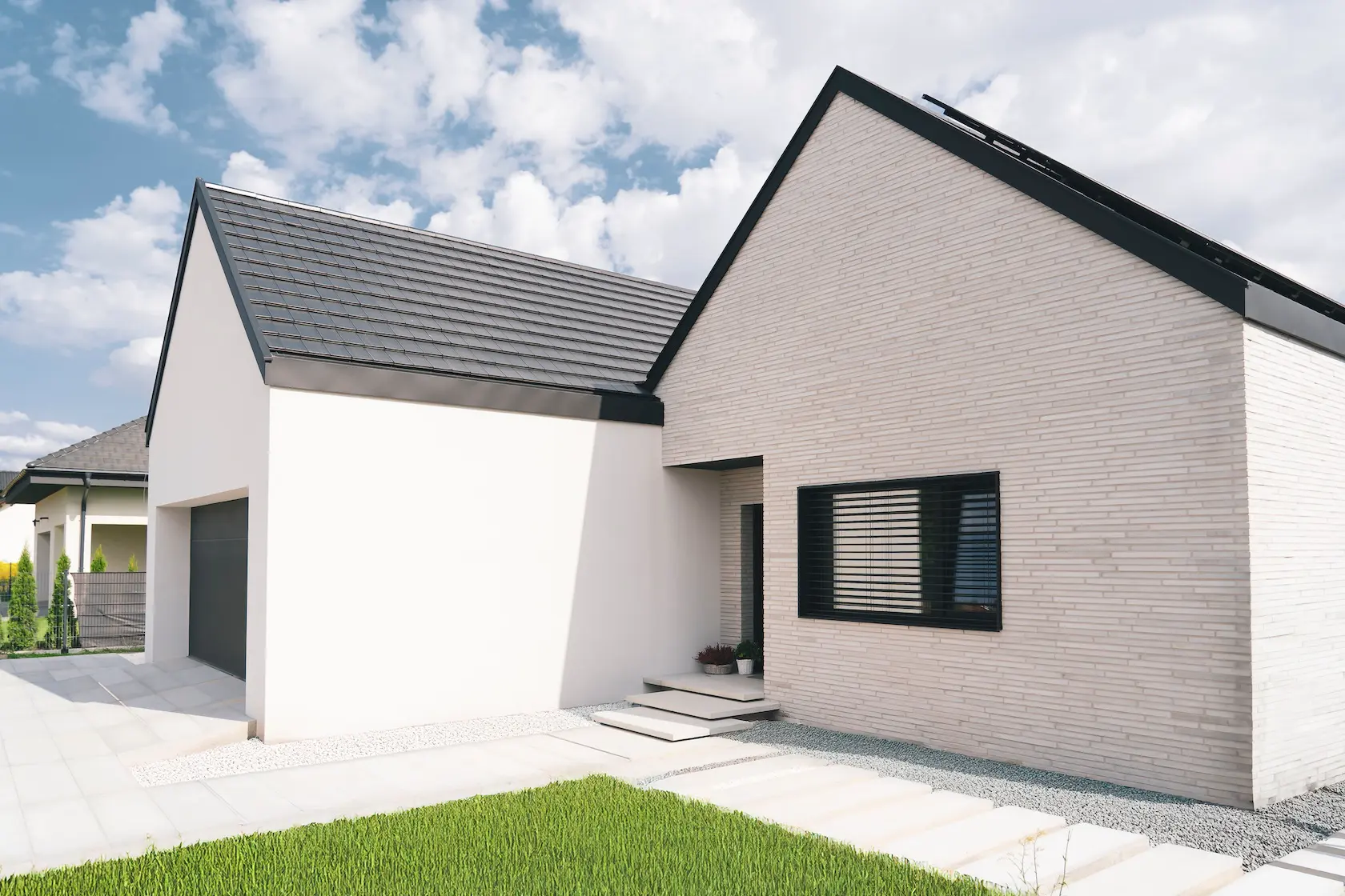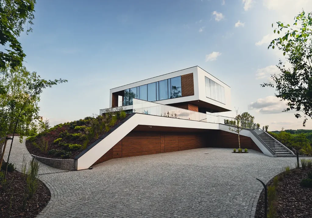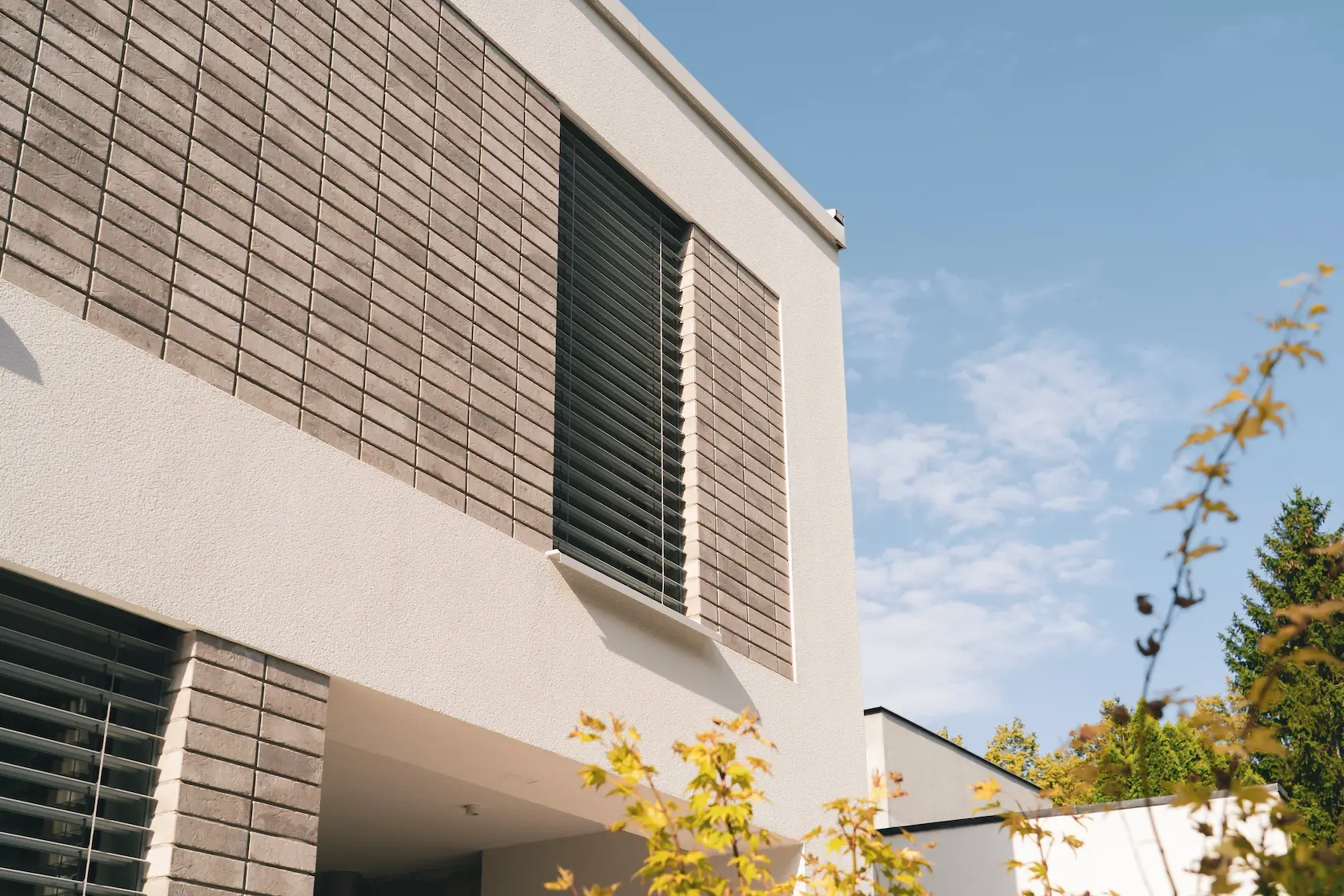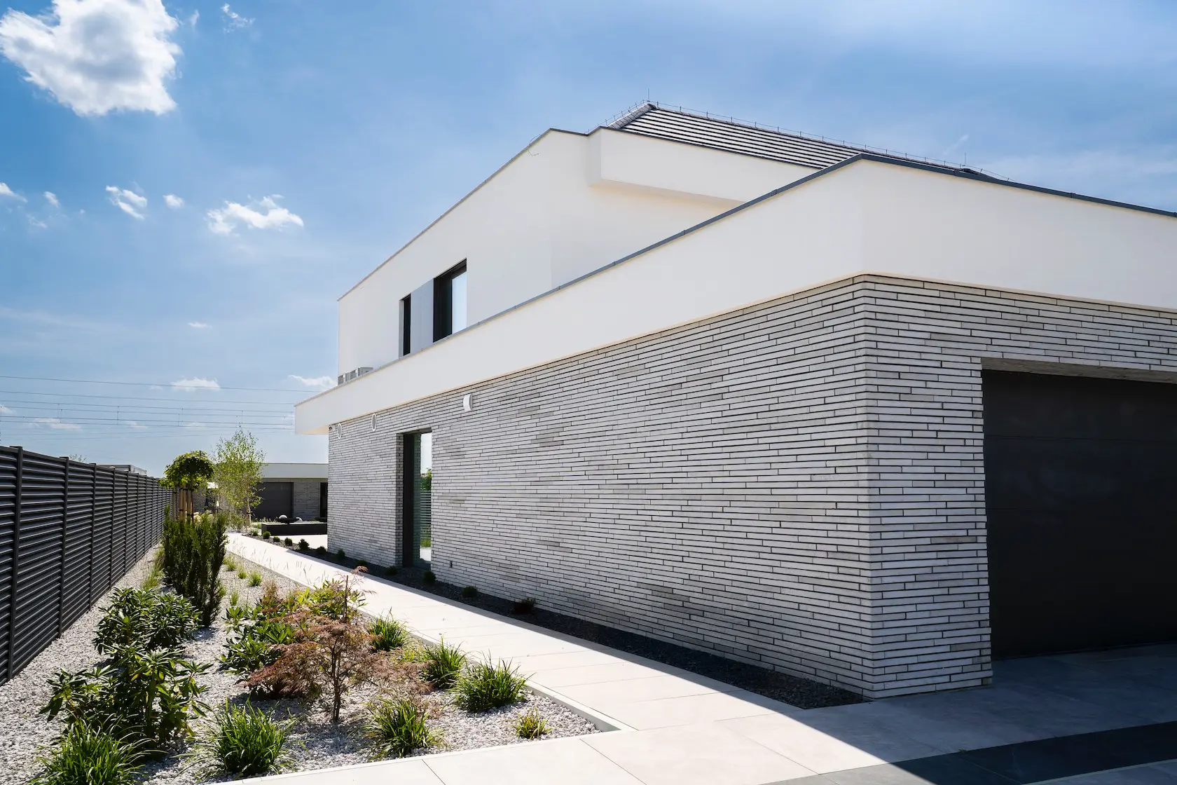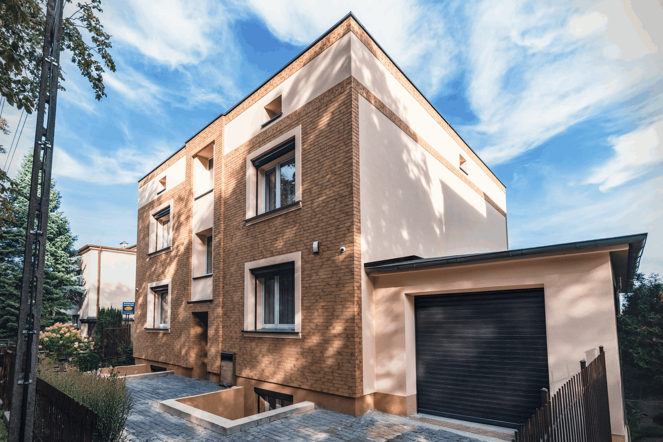 Projekt elewacji opiera się na wydajnym i sprawdzonym systemie ETICS STO, cechującym się bogatym wykończeniem z użyciem materiałów klasy premium, takich jak spieki kwarcowe i cegła typu Long.
