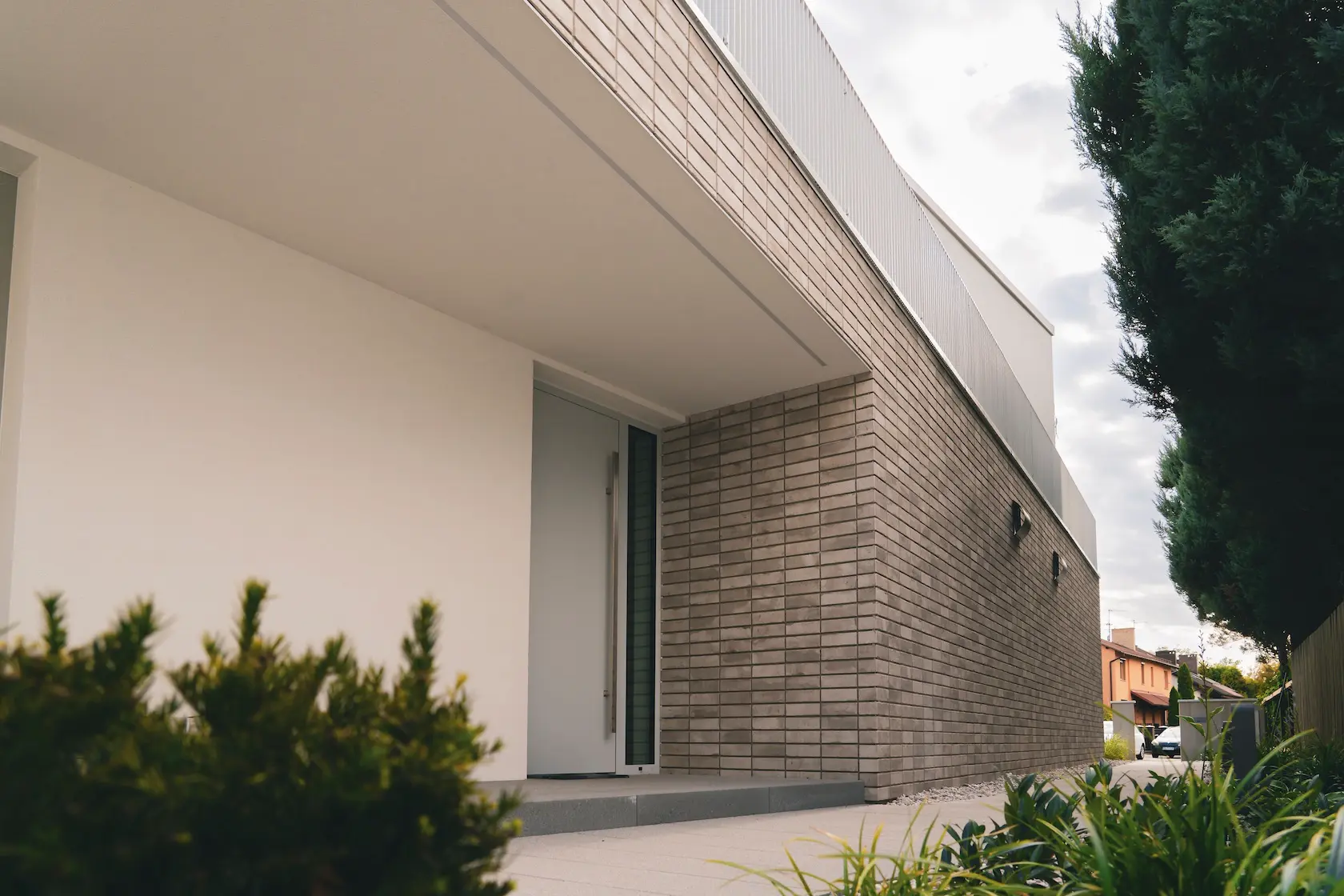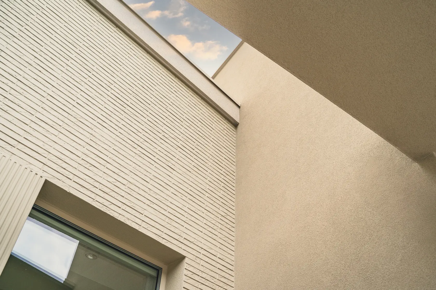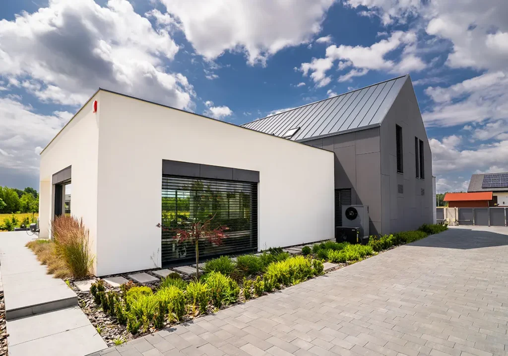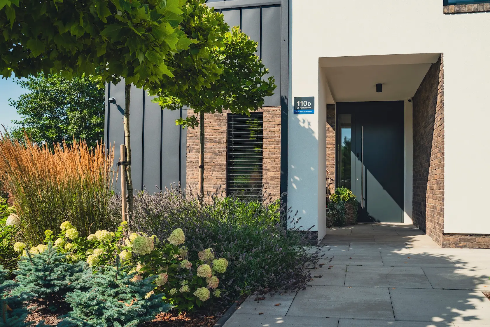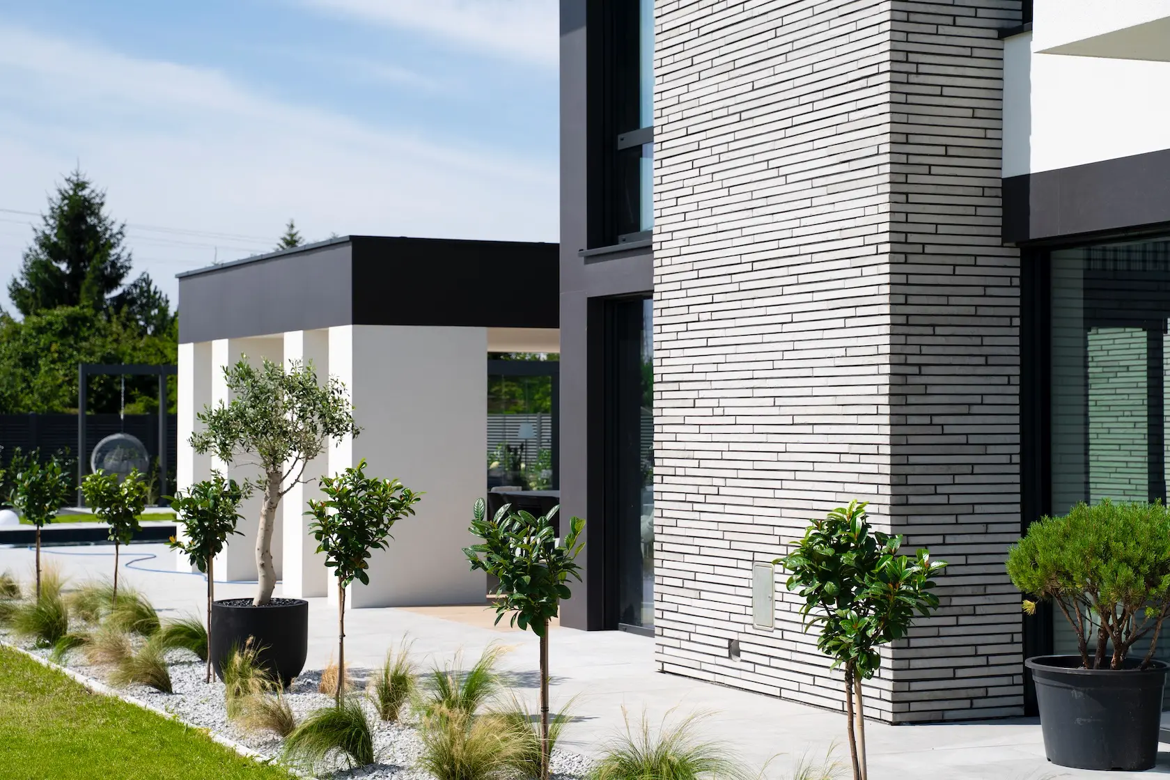 Projekt elewacji opiera się na wydajnym i sprawdzonym systemie ETICS STO, cechującym się bogatym wykończeniem z użyciem materiałów klasy premium, takich jak spieki kwarcowe i cegła typu Long.
