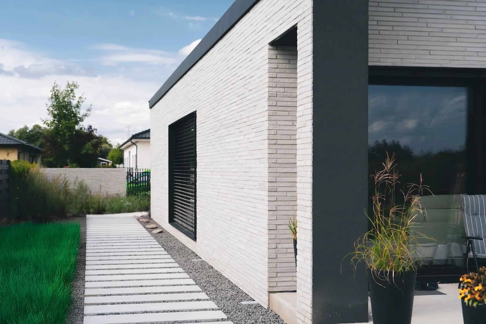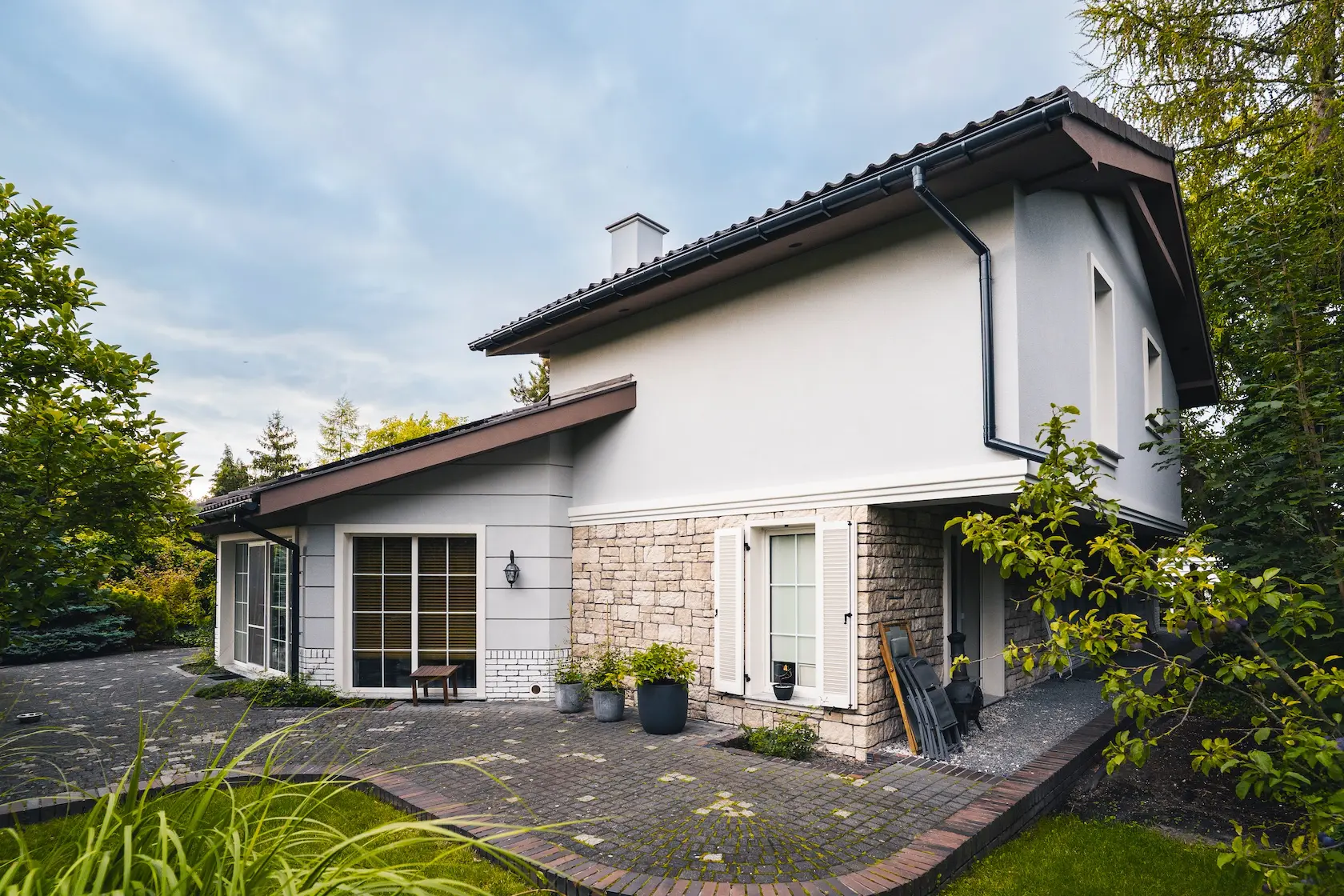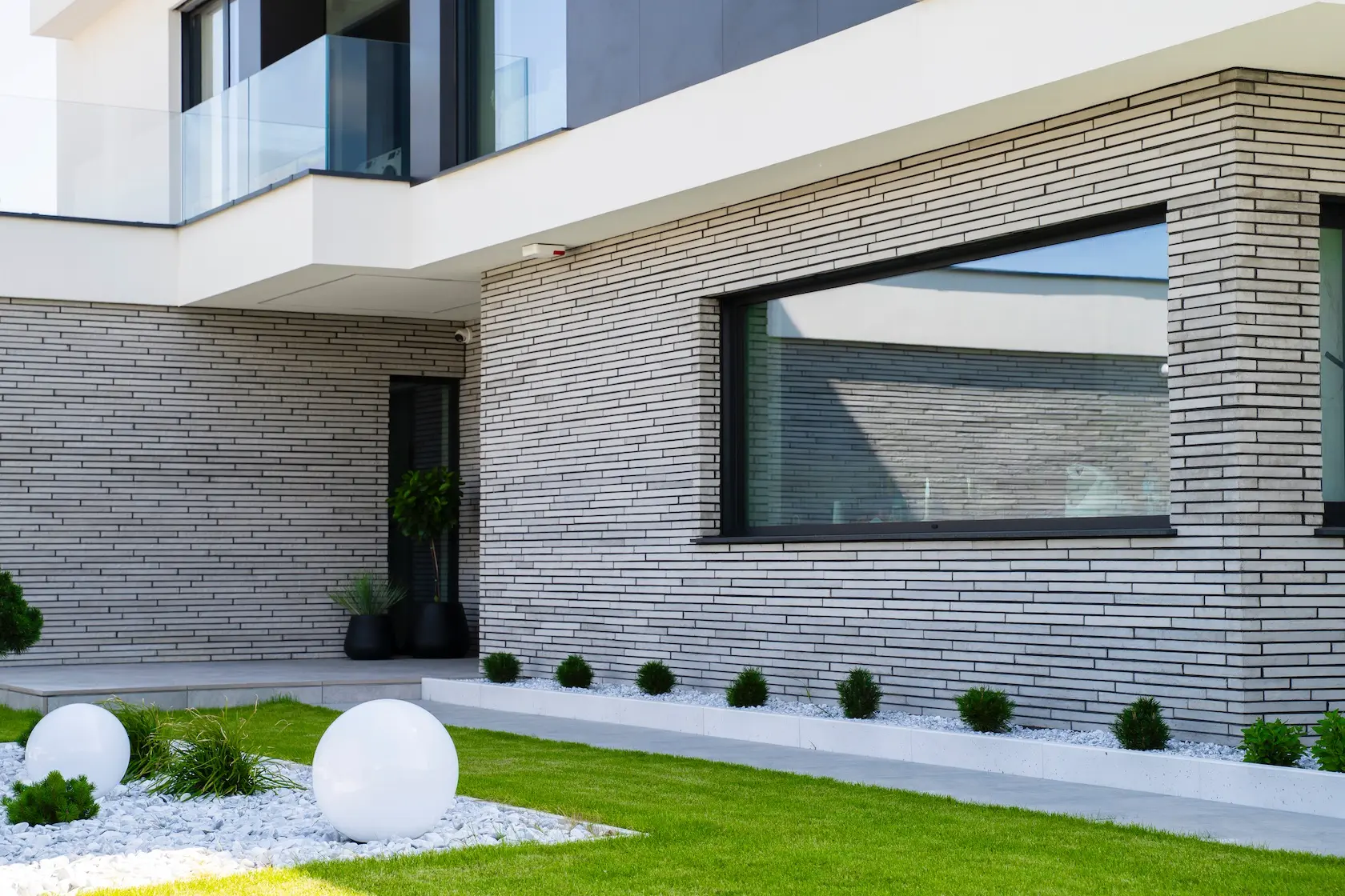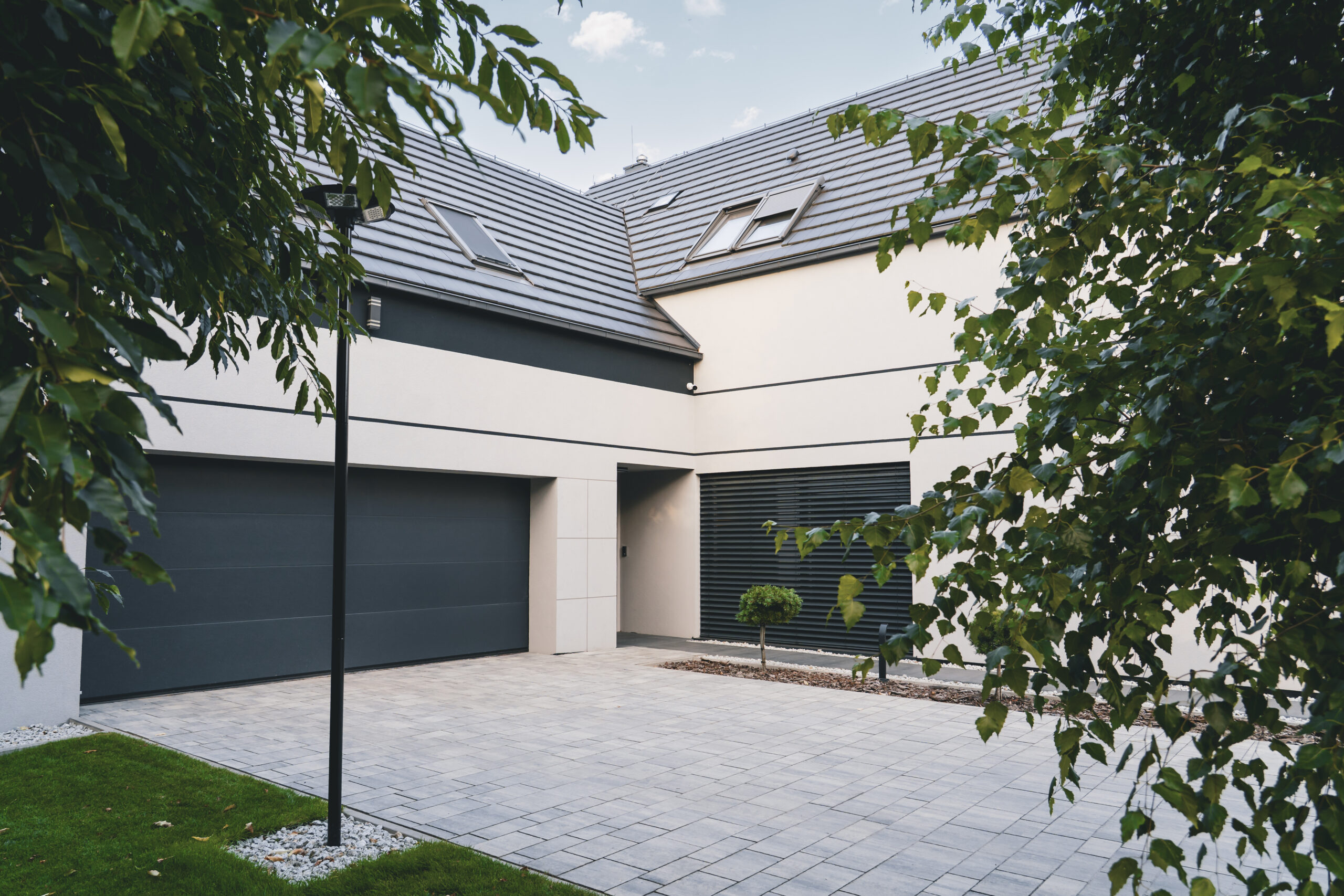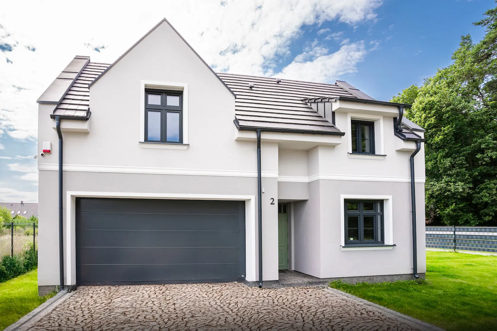 Projekt elewacji opiera się na wydajnym i sprawdzonym systemie ETICS STO, cechującym się bogatym wykończeniem z użyciem materiałów klasy premium, takich jak spieki kwarcowe i cegła typu Long.