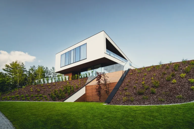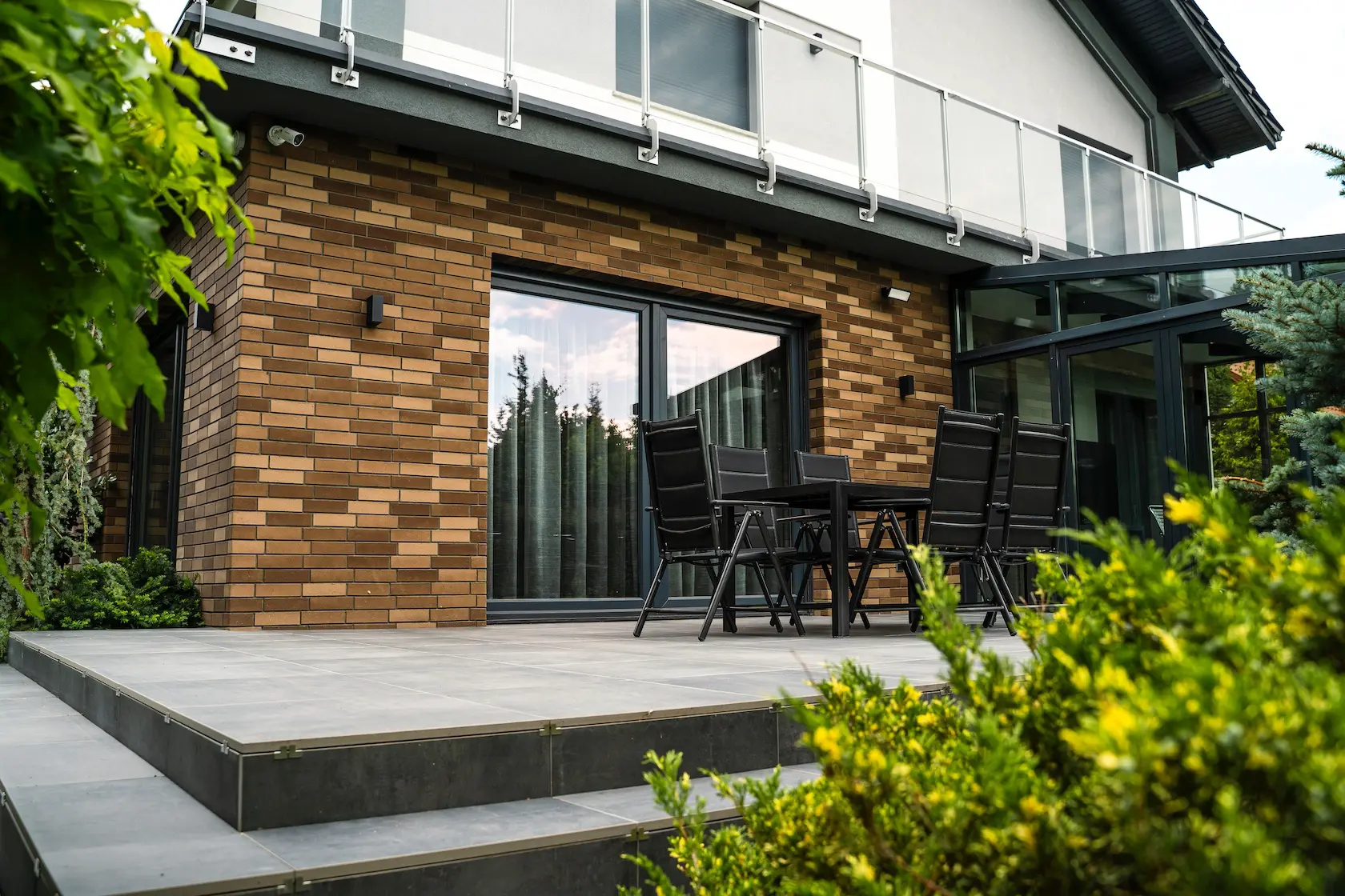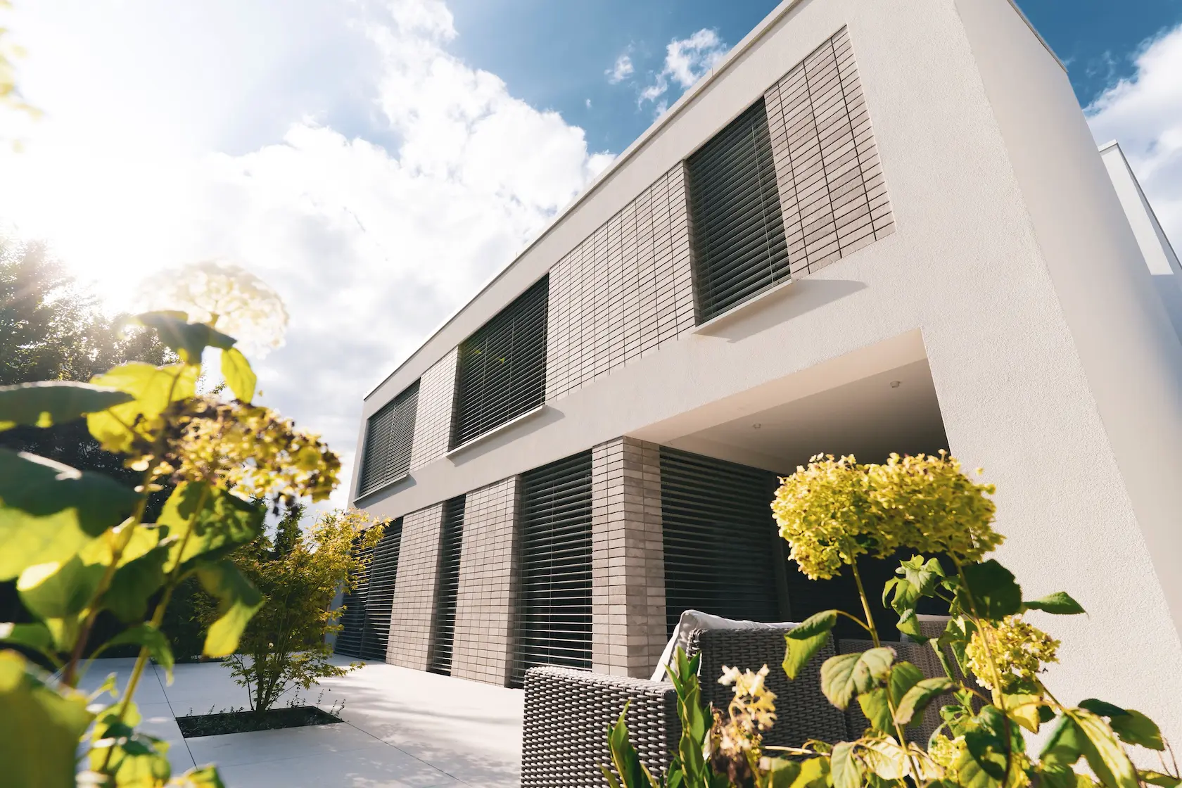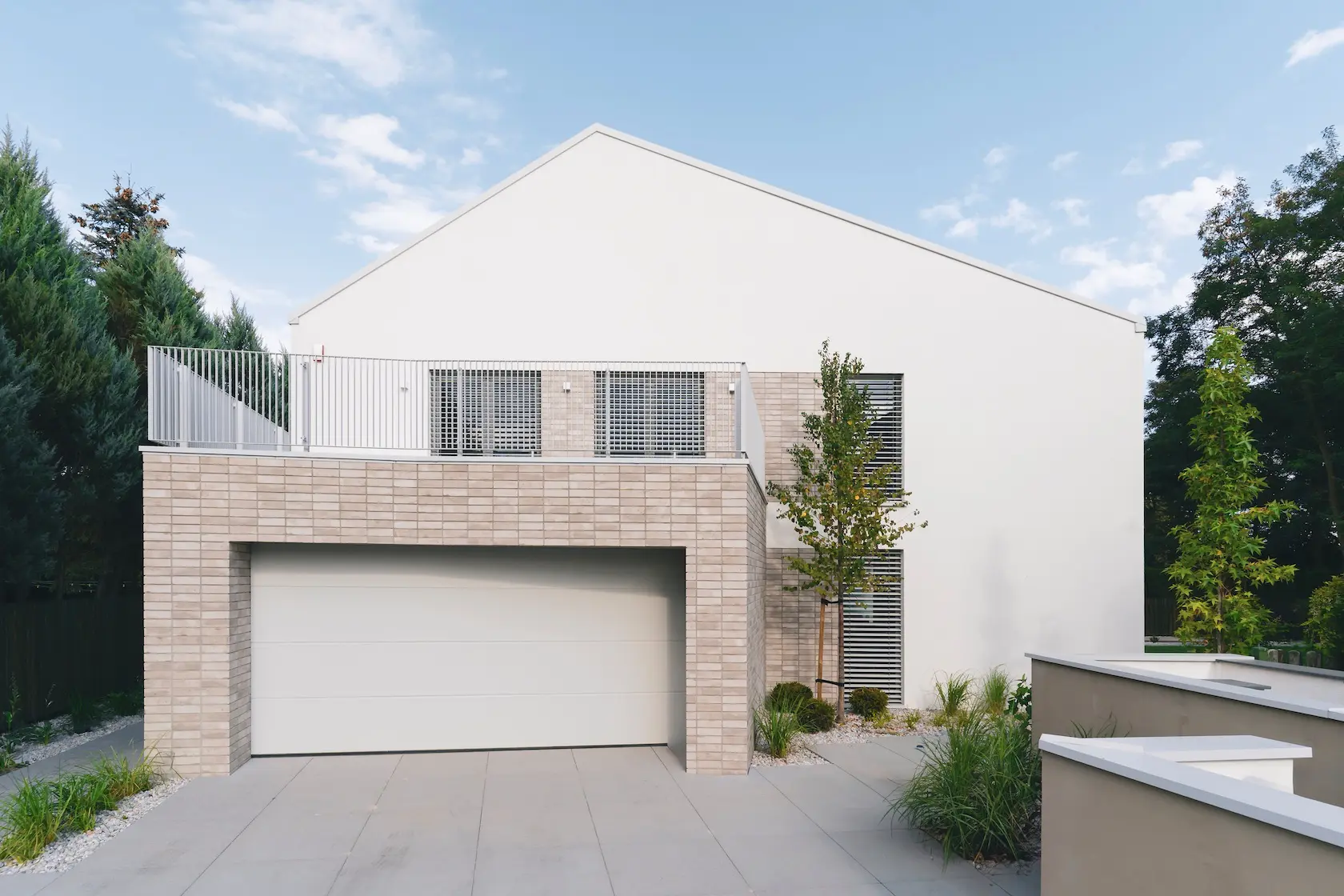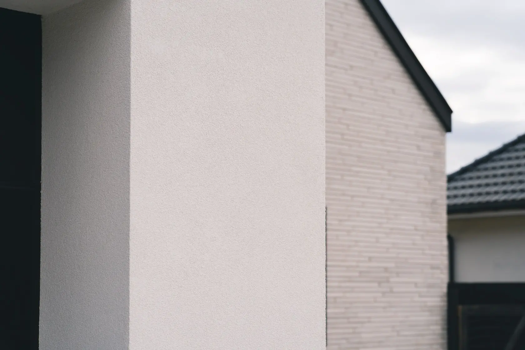 Projekt elewacji opiera się na wydajnym i sprawdzonym systemie ETICS STO, cechującym się bogatym wykończeniem z użyciem materiałów klasy premium, takich jak spieki kwarcowe i cegła typu Long.