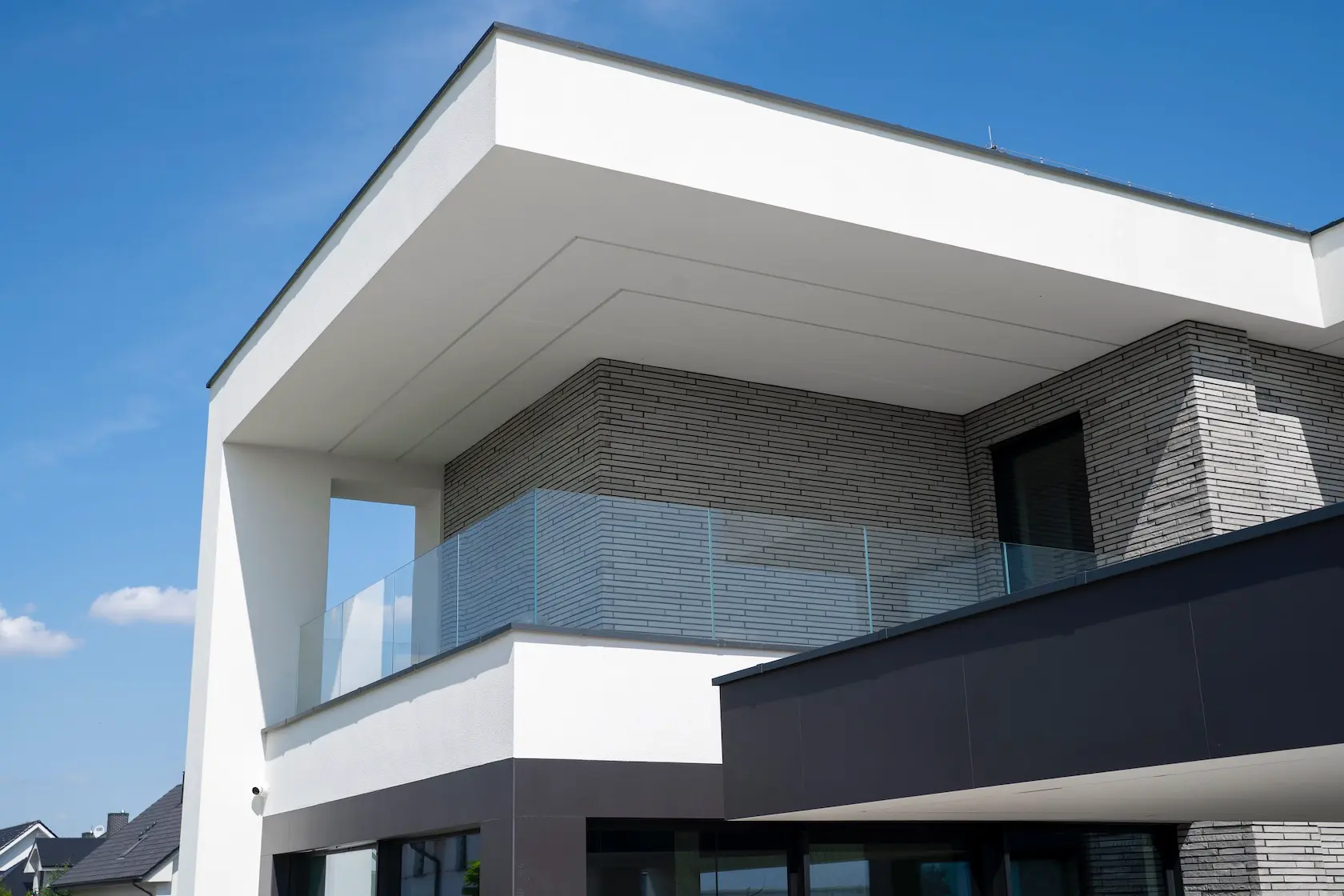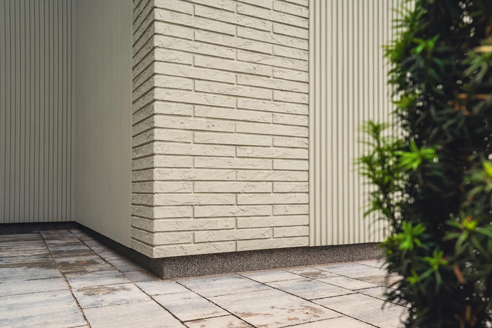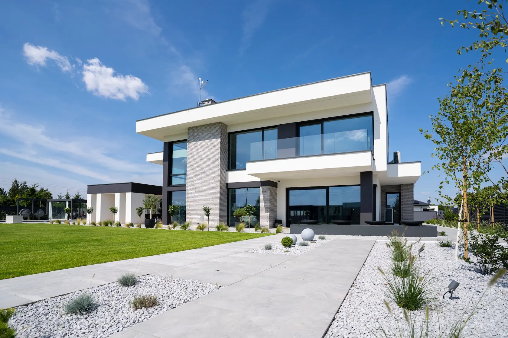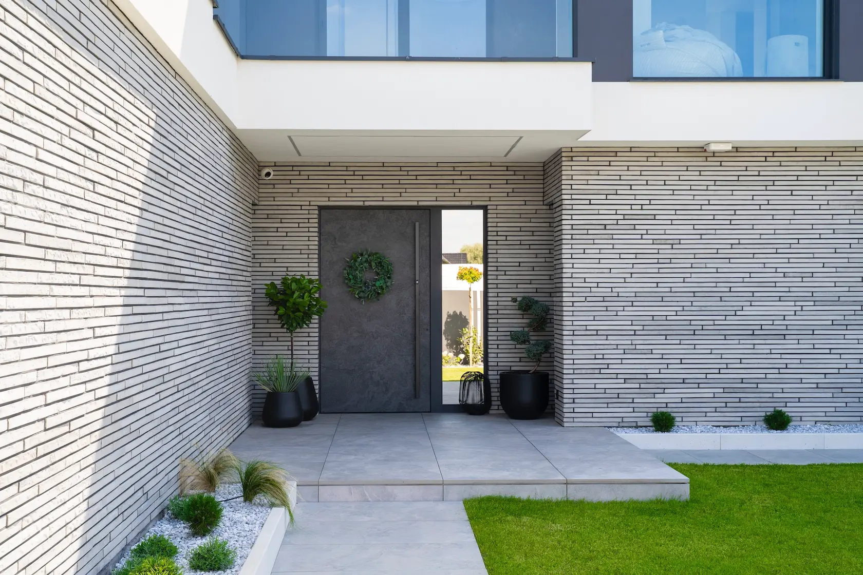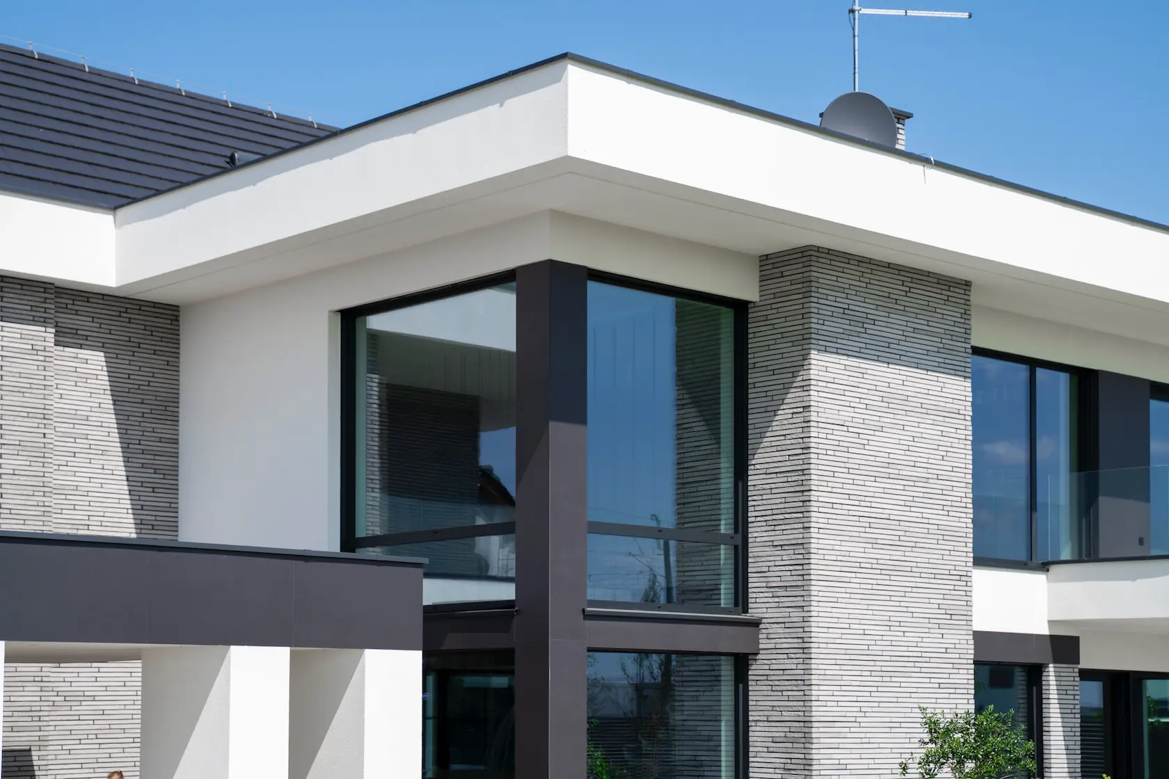 Projekt elewacji opiera się na wydajnym i sprawdzonym systemie ETICS STO, cechującym się bogatym wykończeniem z użyciem materiałów klasy premium, takich jak spieki kwarcowe i cegła typu Long.