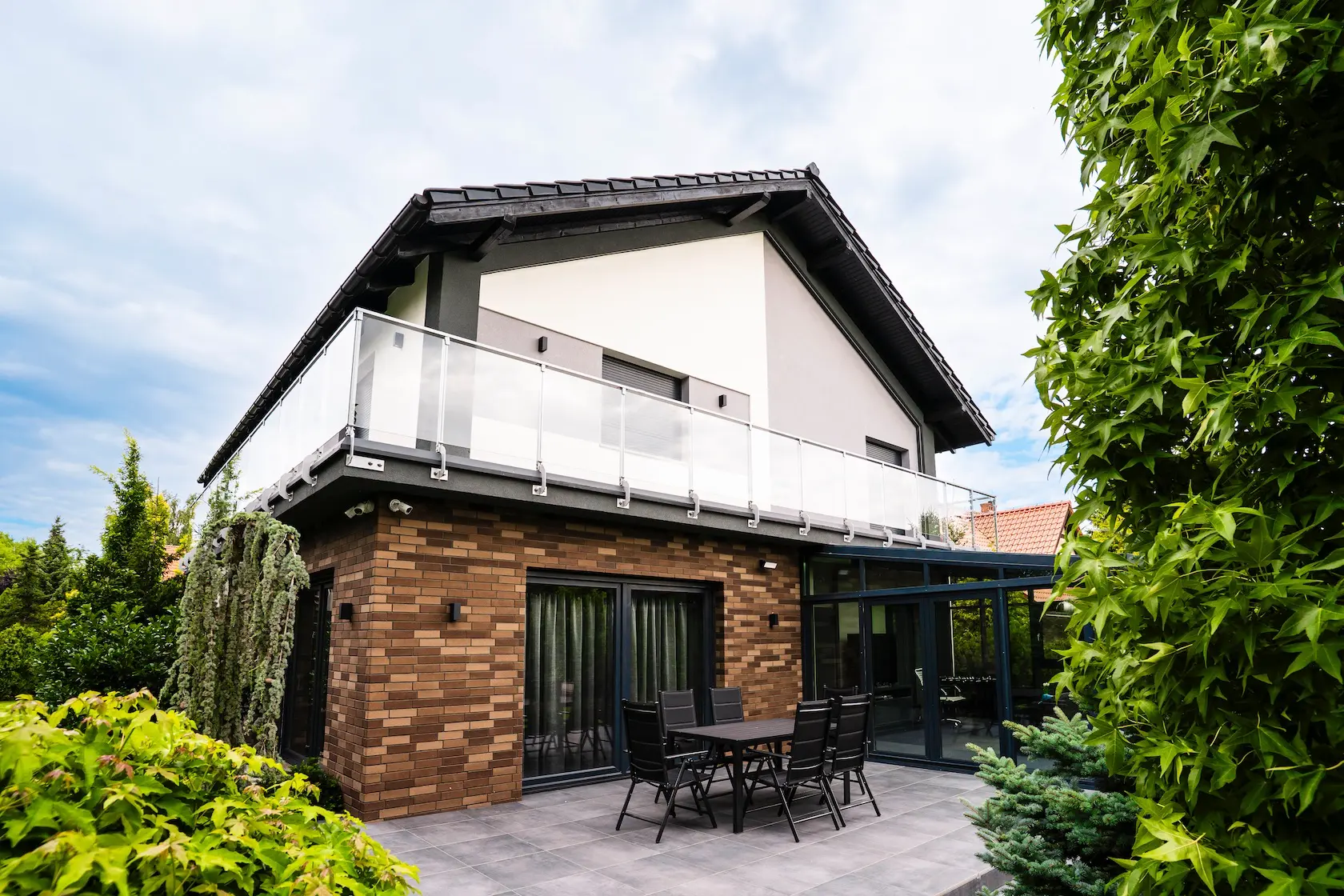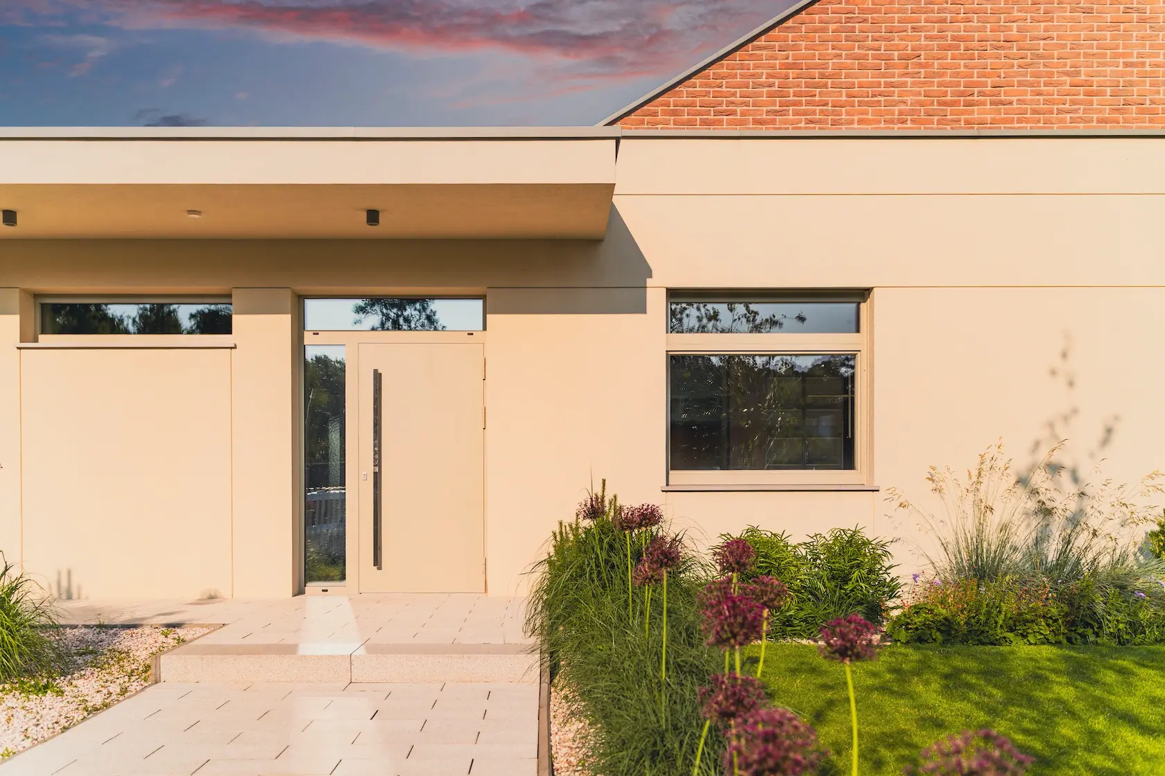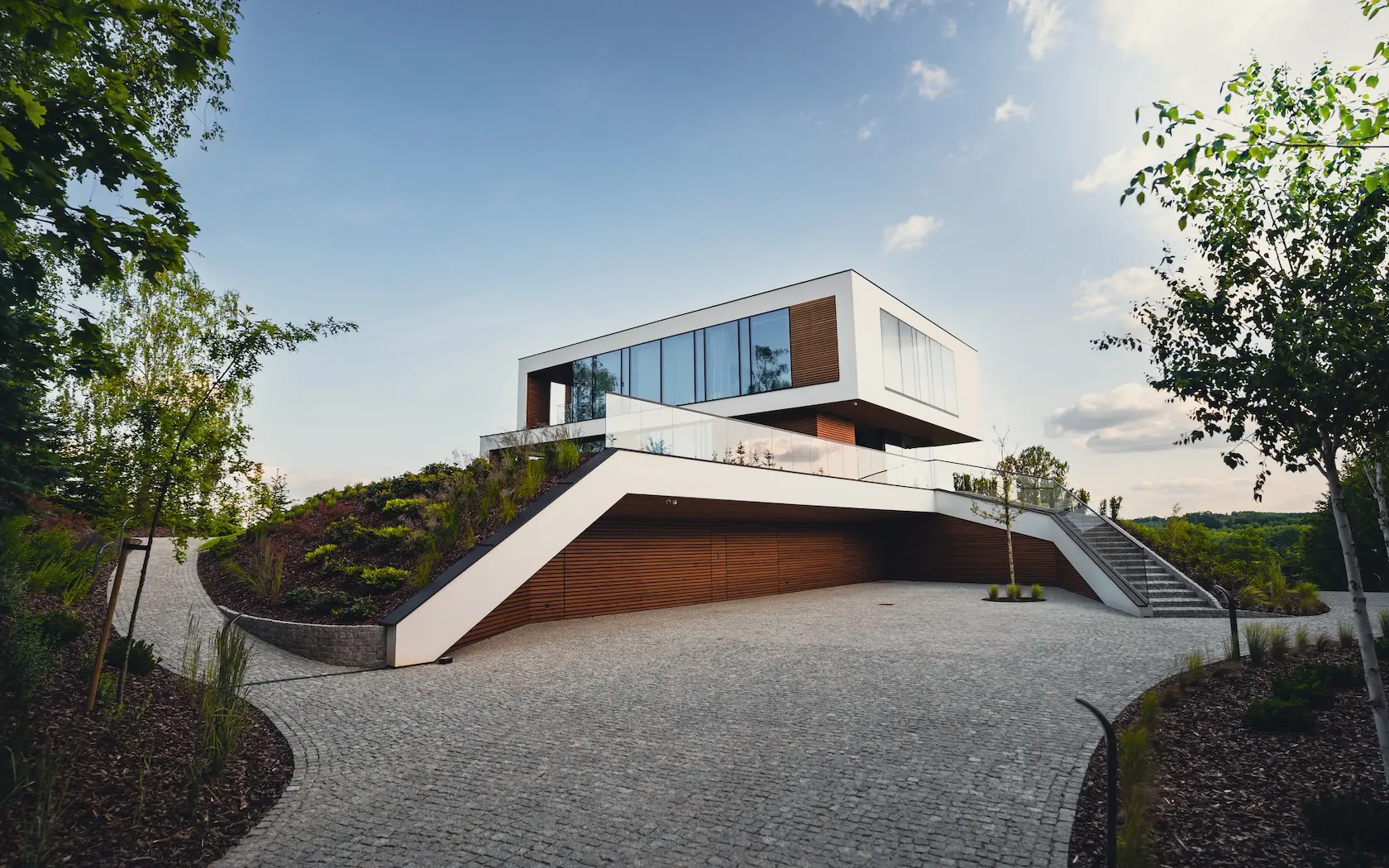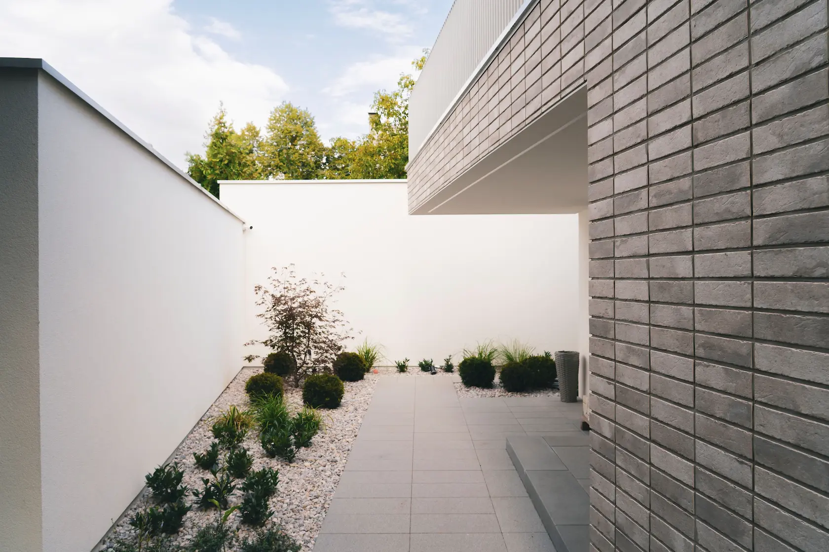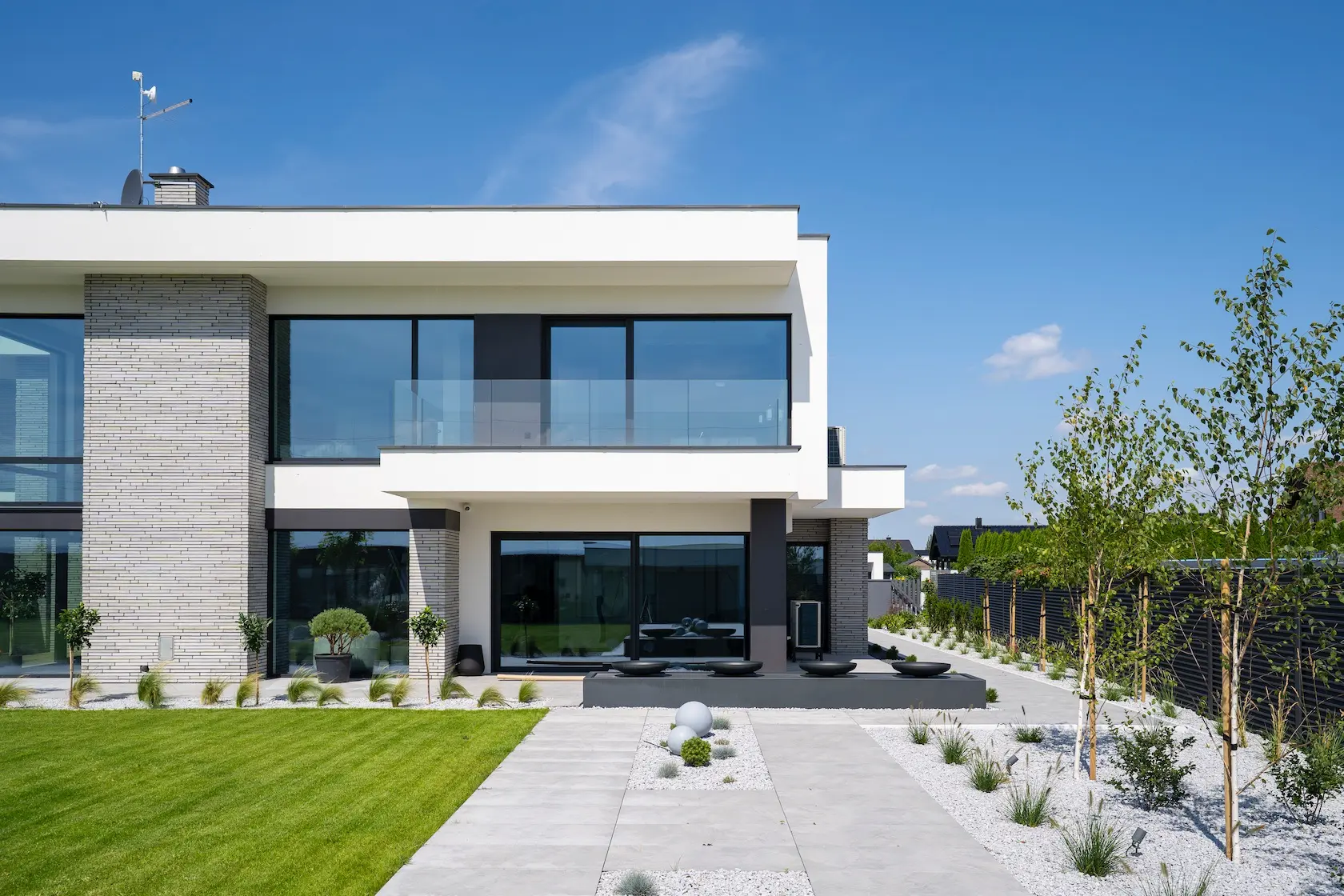 Projekt elewacji opiera się na wydajnym i sprawdzonym systemie ETICS STO, cechującym się bogatym wykończeniem z użyciem materiałów klasy premium, takich jak spieki kwarcowe i cegła typu Long.
