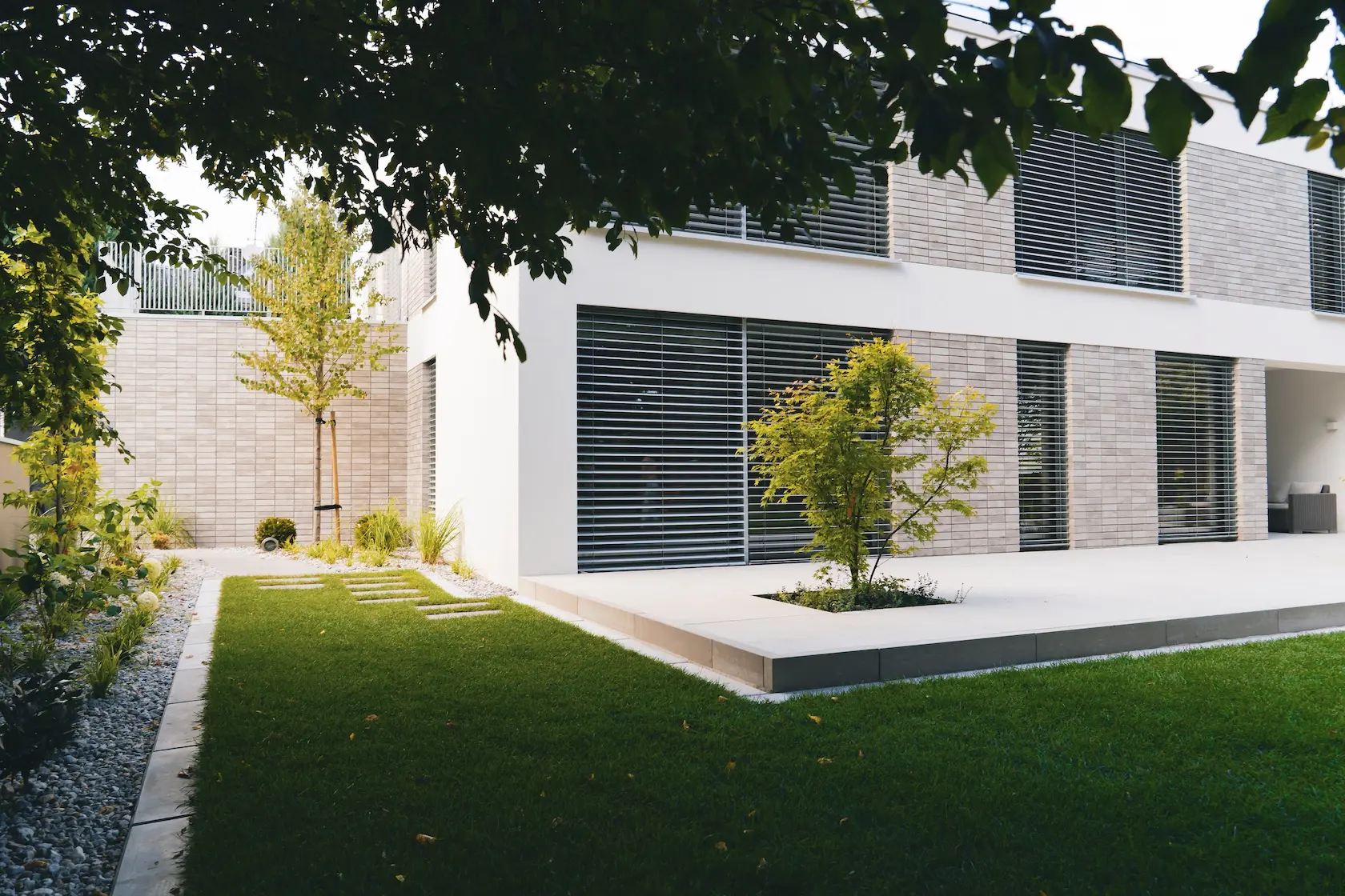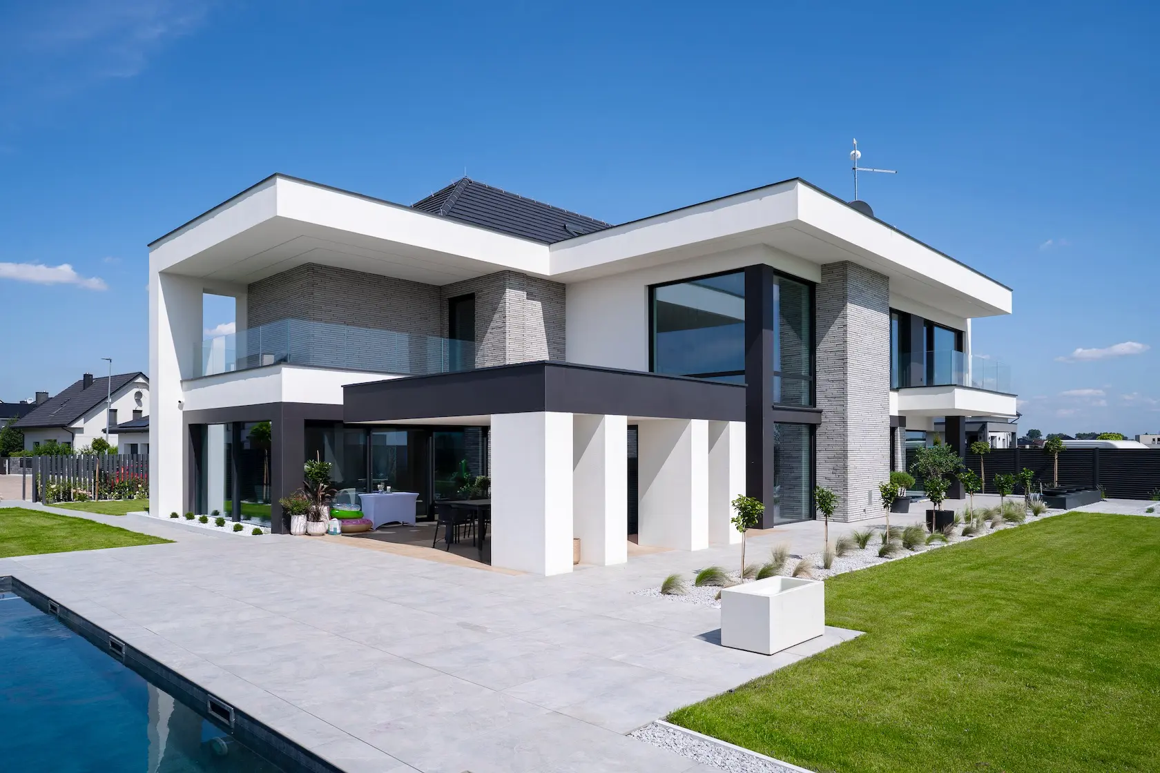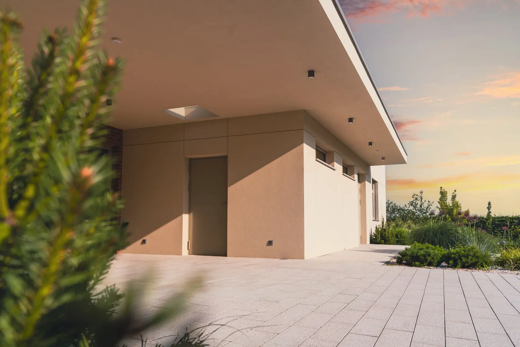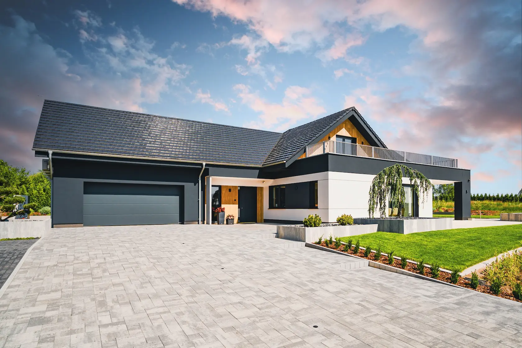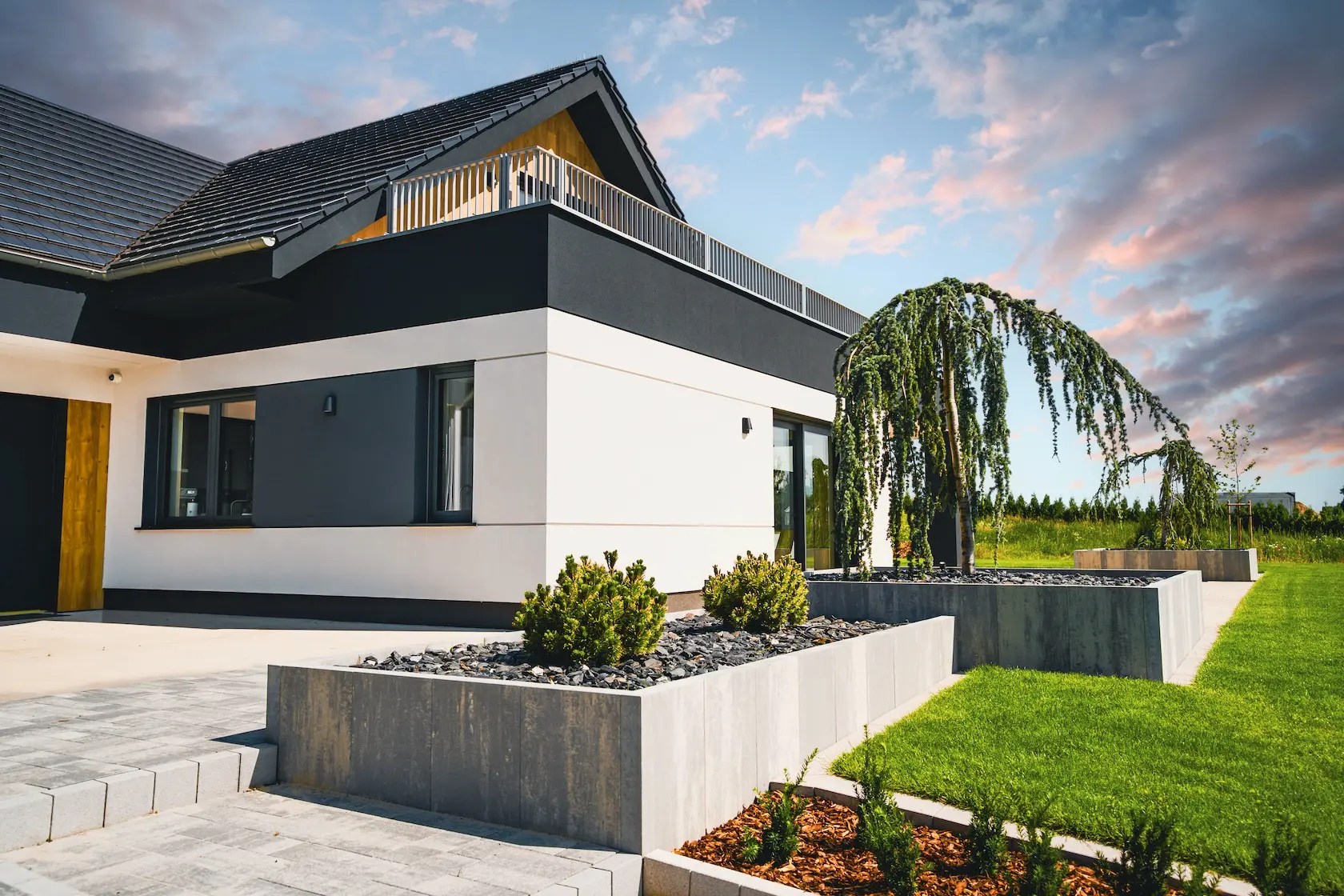 Projekt elewacji opiera się na wydajnym i sprawdzonym systemie ETICS STO, cechującym się bogatym wykończeniem z użyciem materiałów klasy premium, takich jak spieki kwarcowe i cegła typu Long.