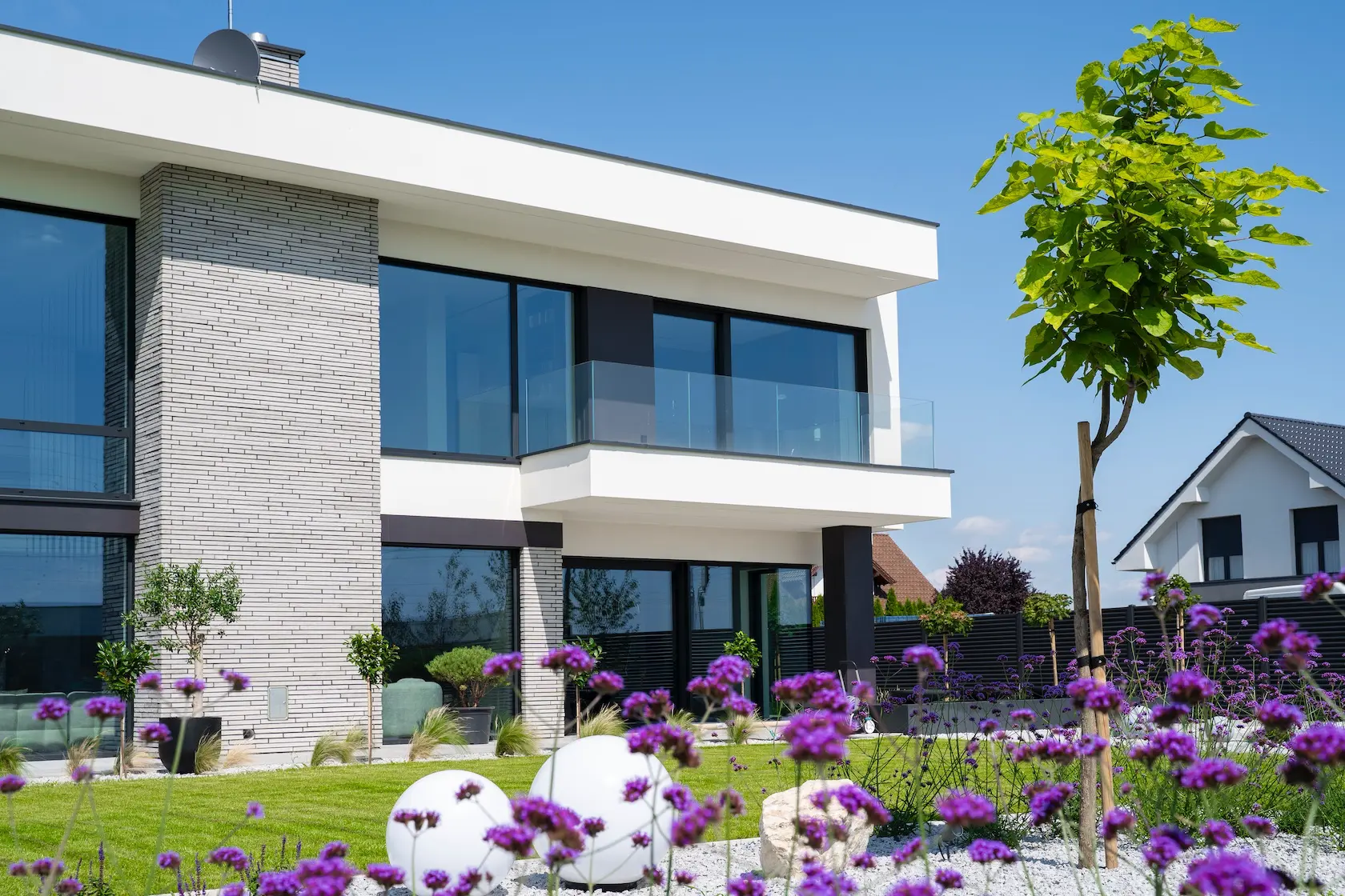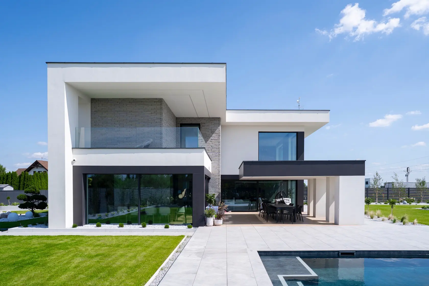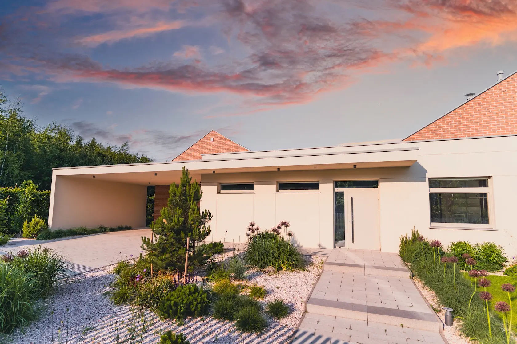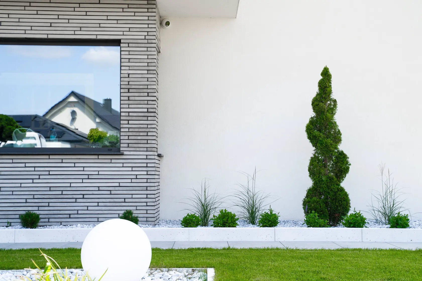 Projekt elewacji opiera się na wydajnym i sprawdzonym systemie ETICS STO, cechującym się bogatym wykończeniem z użyciem materiałów klasy premium, takich jak spieki kwarcowe i cegła typu Long.