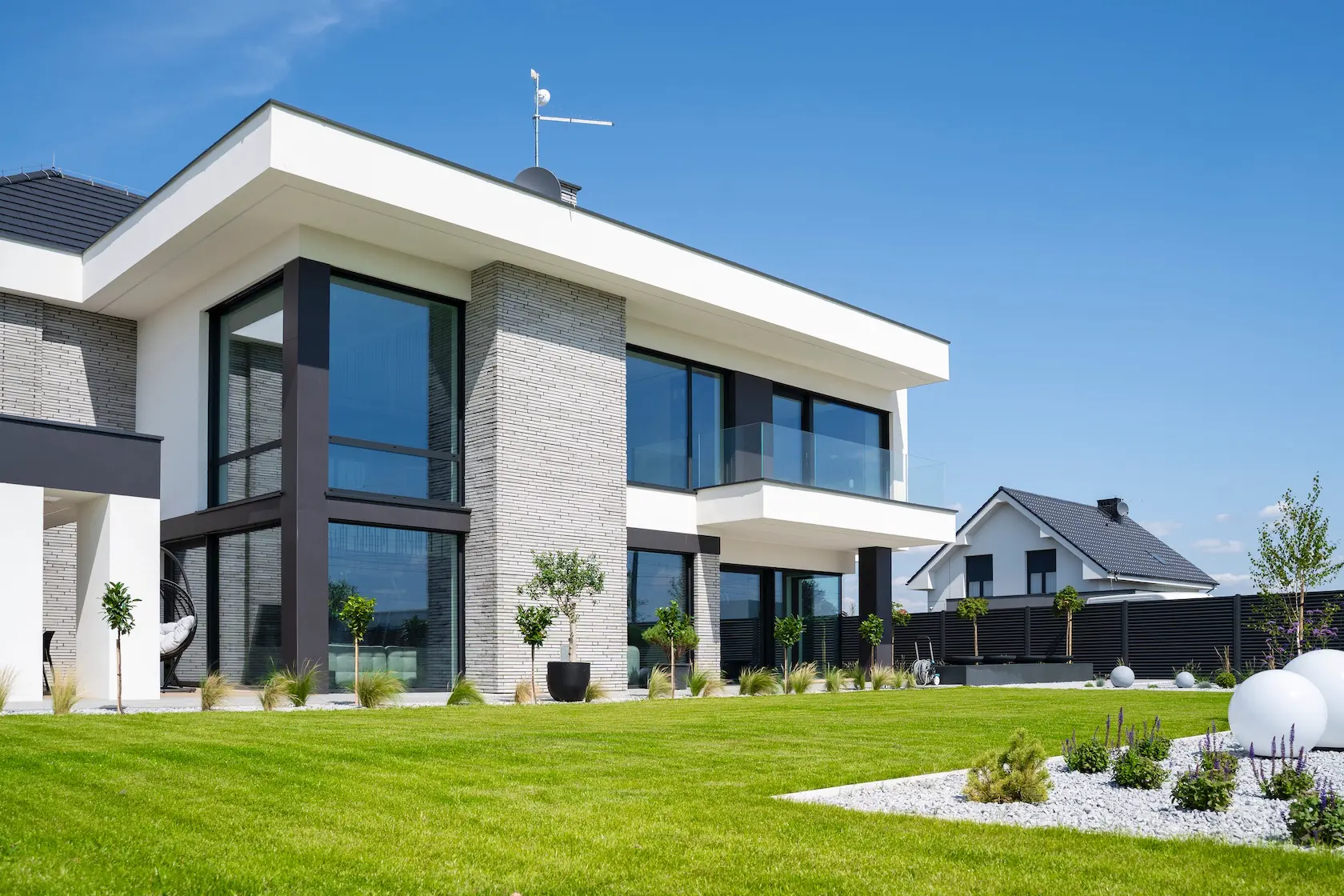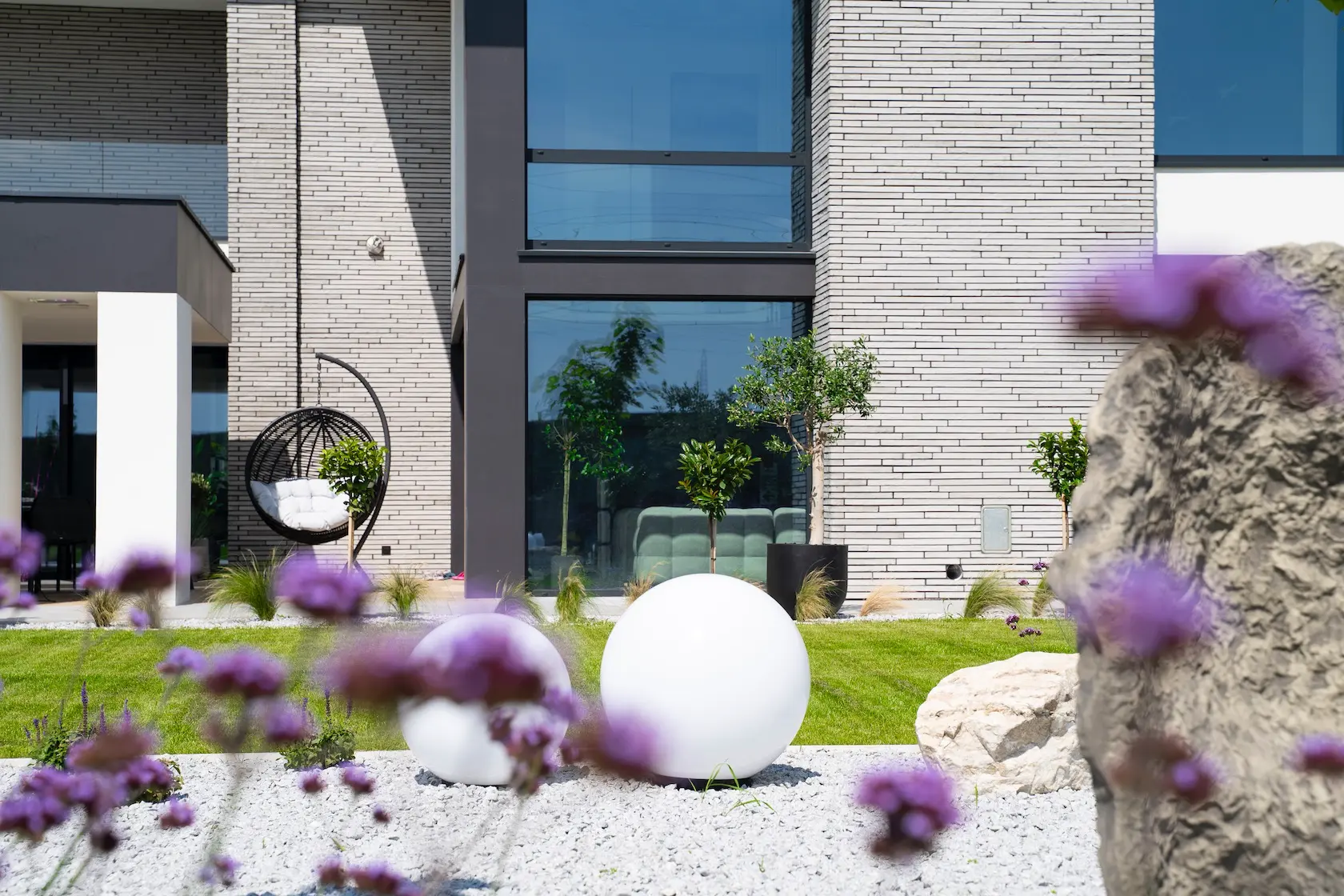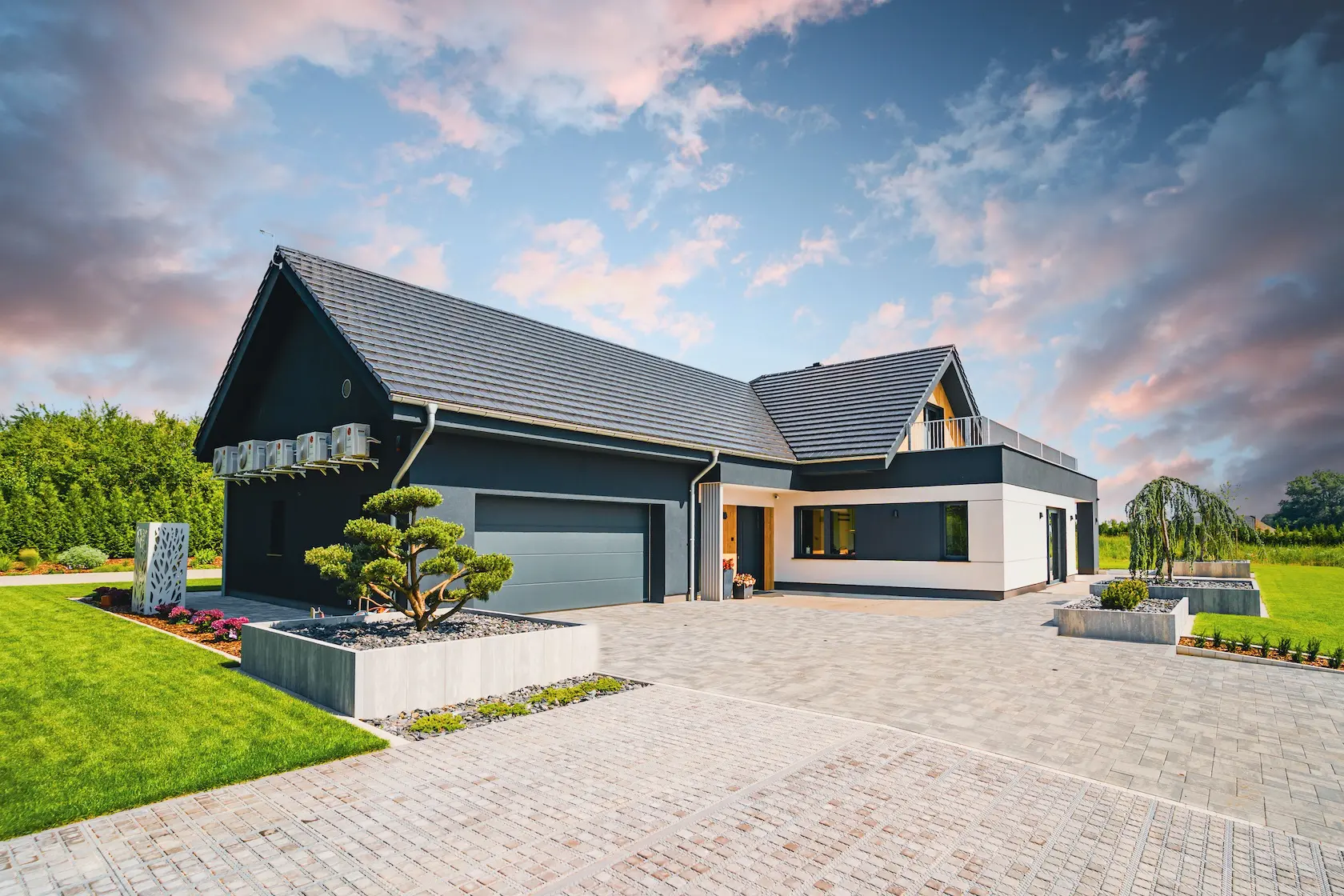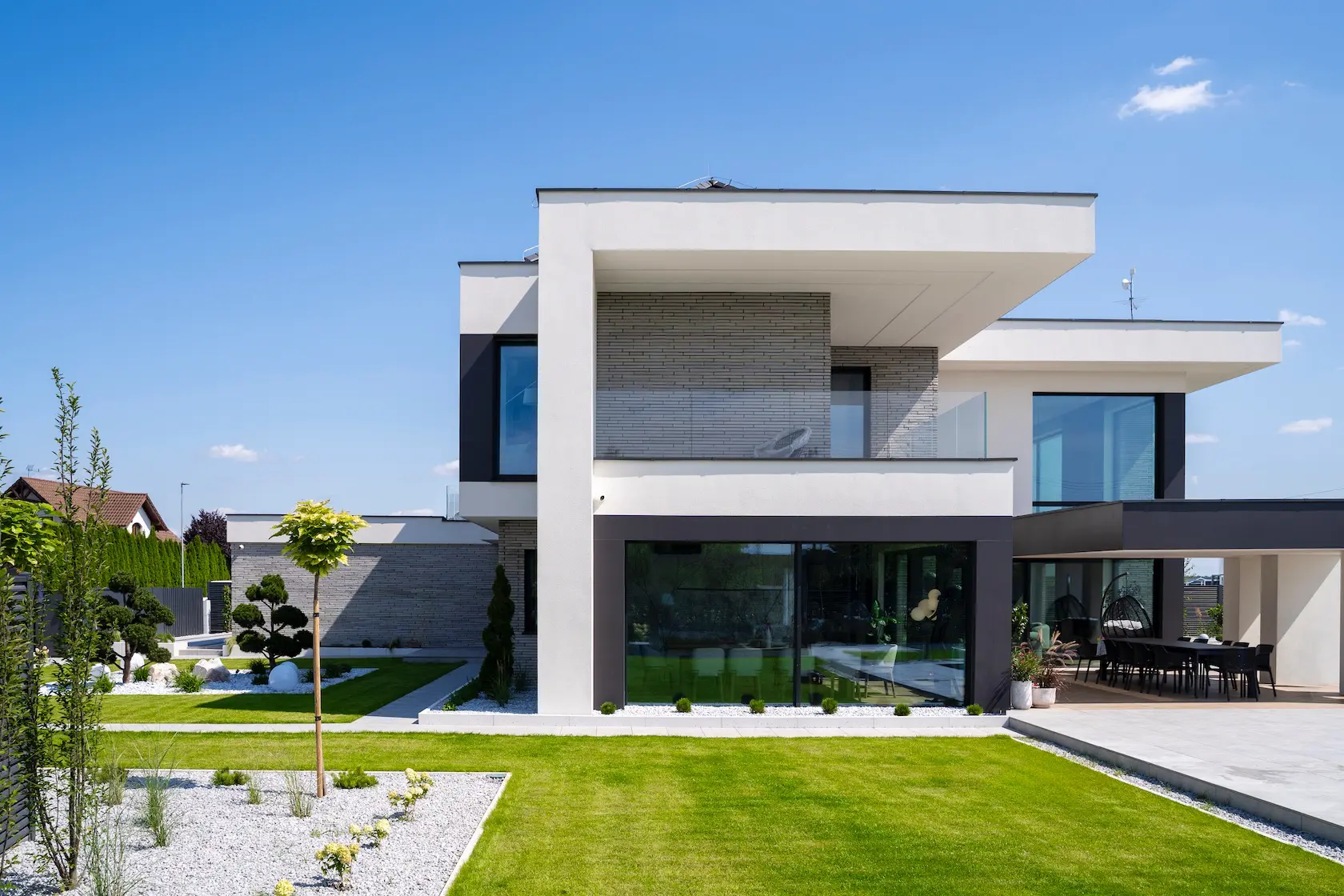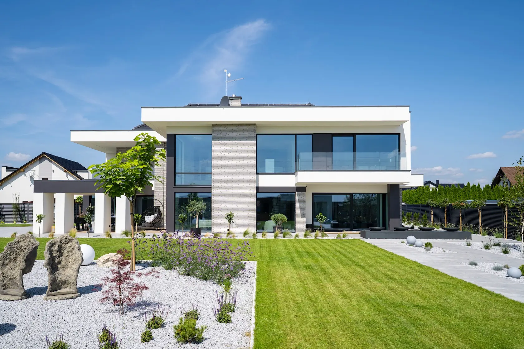 Projekt elewacji opiera się na wydajnym i sprawdzonym systemie ETICS STO, cechującym się bogatym wykończeniem z użyciem materiałów klasy premium, takich jak spieki kwarcowe i cegła typu Long.