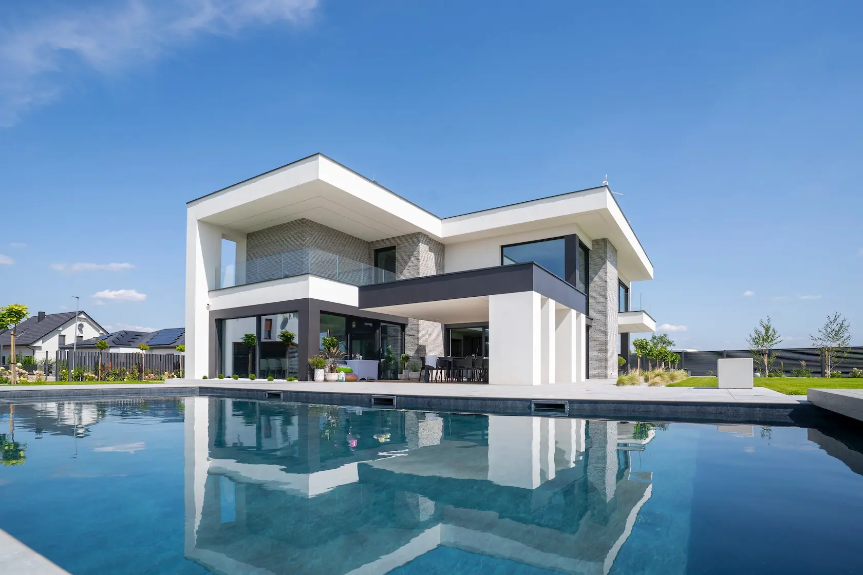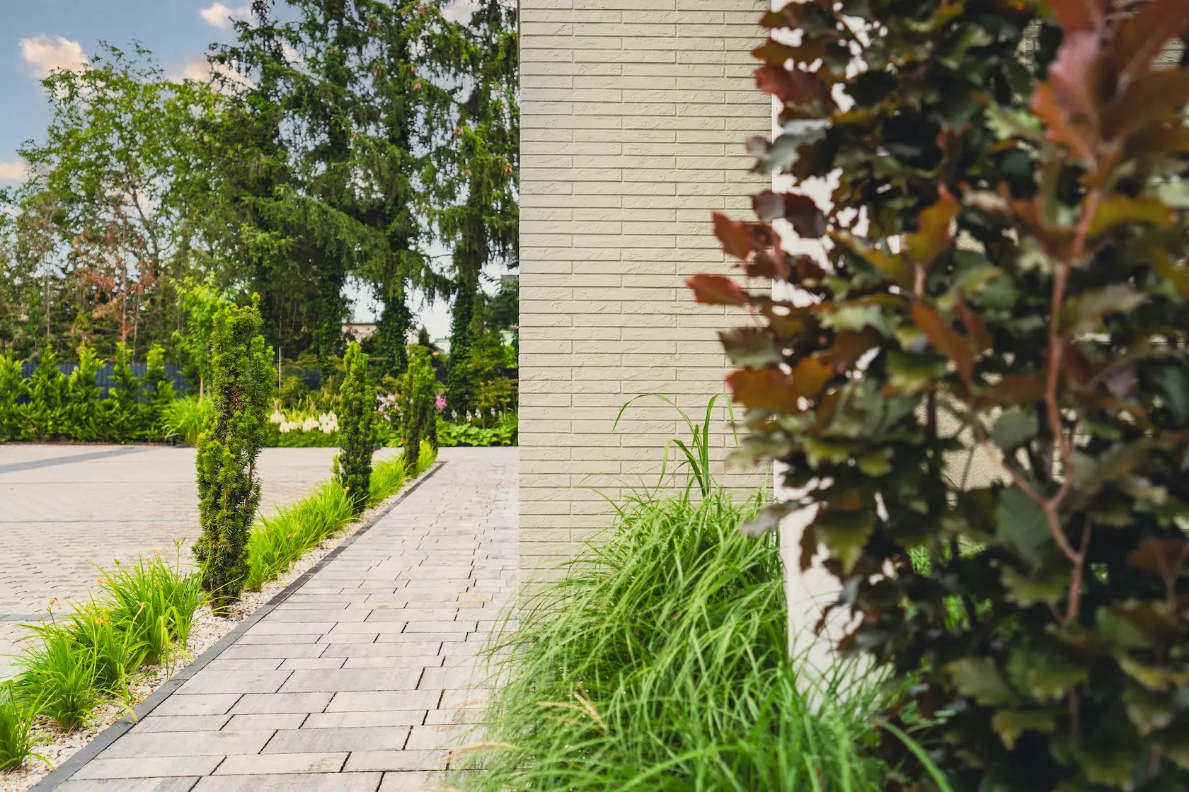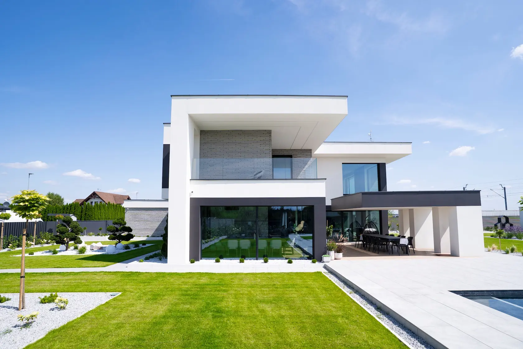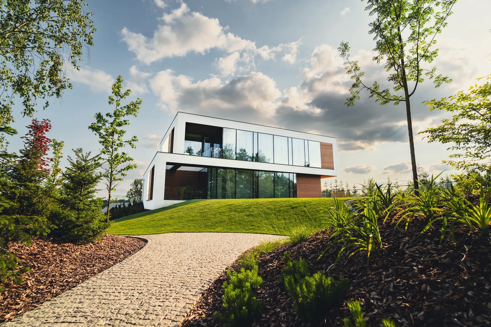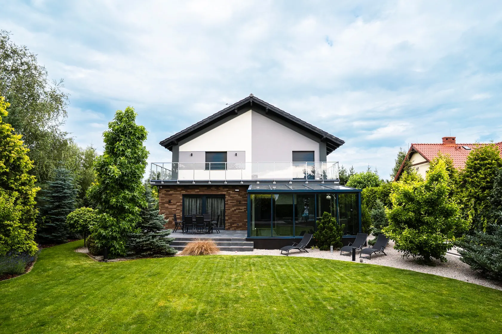Projekt elewacji opiera się na wydajnym i sprawdzonym systemie ETICS STO, cechującym się bogatym wykończeniem z użyciem materiałów klasy premium, takich jak spieki kwarcowe i cegła typu Long.