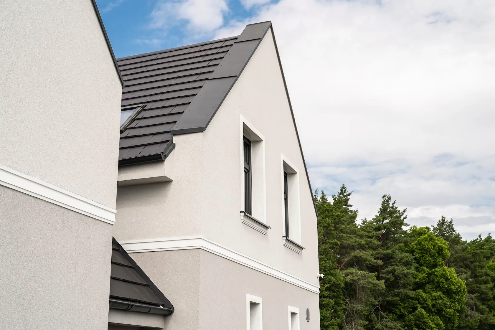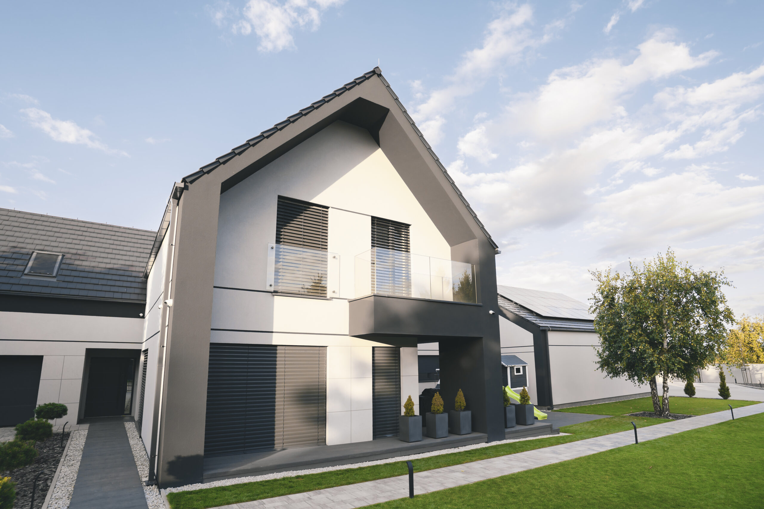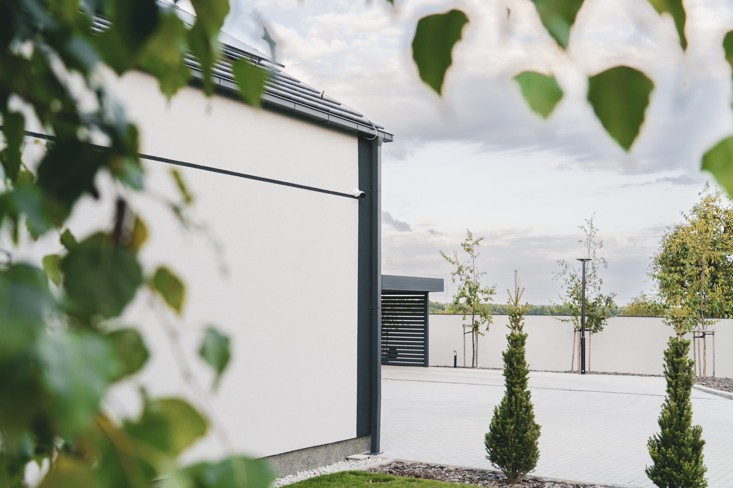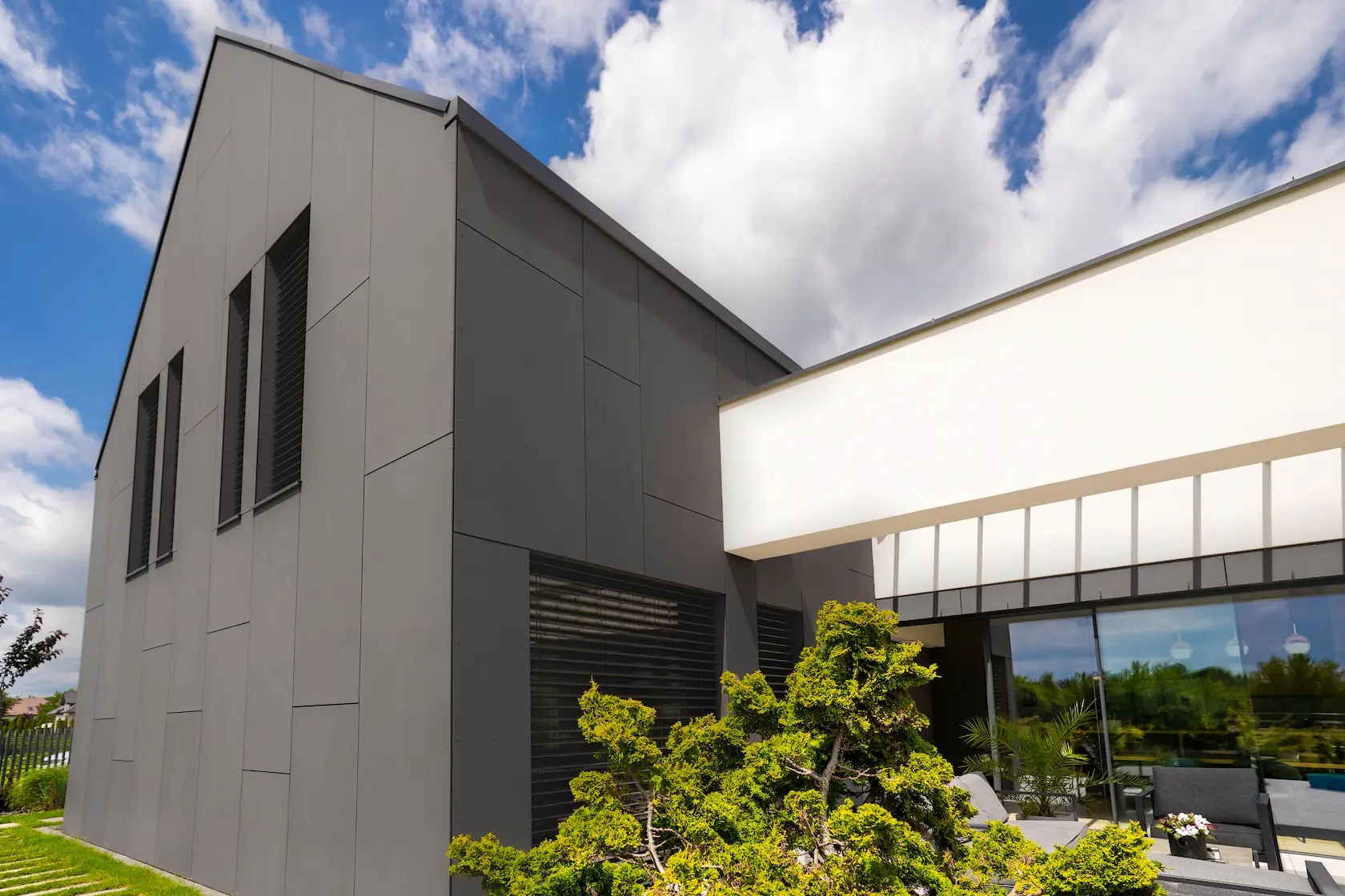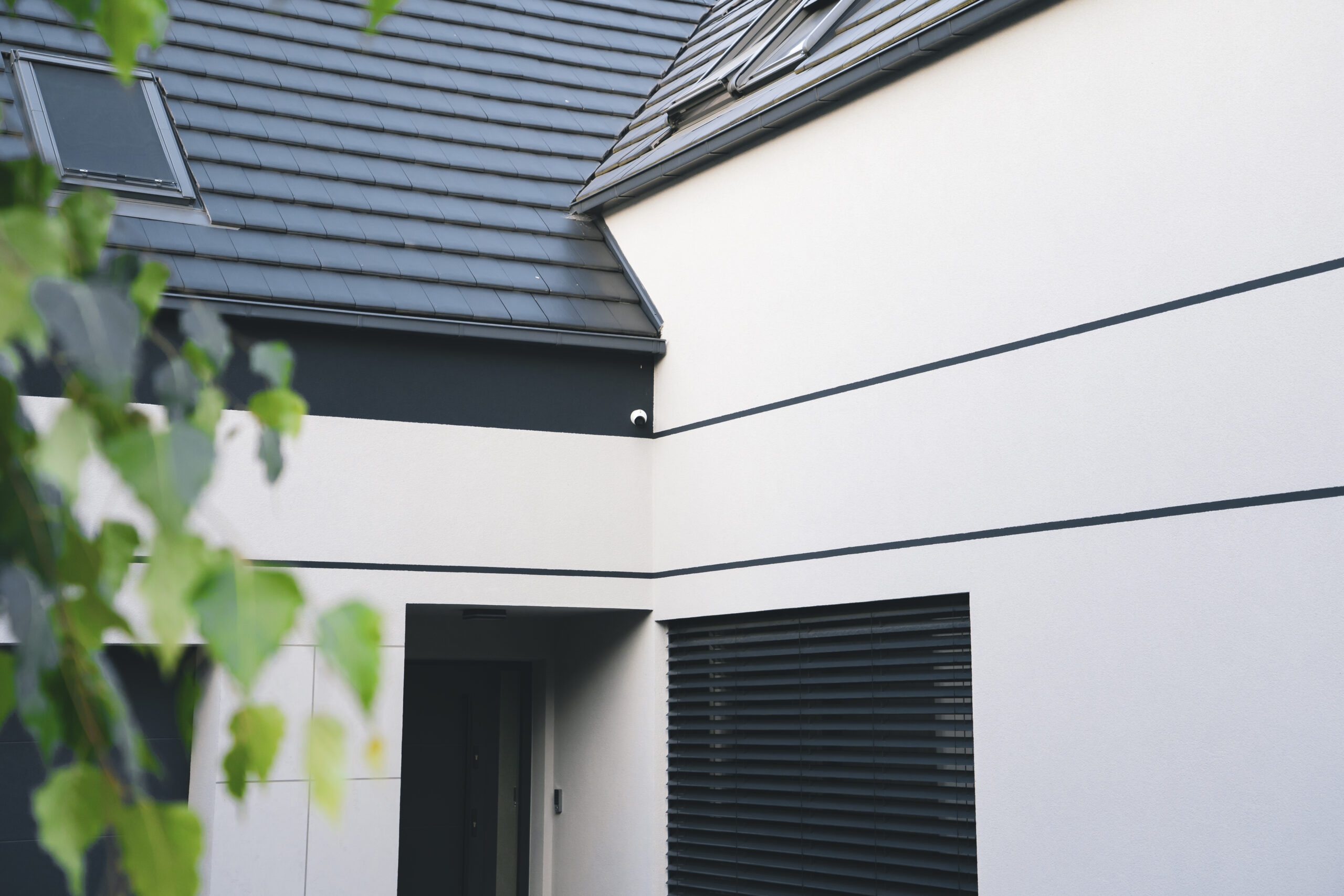 nowoczesna fasada wentylowana: wybrane partie elewacji wykonano w technologii wentylowanej z użyciem płyt włókno-cementowych Equitone. To rozwiązanie zapewnia wyjątkową trwałość, odporność na warunki atmosferyczne i nowoczesny, minimalistyczny wygląd.