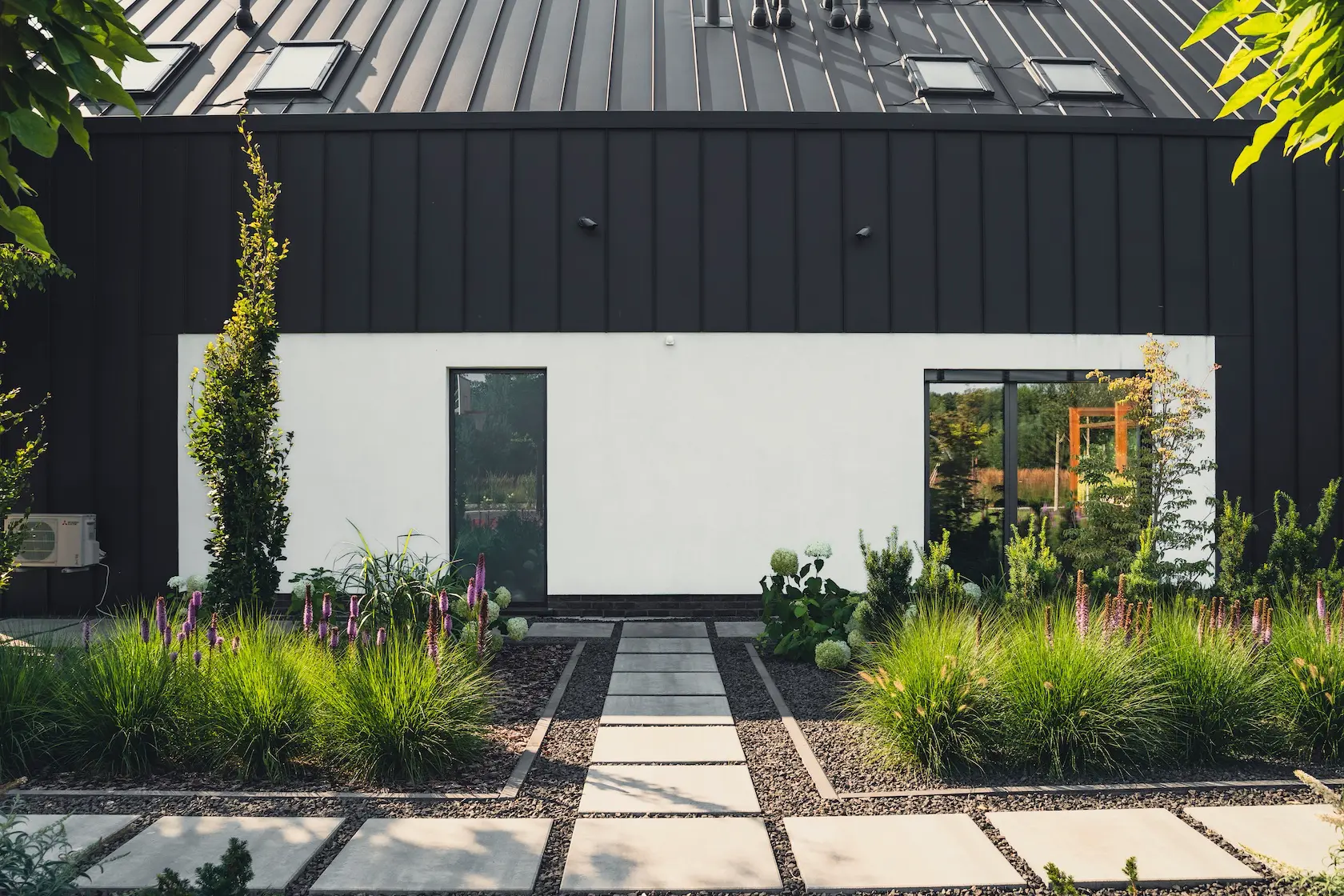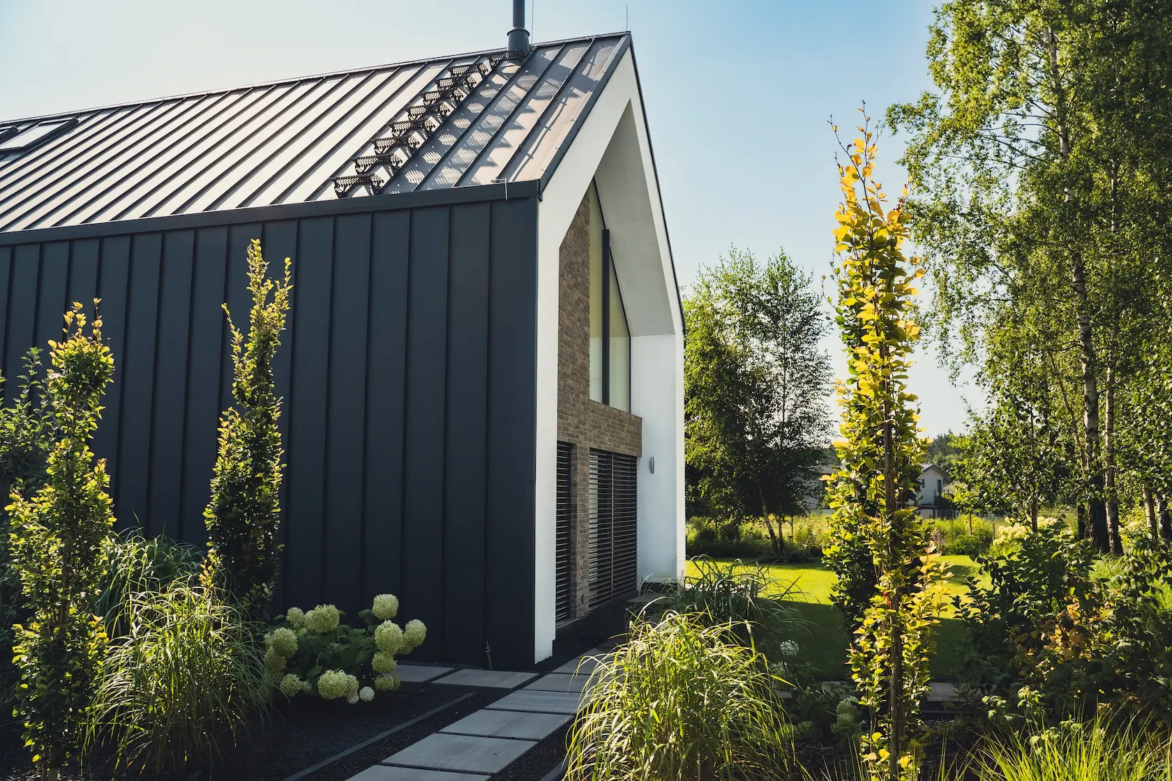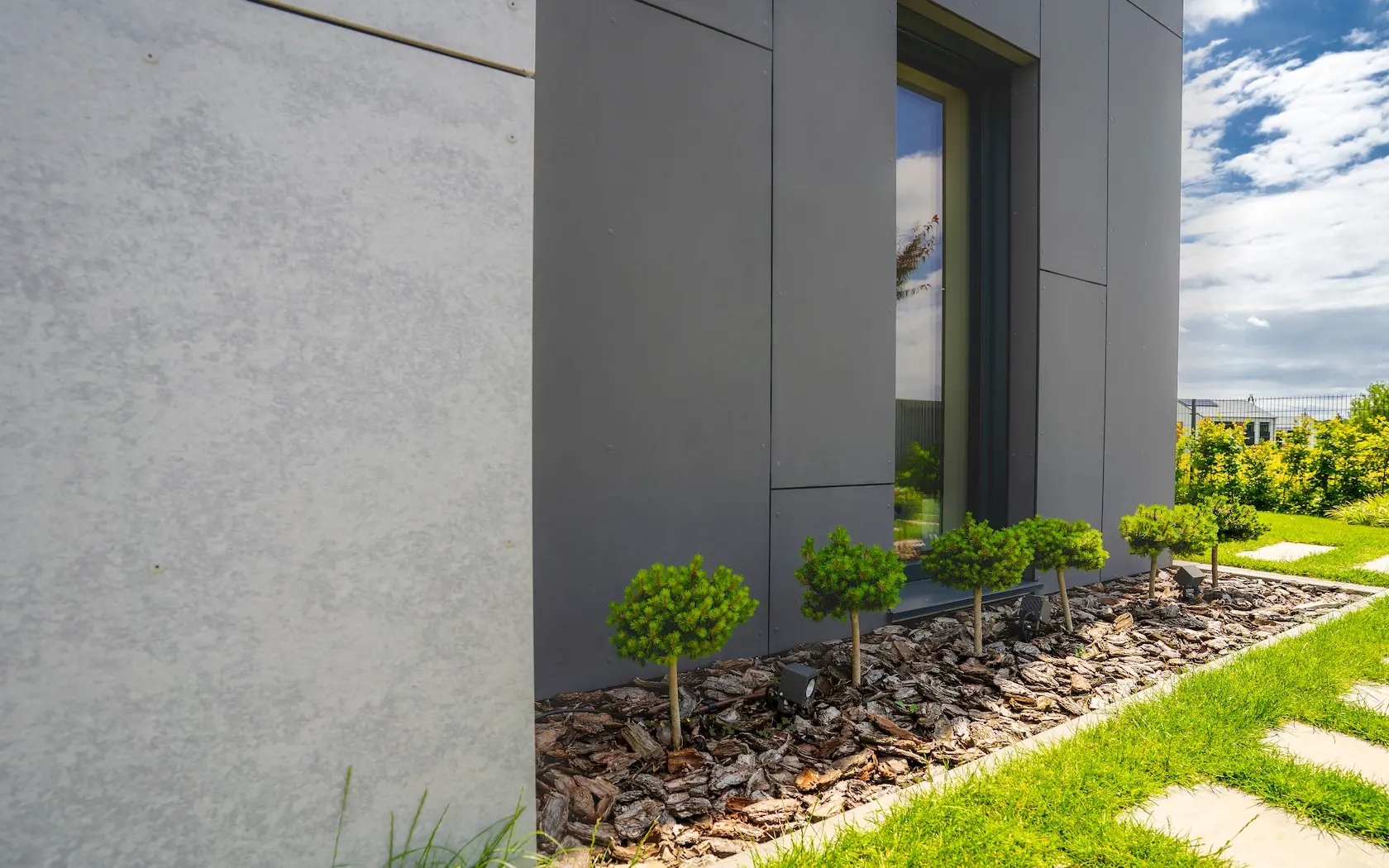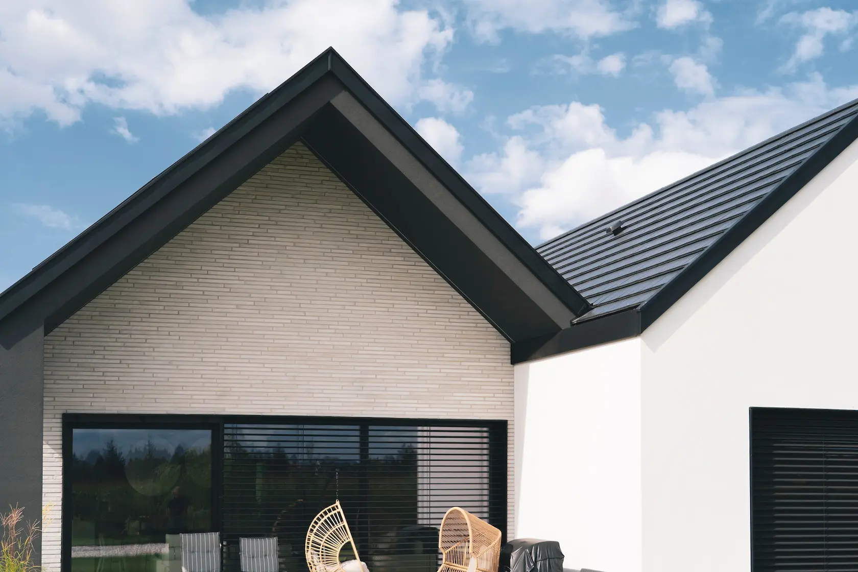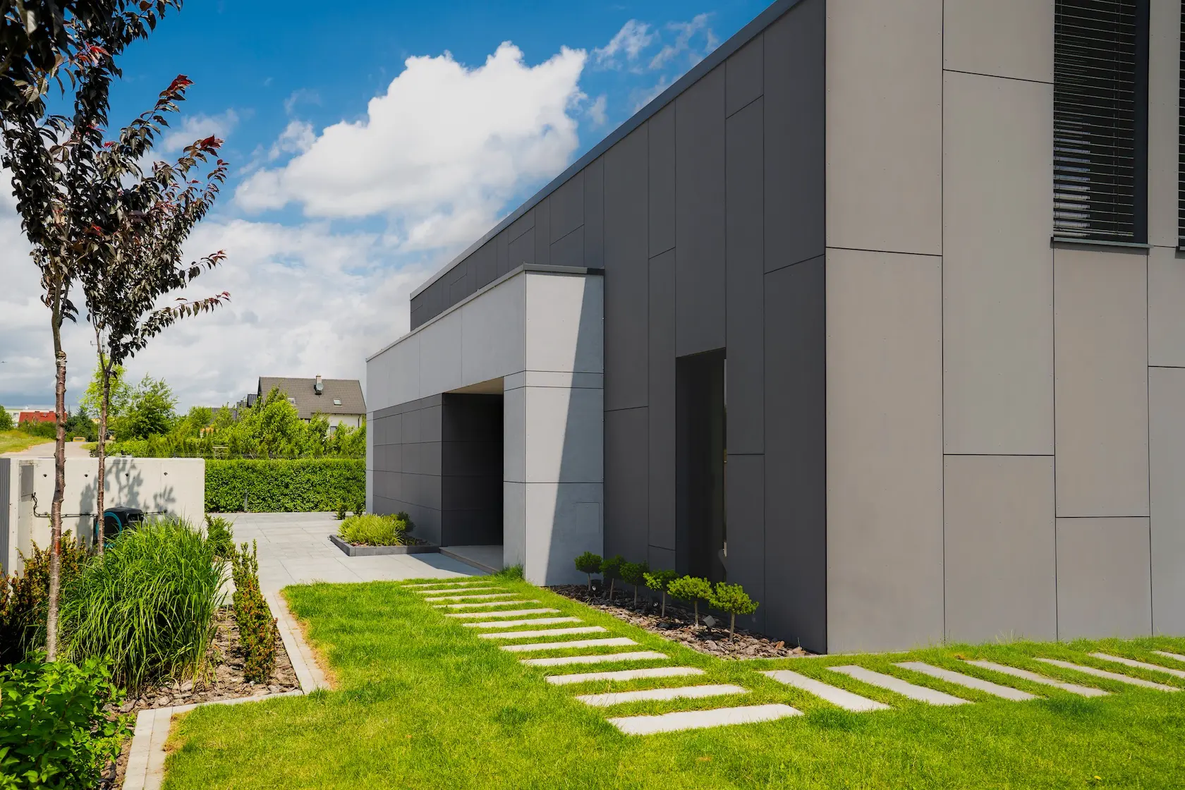 nowoczesna fasada wentylowana: wybrane partie elewacji wykonano w technologii wentylowanej z użyciem płyt włókno-cementowych Equitone. To rozwiązanie zapewnia wyjątkową trwałość, odporność na warunki atmosferyczne i nowoczesny, minimalistyczny wygląd.