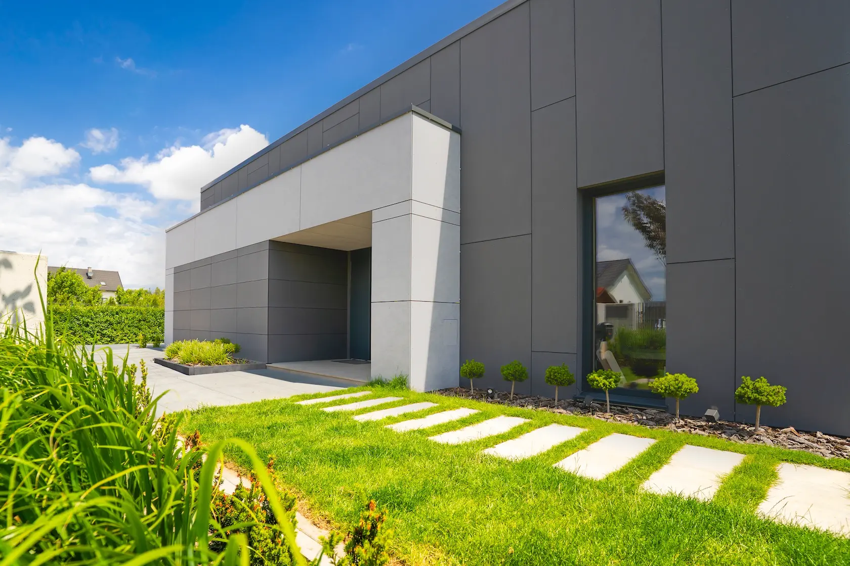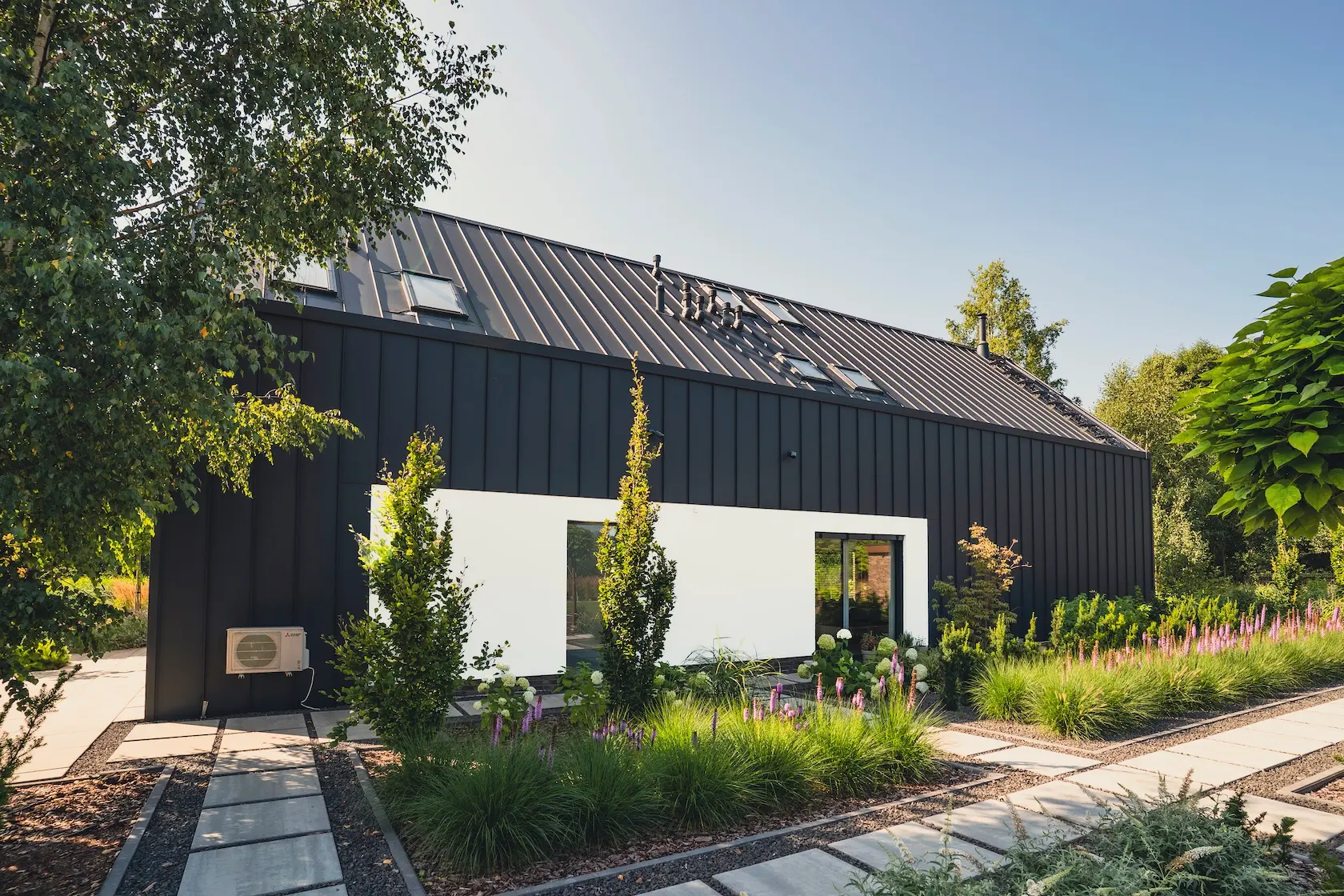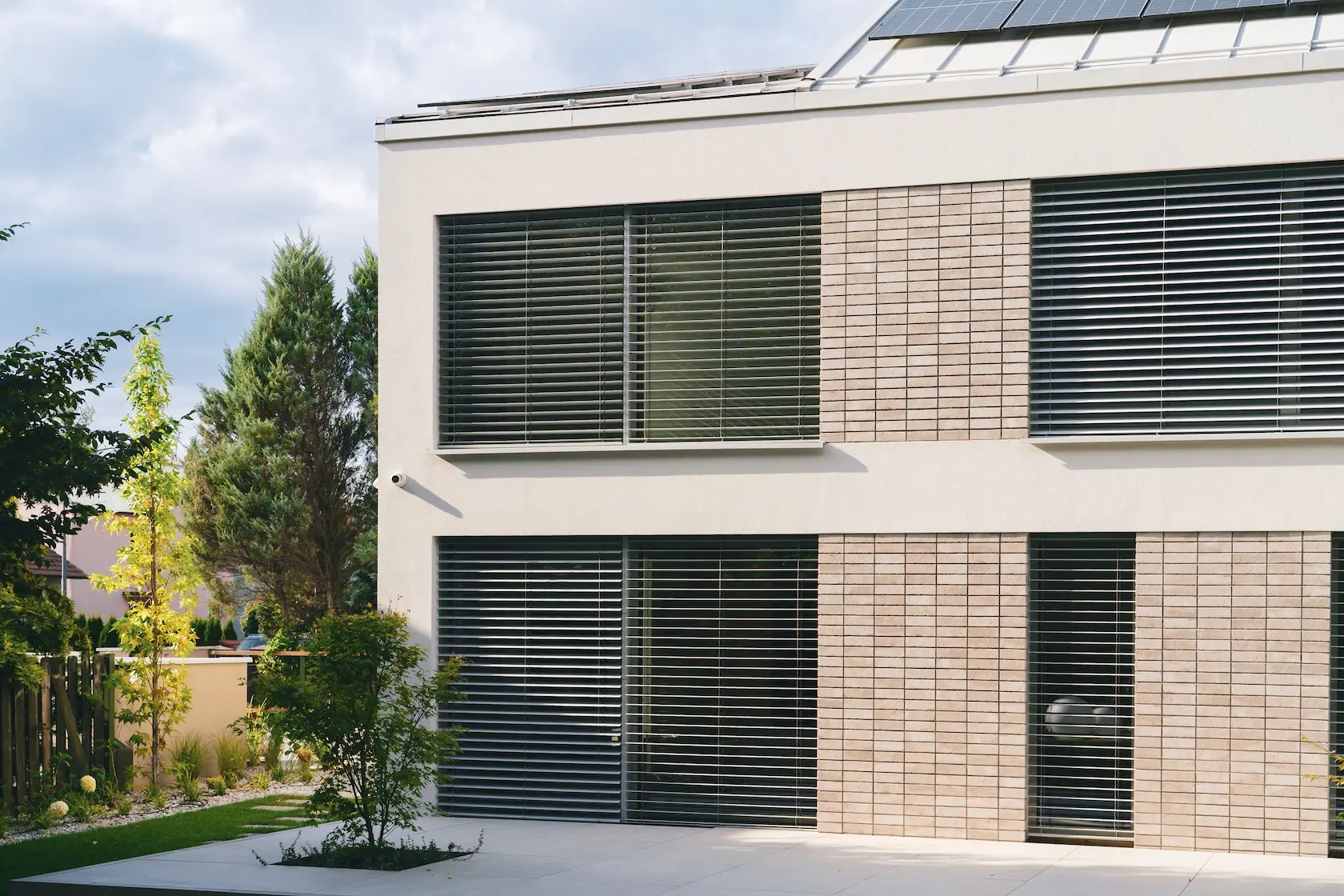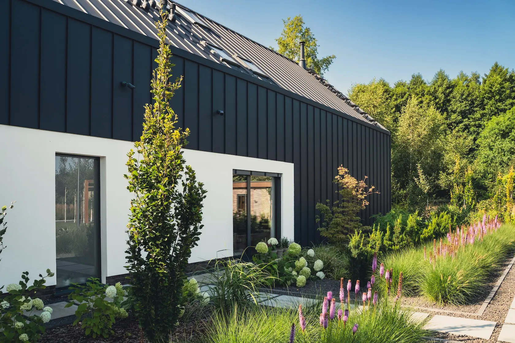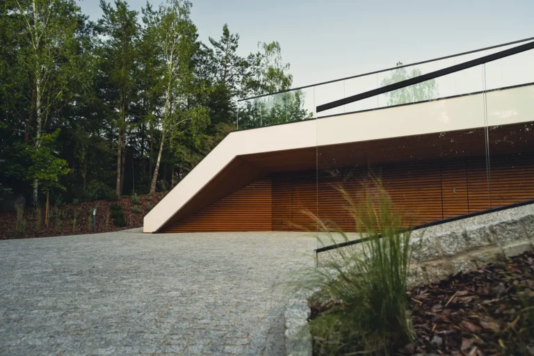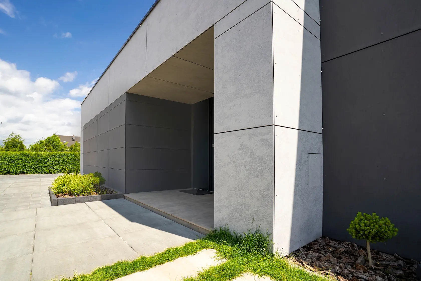 nowoczesna fasada wentylowana: wybrane partie elewacji wykonano w technologii wentylowanej z użyciem płyt włókno-cementowych Equitone. To rozwiązanie zapewnia wyjątkową trwałość, odporność na warunki atmosferyczne i nowoczesny, minimalistyczny wygląd.