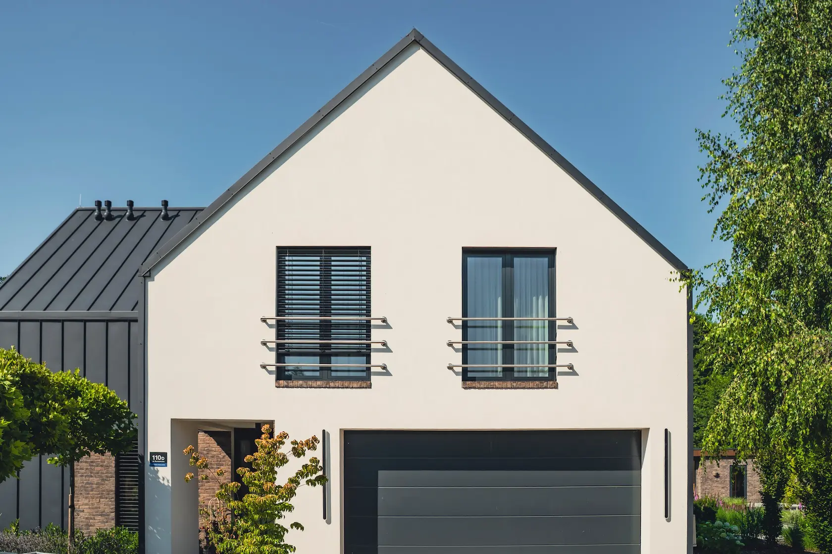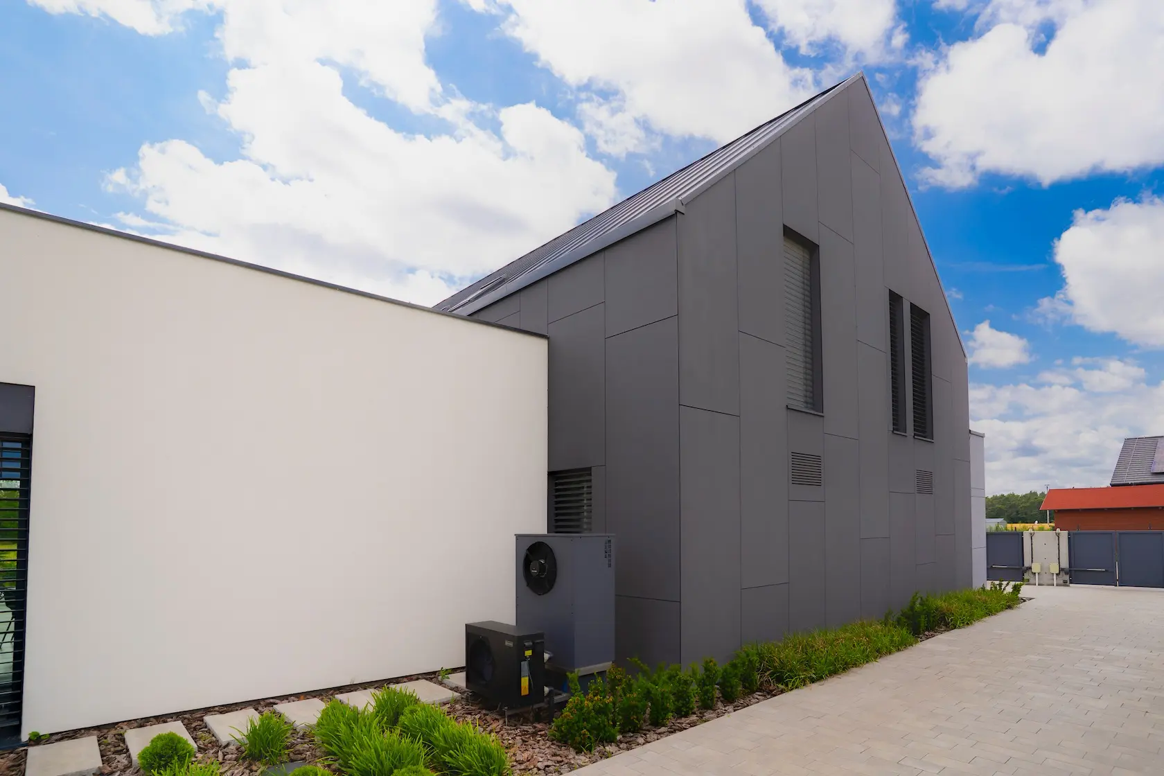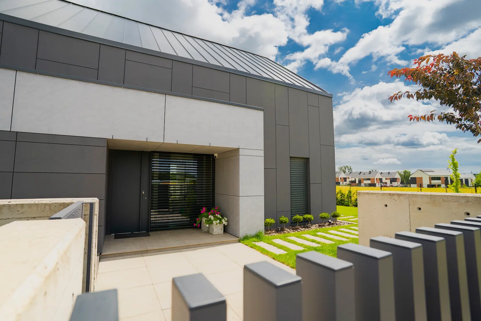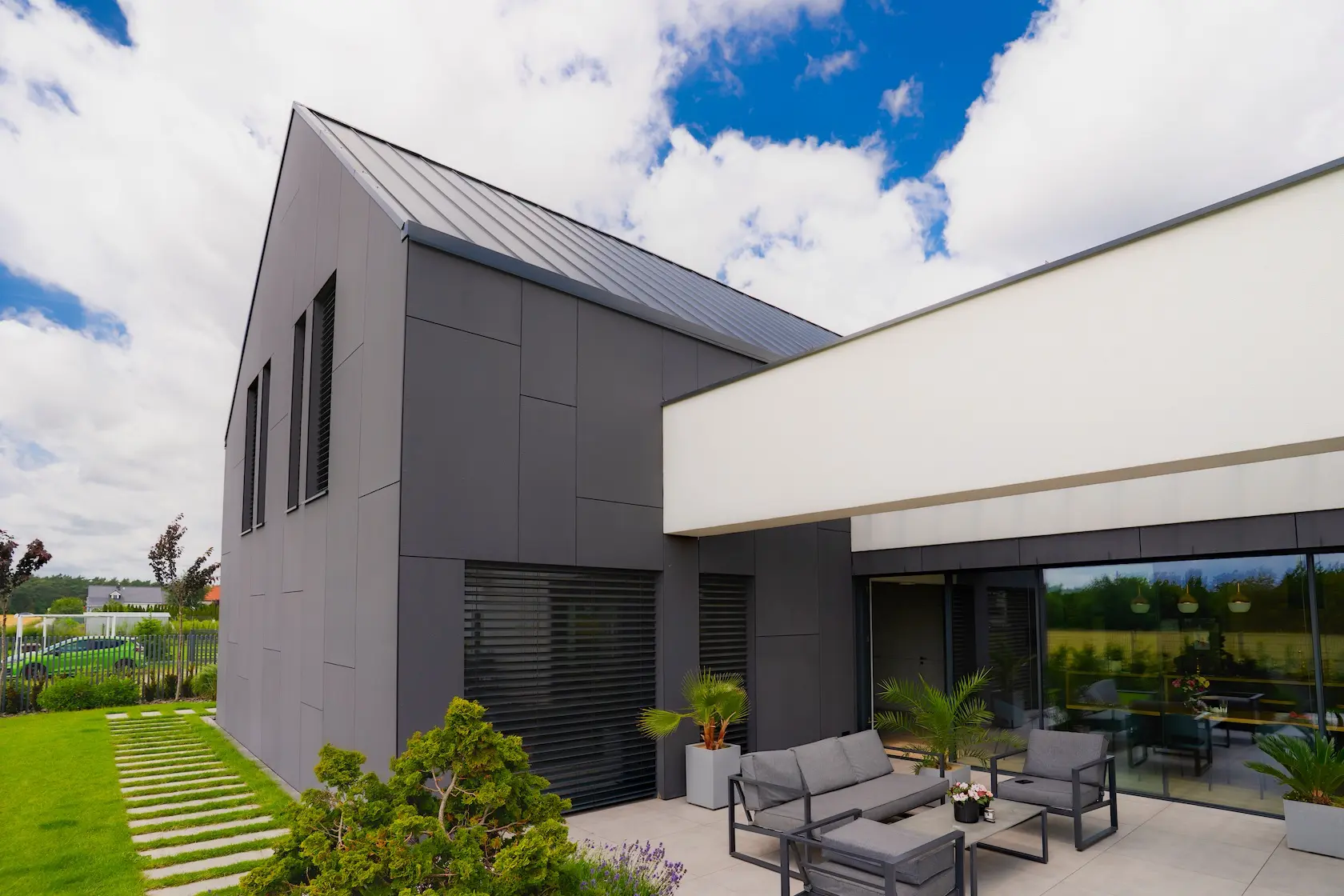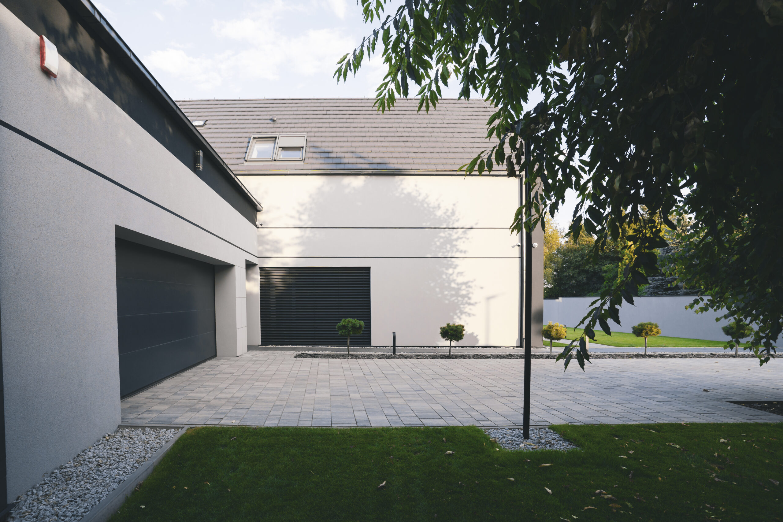 nowoczesna fasada wentylowana: wybrane partie elewacji wykonano w technologii wentylowanej z użyciem płyt włókno-cementowych Equitone. To rozwiązanie zapewnia wyjątkową trwałość, odporność na warunki atmosferyczne i nowoczesny, minimalistyczny wygląd.