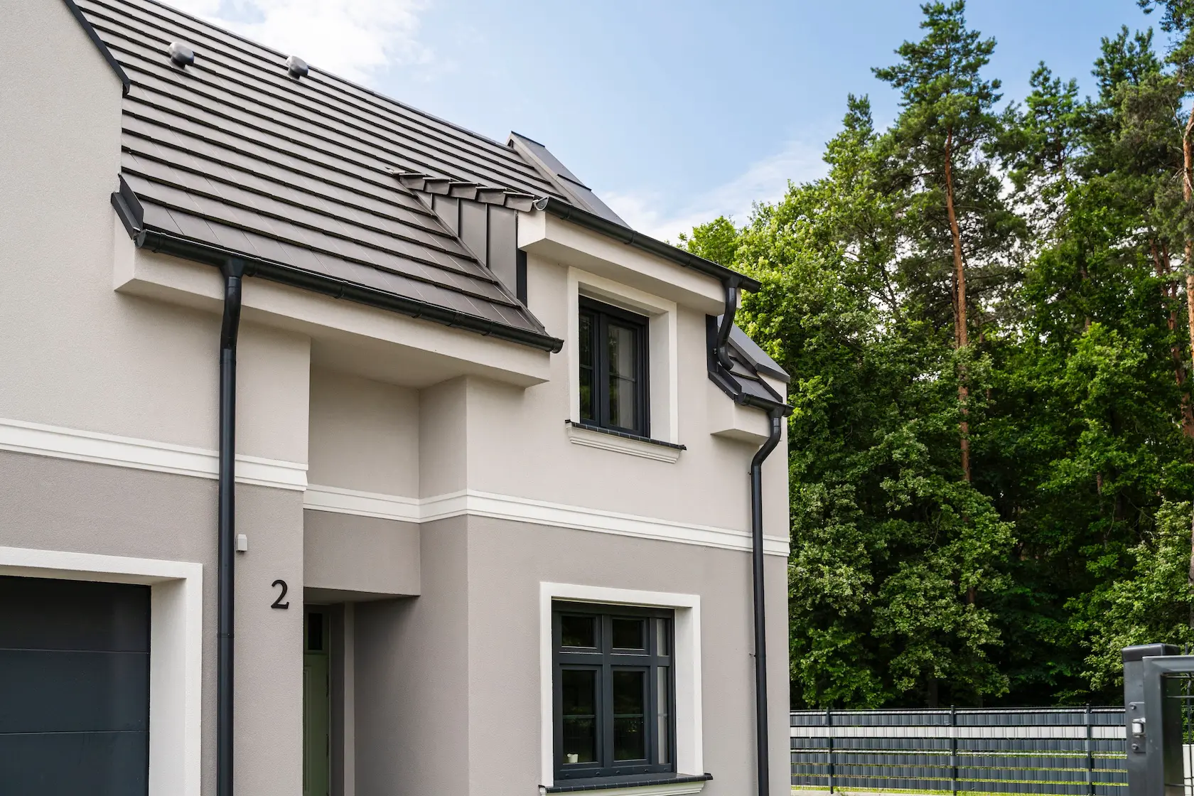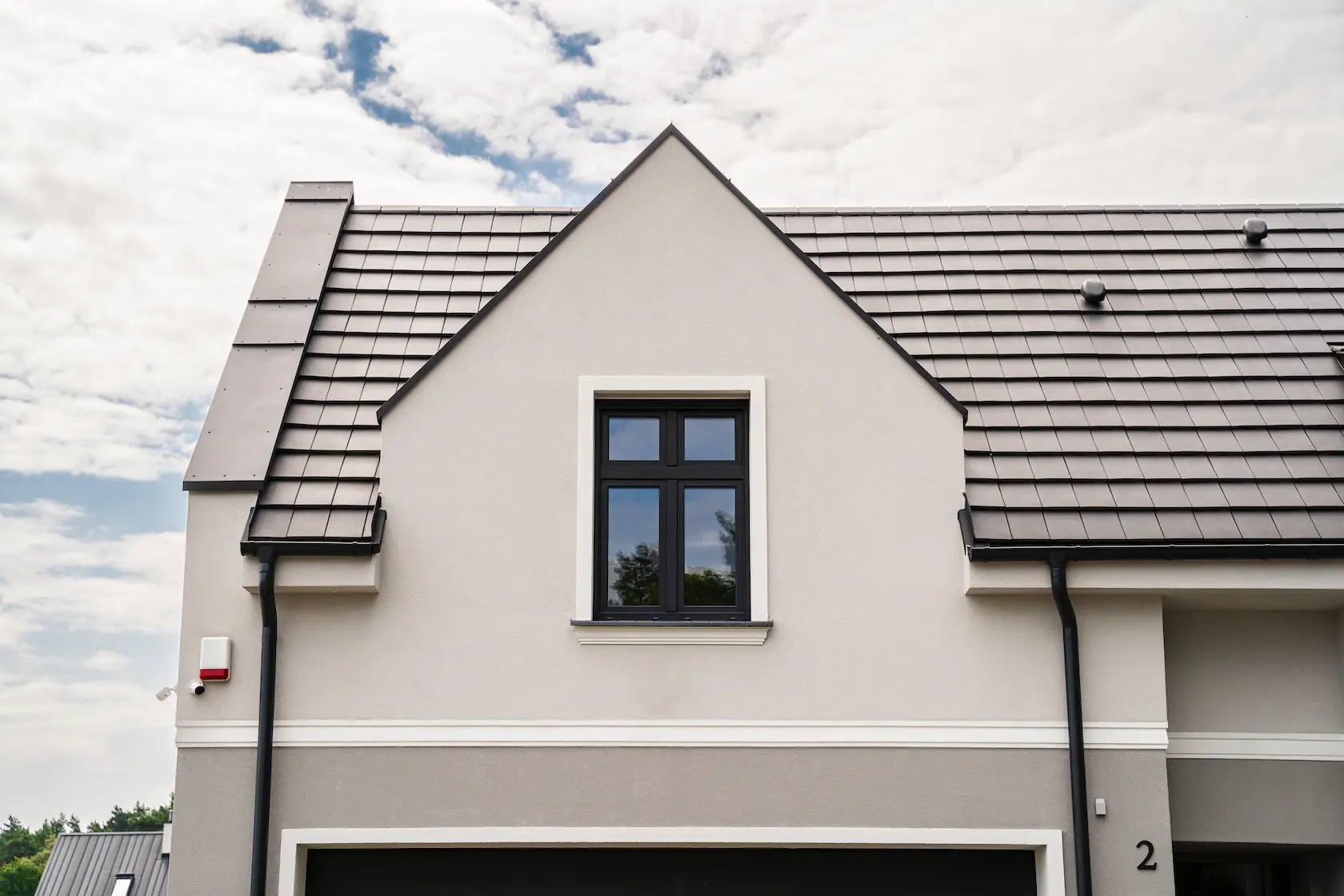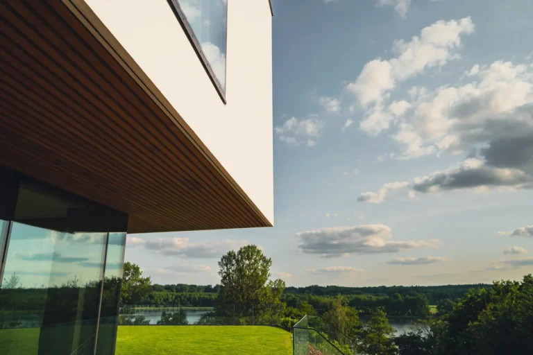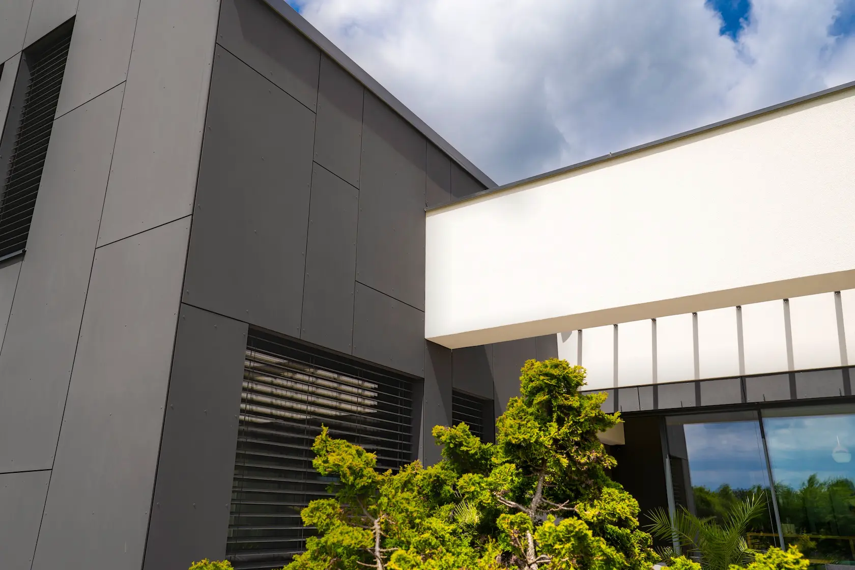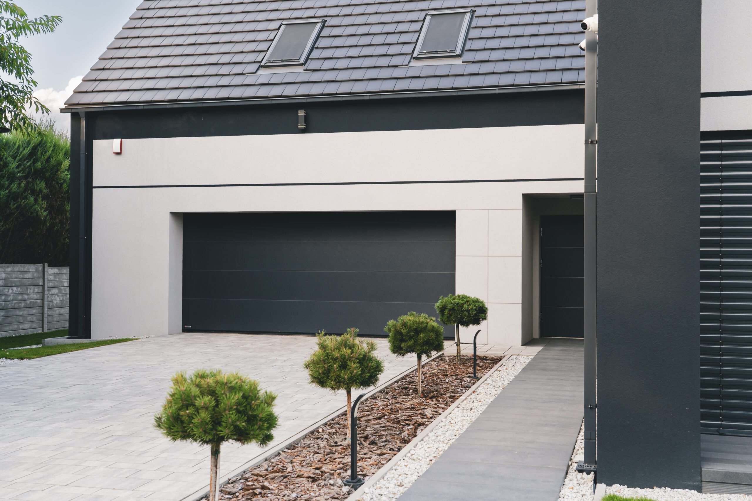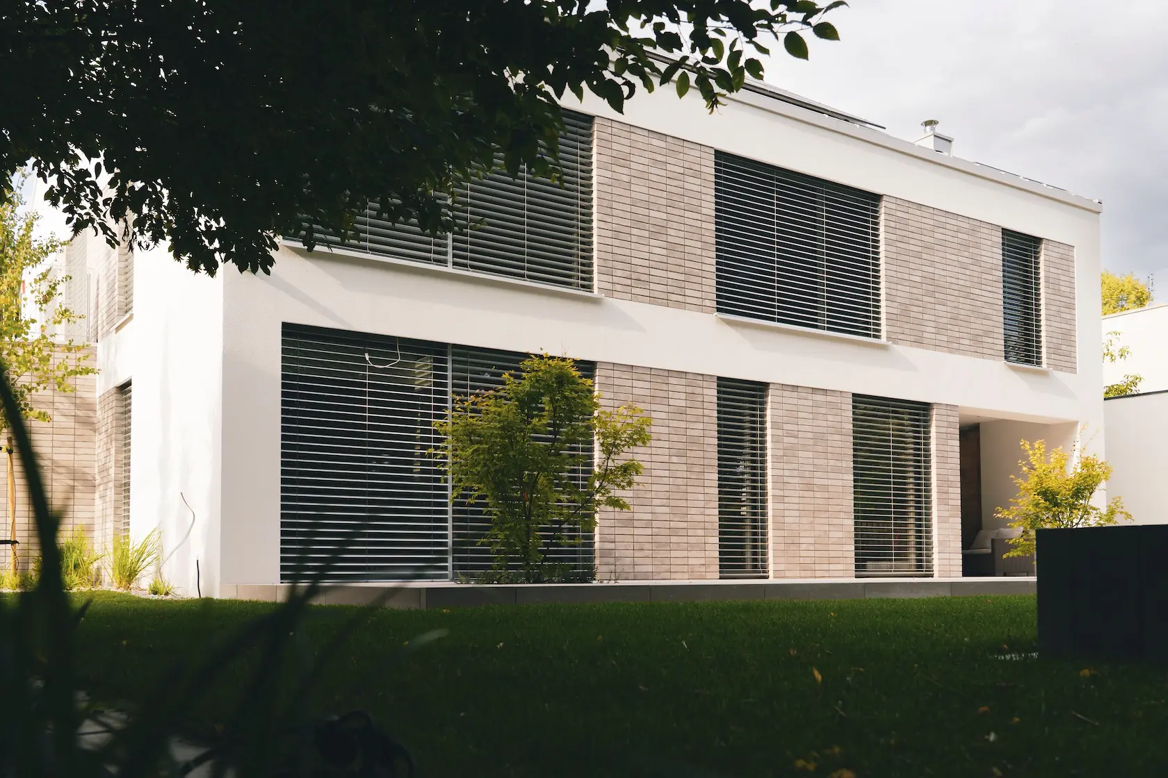 nowoczesna fasada wentylowana: wybrane partie elewacji wykonano w technologii wentylowanej z użyciem płyt włókno-cementowych Equitone. To rozwiązanie zapewnia wyjątkową trwałość, odporność na warunki atmosferyczne i nowoczesny, minimalistyczny wygląd.