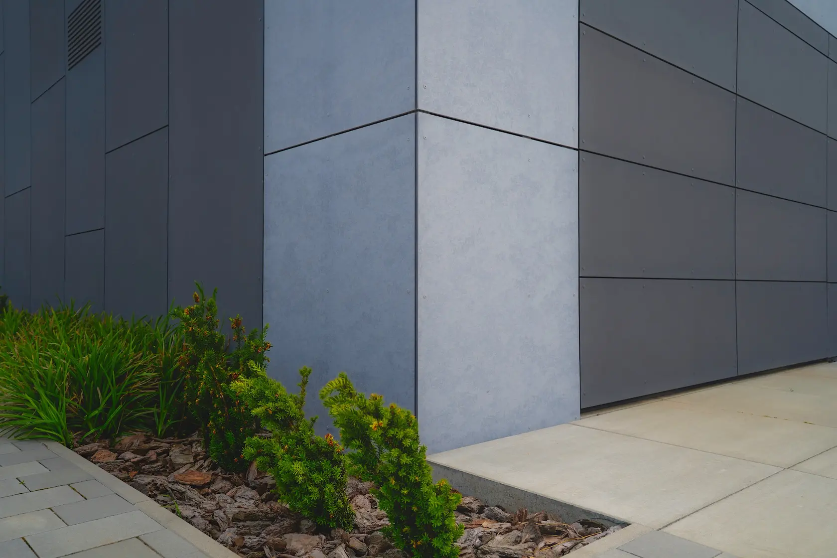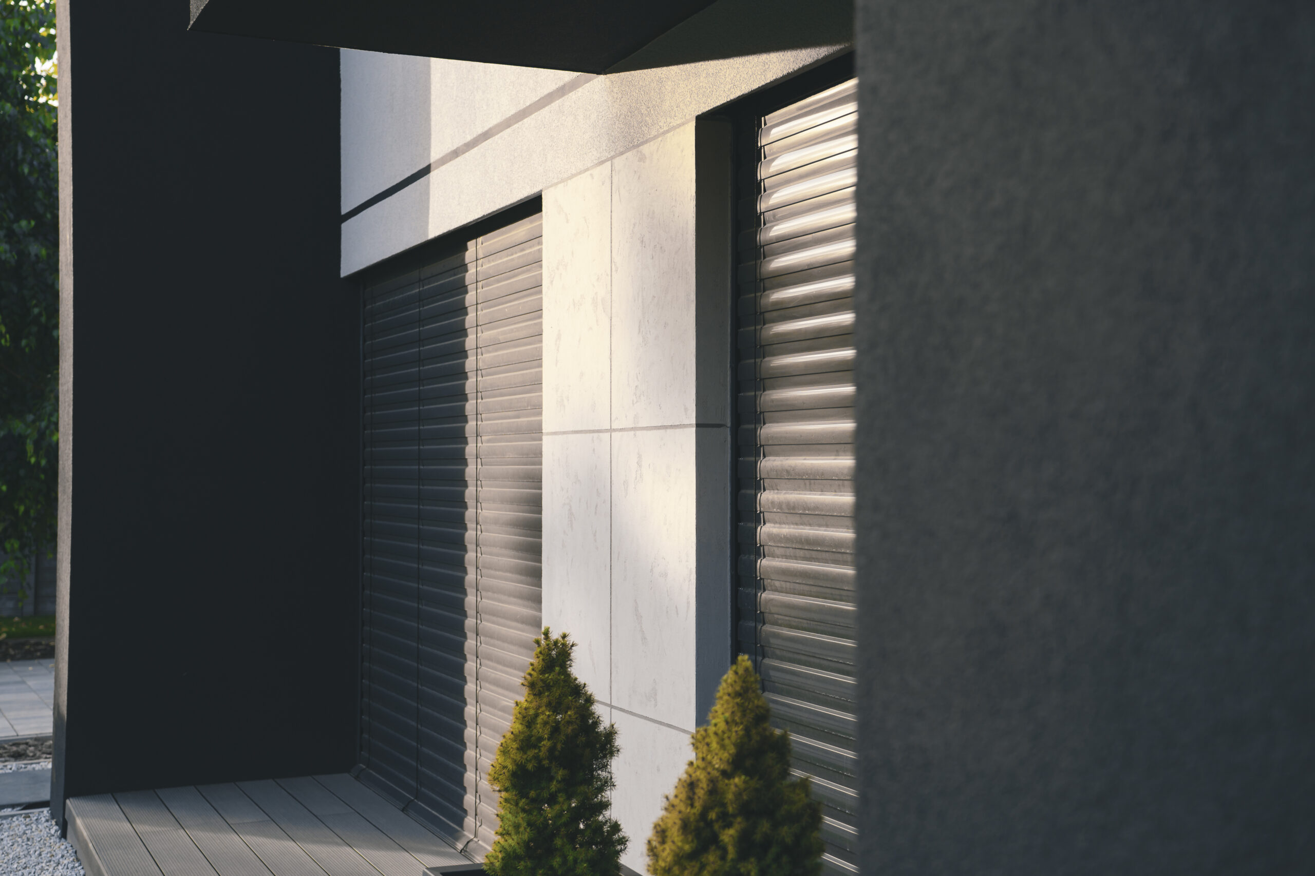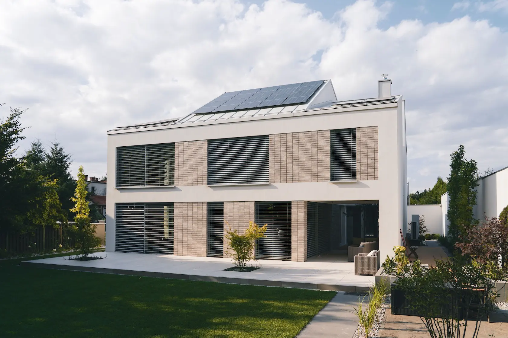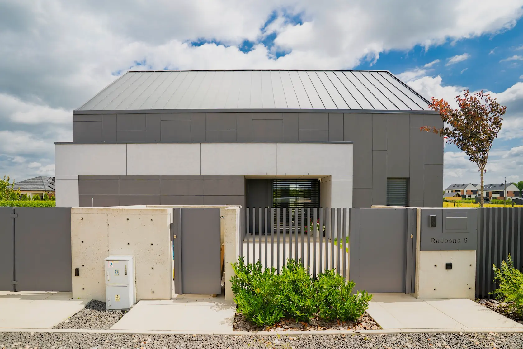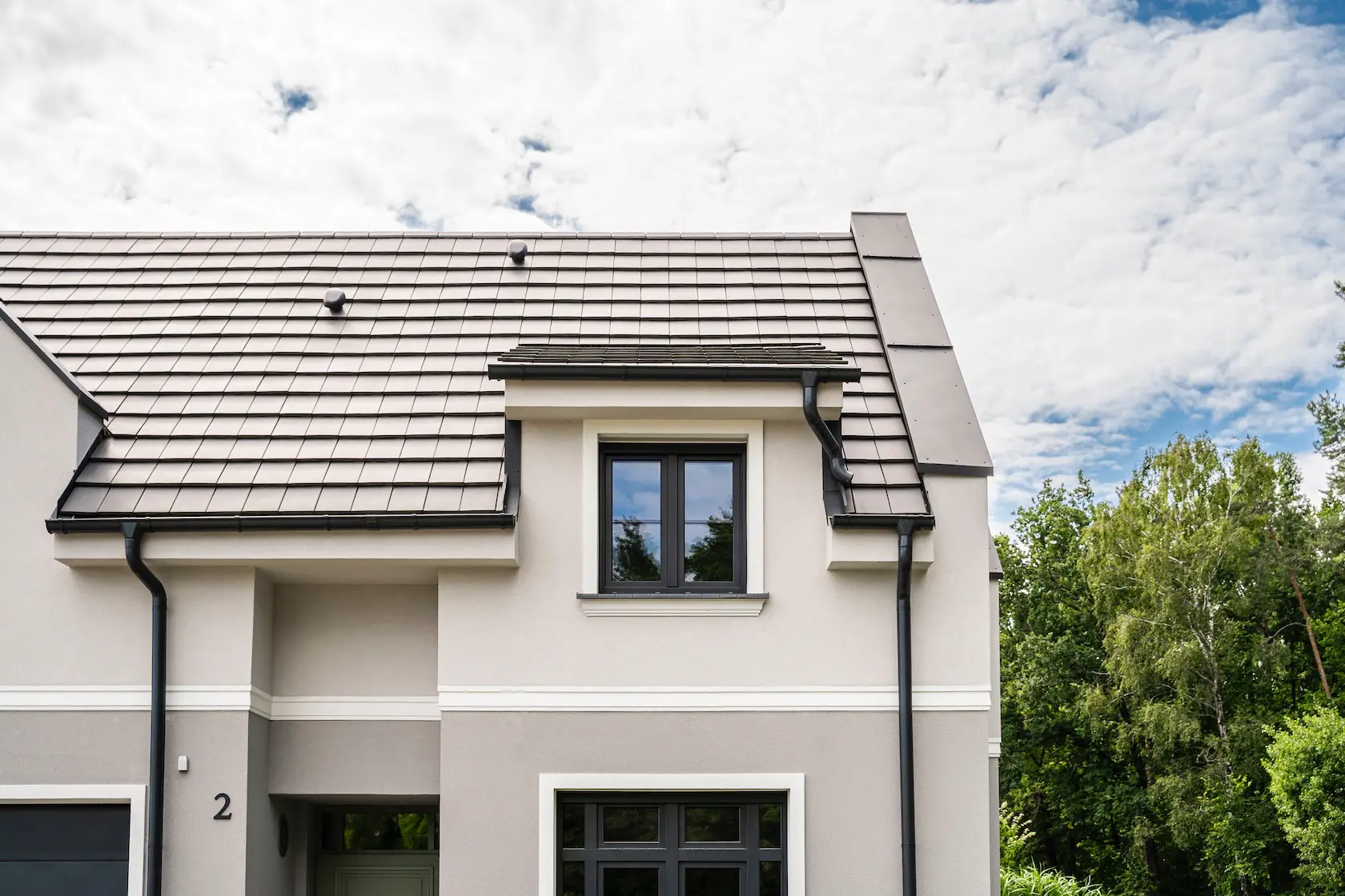 nowoczesna fasada wentylowana: wybrane partie elewacji wykonano w technologii wentylowanej z użyciem płyt włókno-cementowych Equitone. To rozwiązanie zapewnia wyjątkową trwałość, odporność na warunki atmosferyczne i nowoczesny, minimalistyczny wygląd.