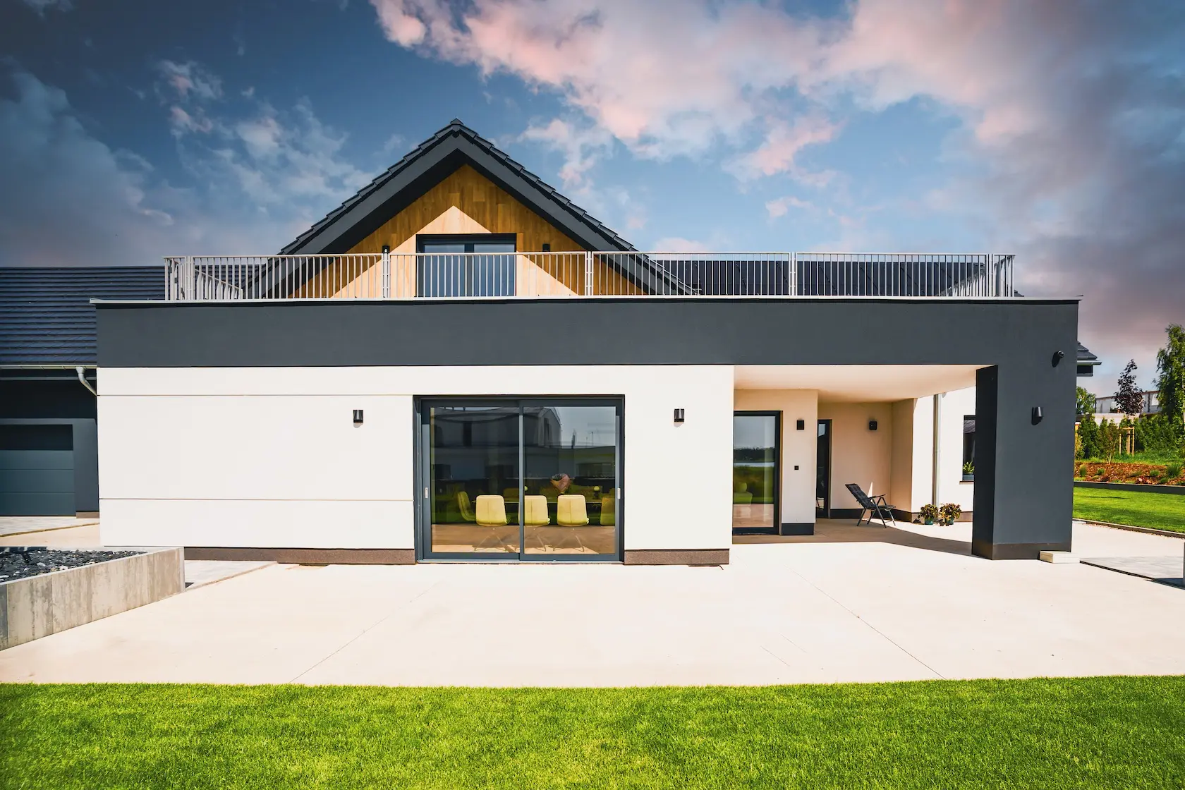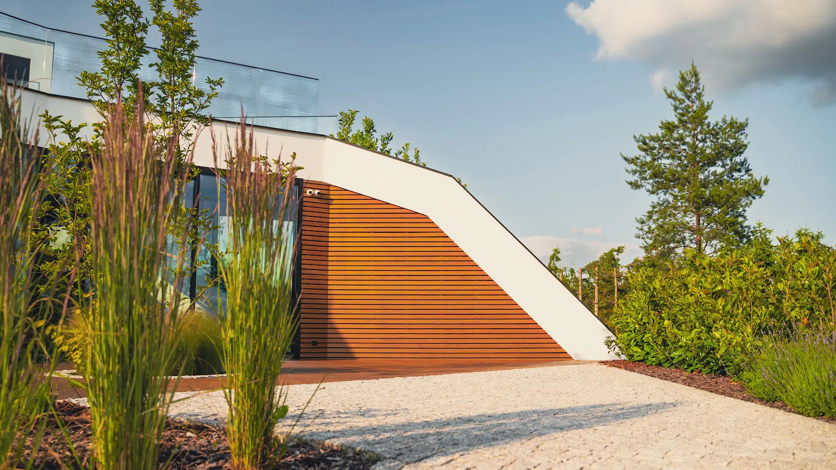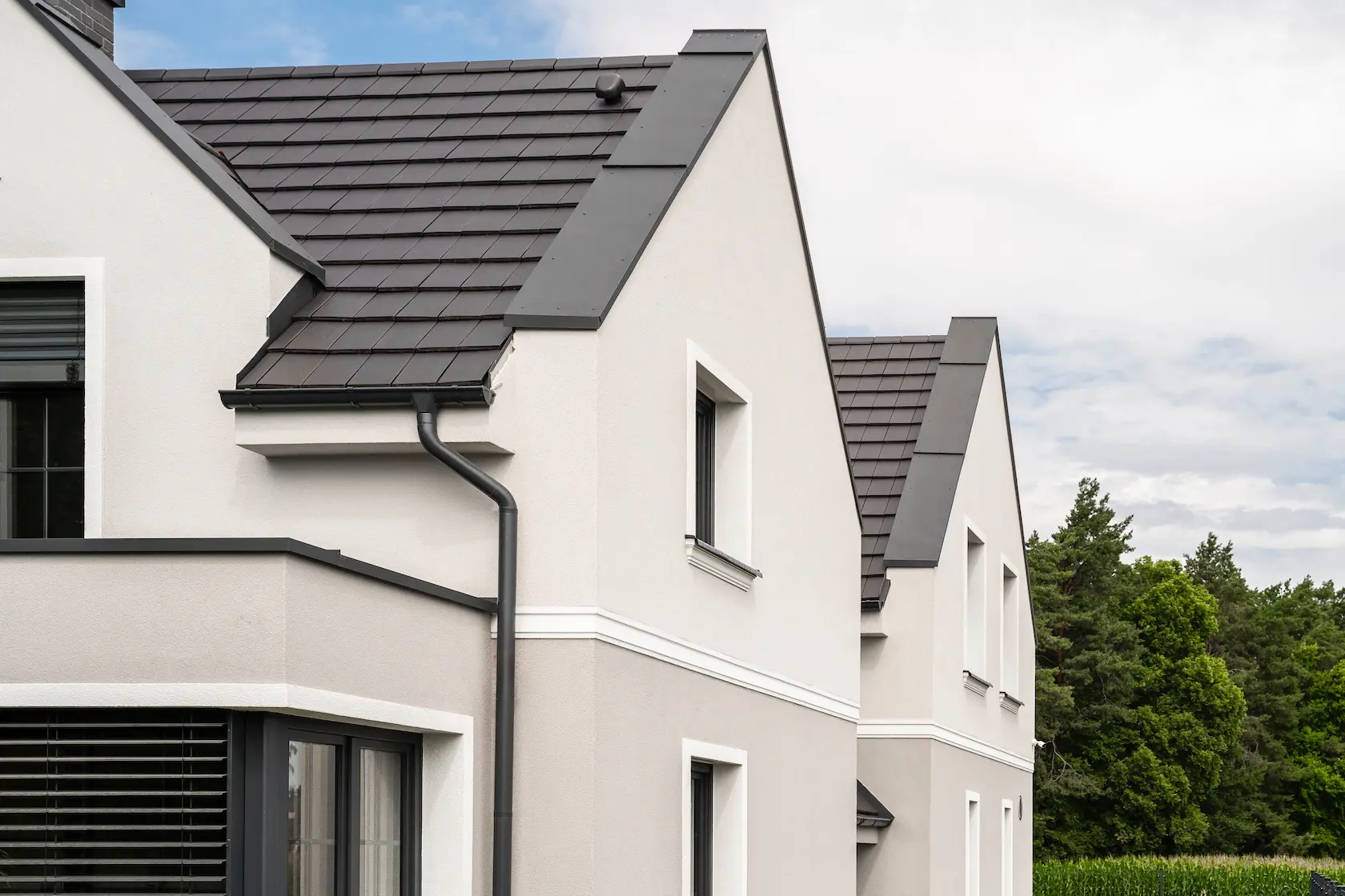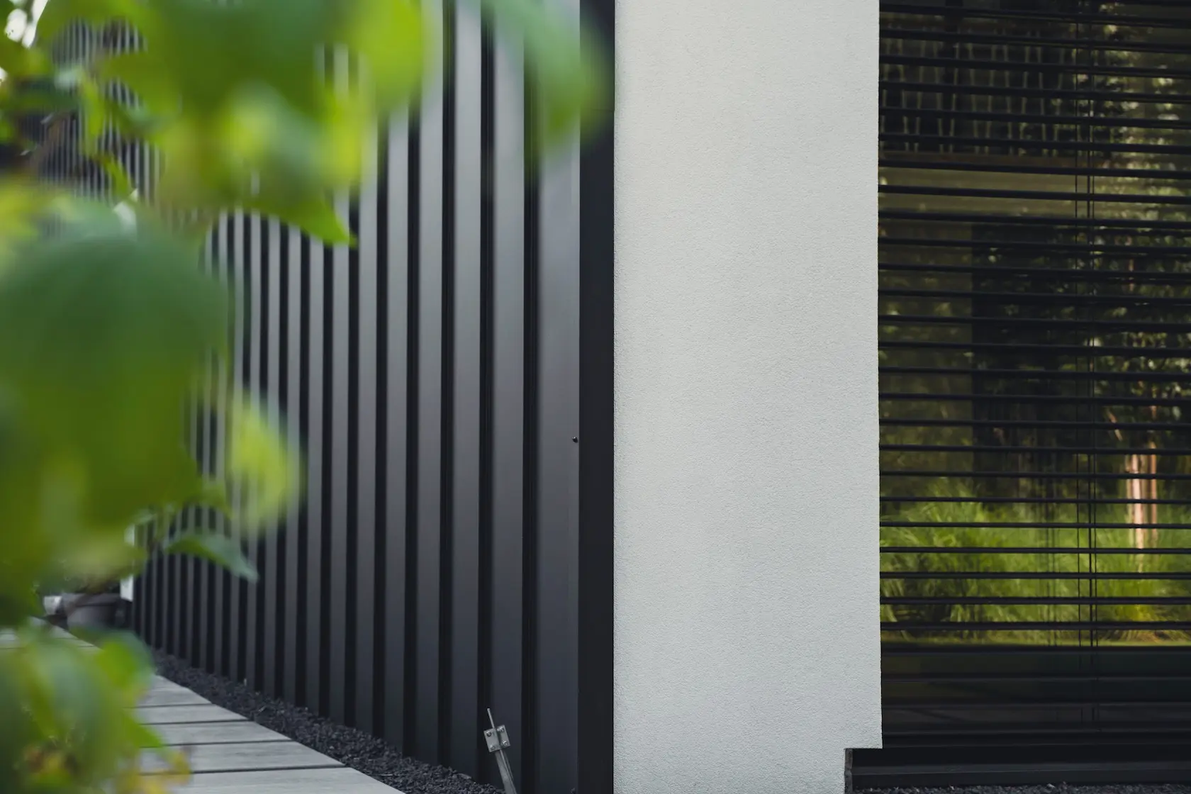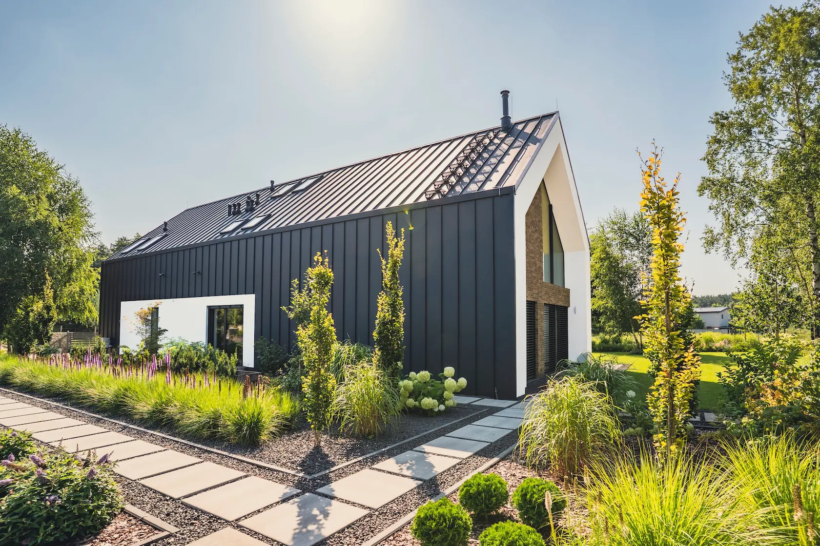 nowoczesna fasada wentylowana: wybrane partie elewacji wykonano w technologii wentylowanej z użyciem płyt włókno-cementowych Equitone. To rozwiązanie zapewnia wyjątkową trwałość, odporność na warunki atmosferyczne i nowoczesny, minimalistyczny wygląd.