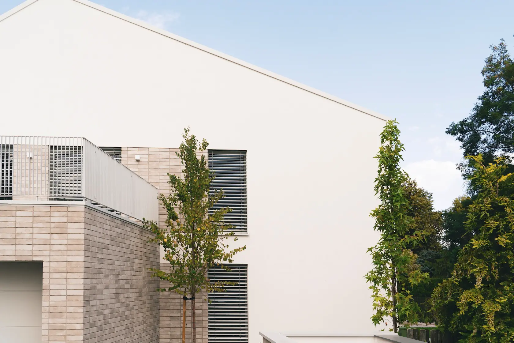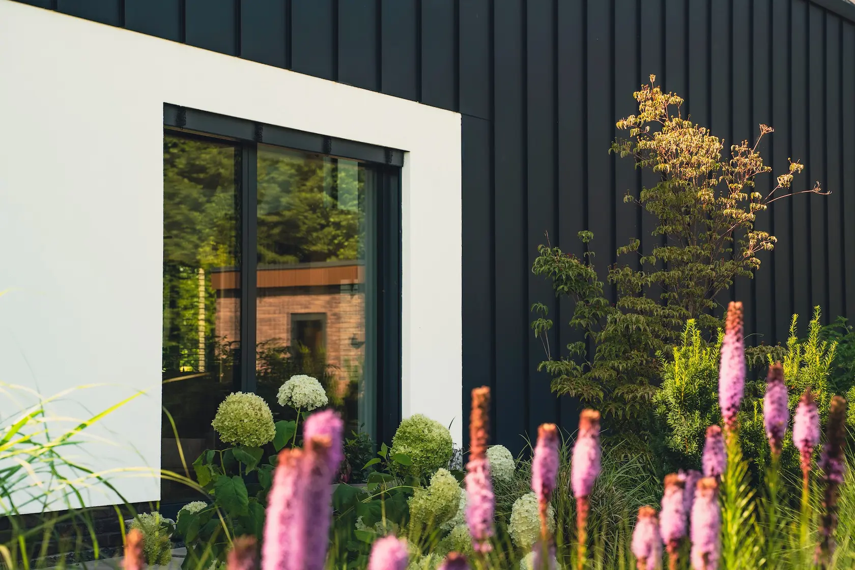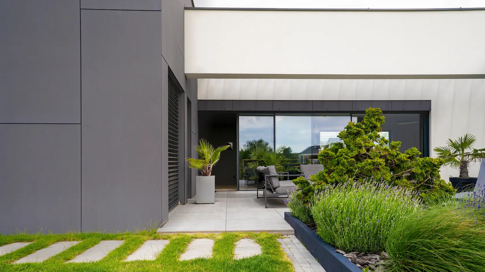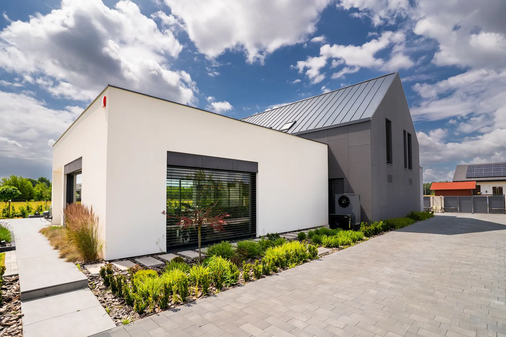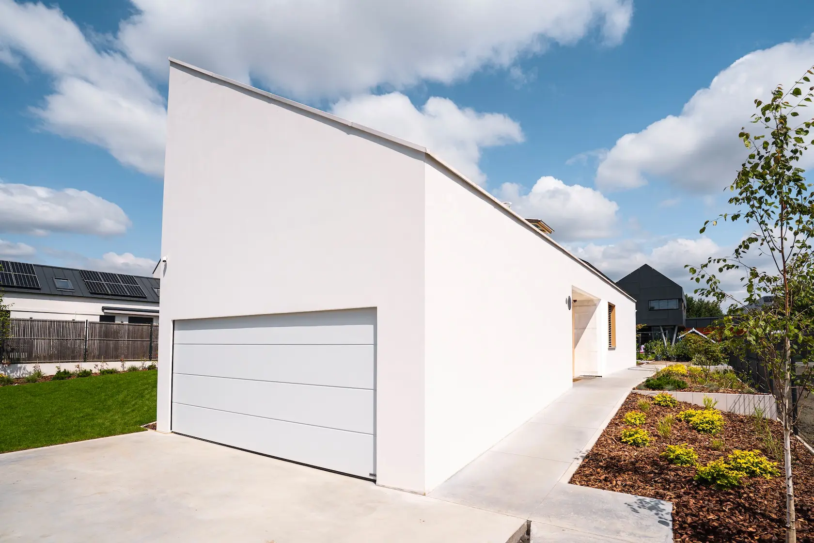 nowoczesna fasada wentylowana: wybrane partie elewacji wykonano w technologii wentylowanej z użyciem płyt włókno-cementowych Equitone. To rozwiązanie zapewnia wyjątkową trwałość, odporność na warunki atmosferyczne i nowoczesny, minimalistyczny wygląd.