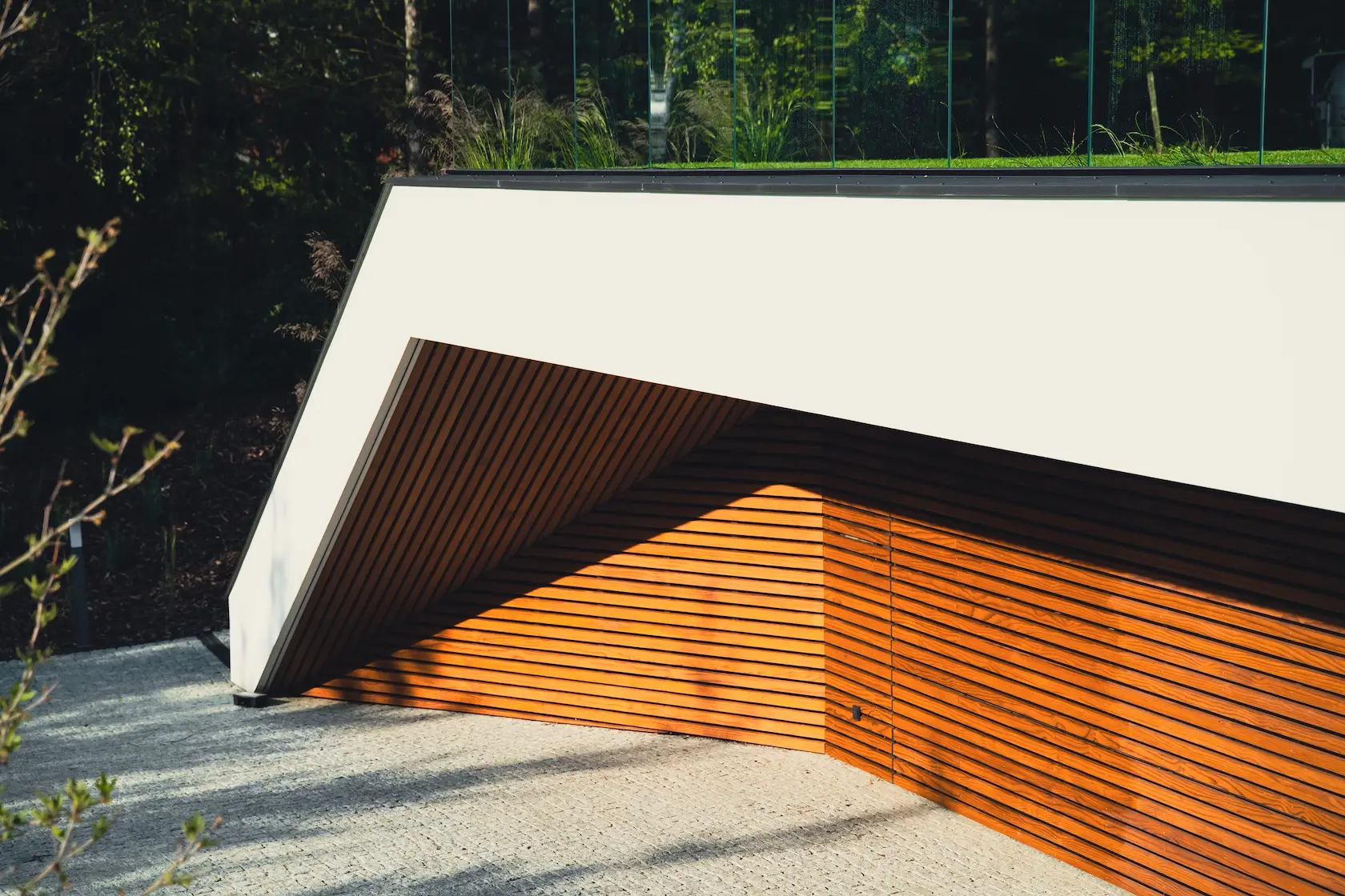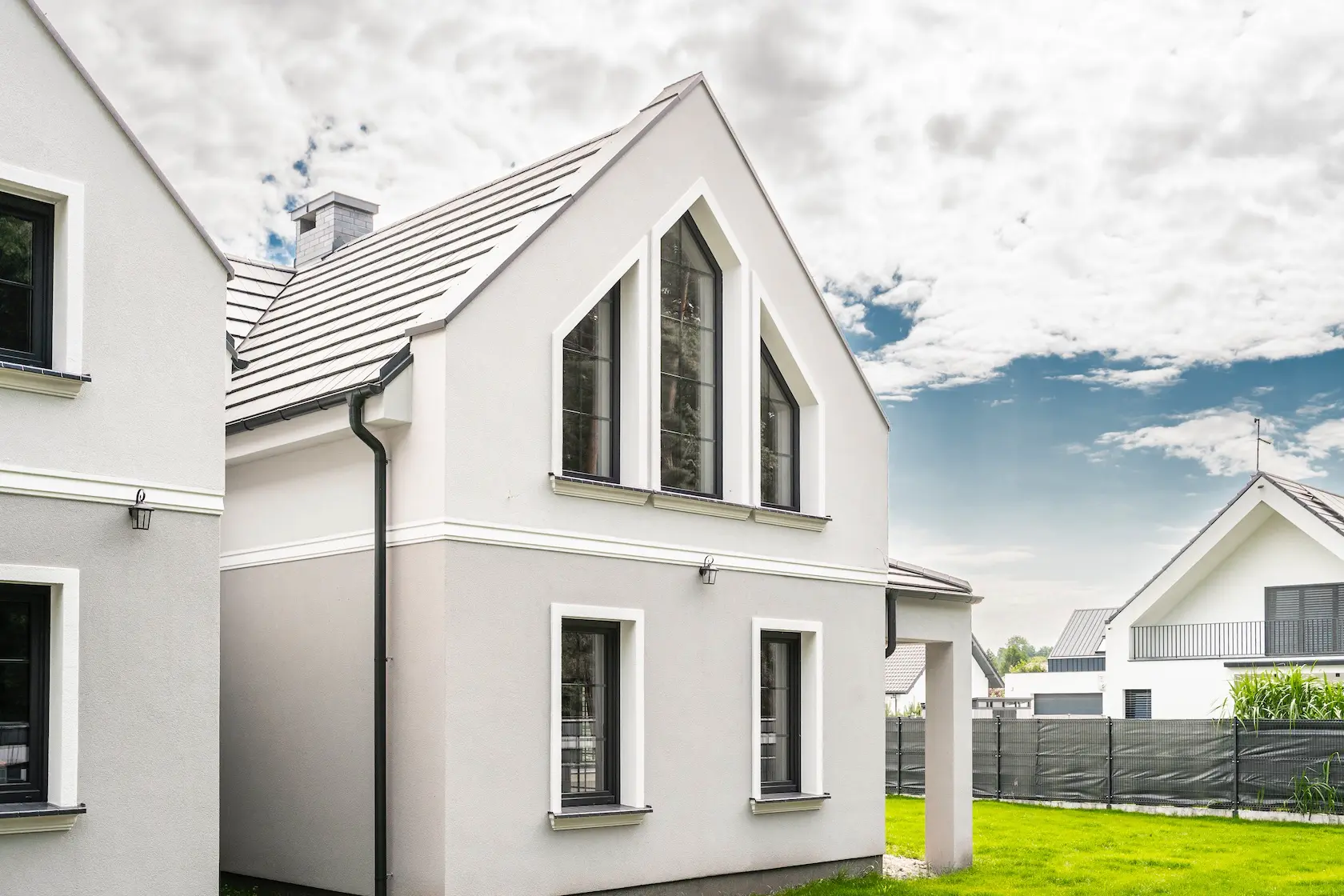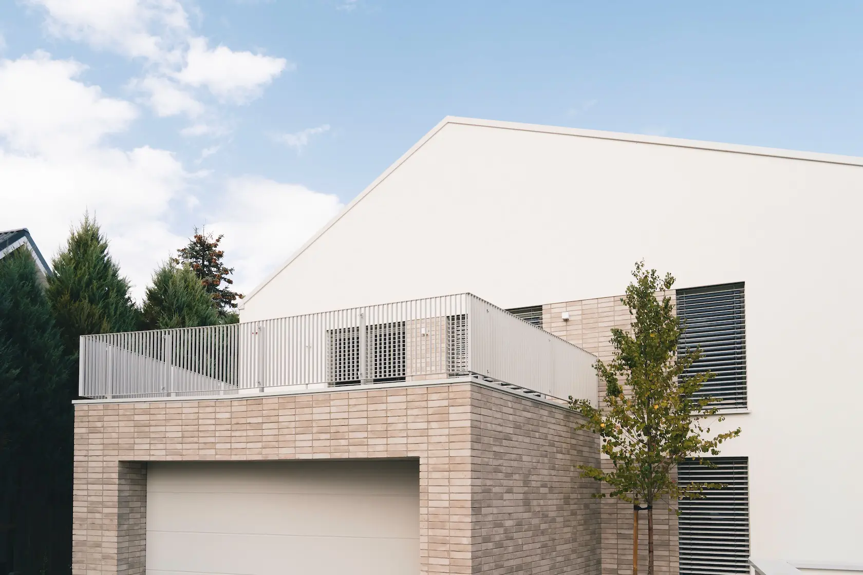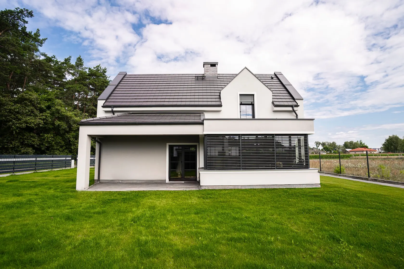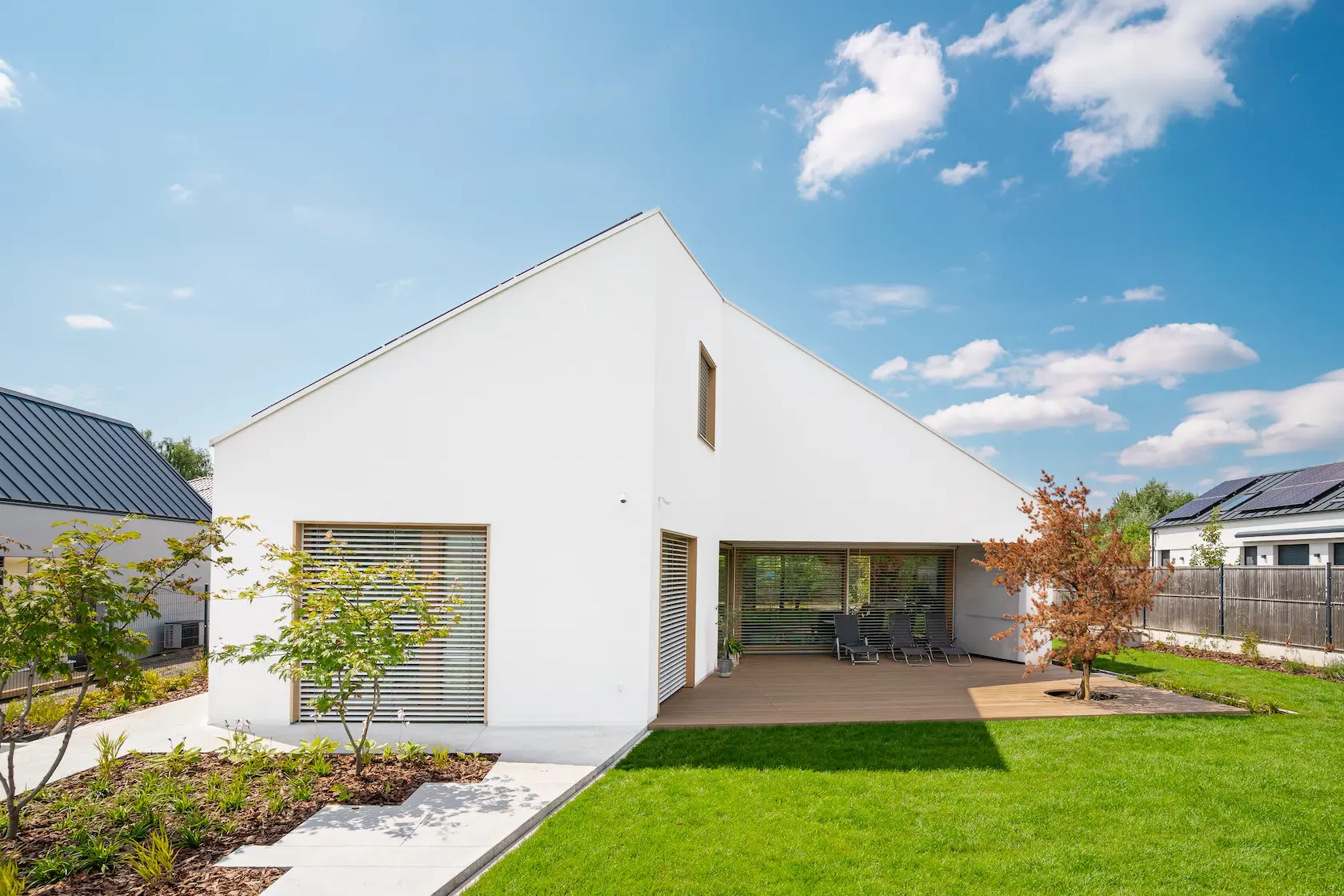nowoczesna fasada wentylowana: wybrane partie elewacji wykonano w technologii wentylowanej z użyciem płyt włókno-cementowych Equitone. To rozwiązanie zapewnia wyjątkową trwałość, odporność na warunki atmosferyczne i nowoczesny, minimalistyczny wygląd.