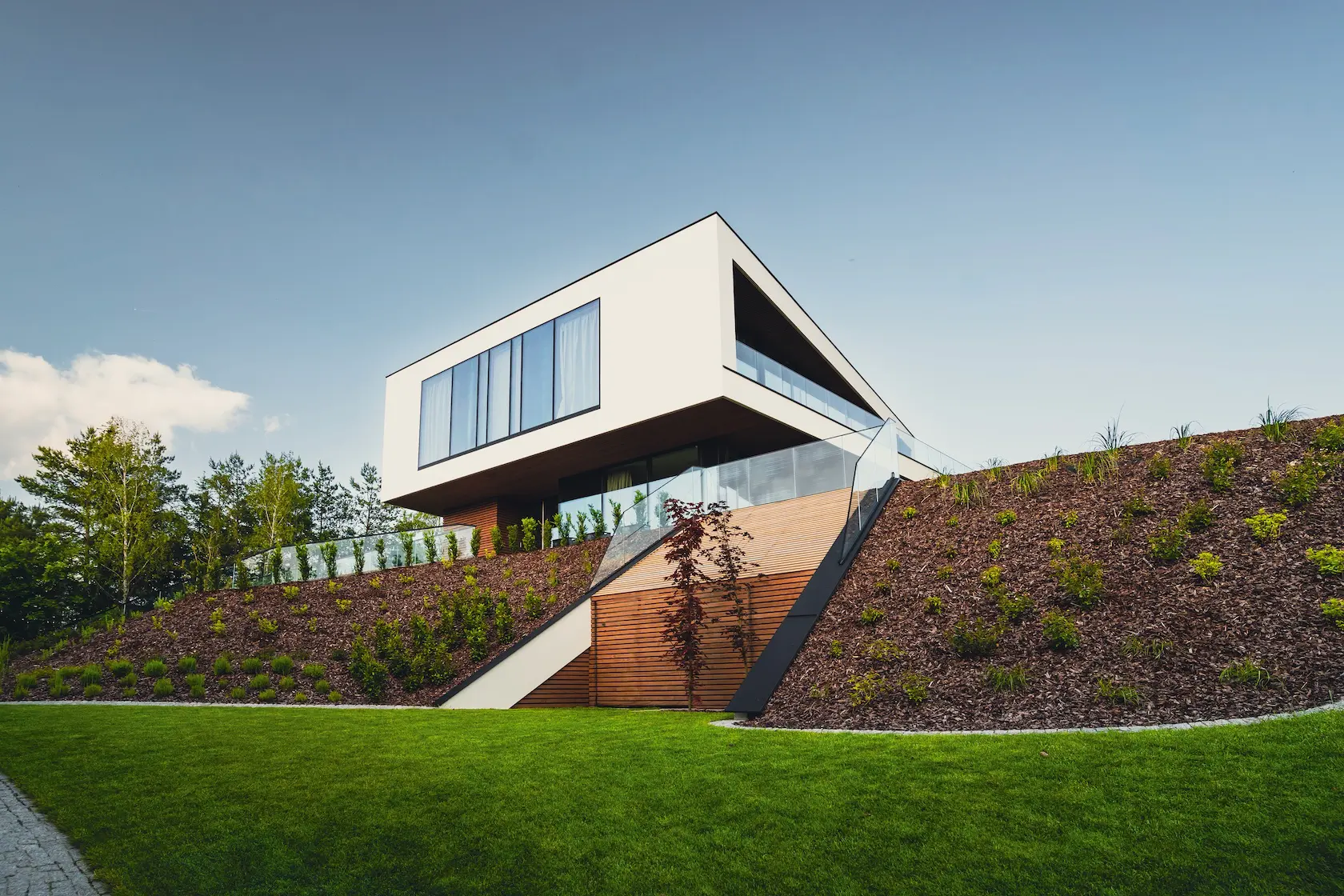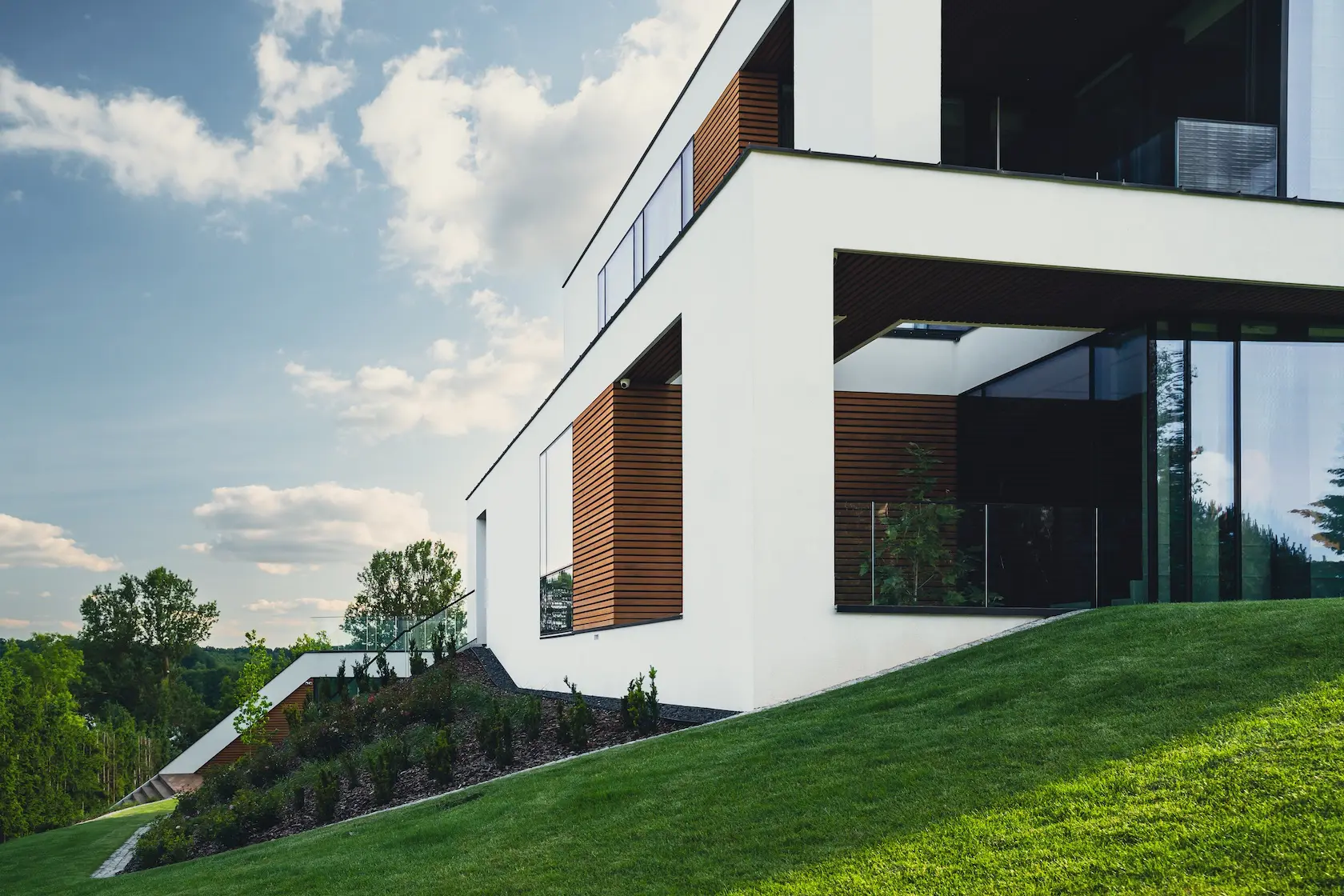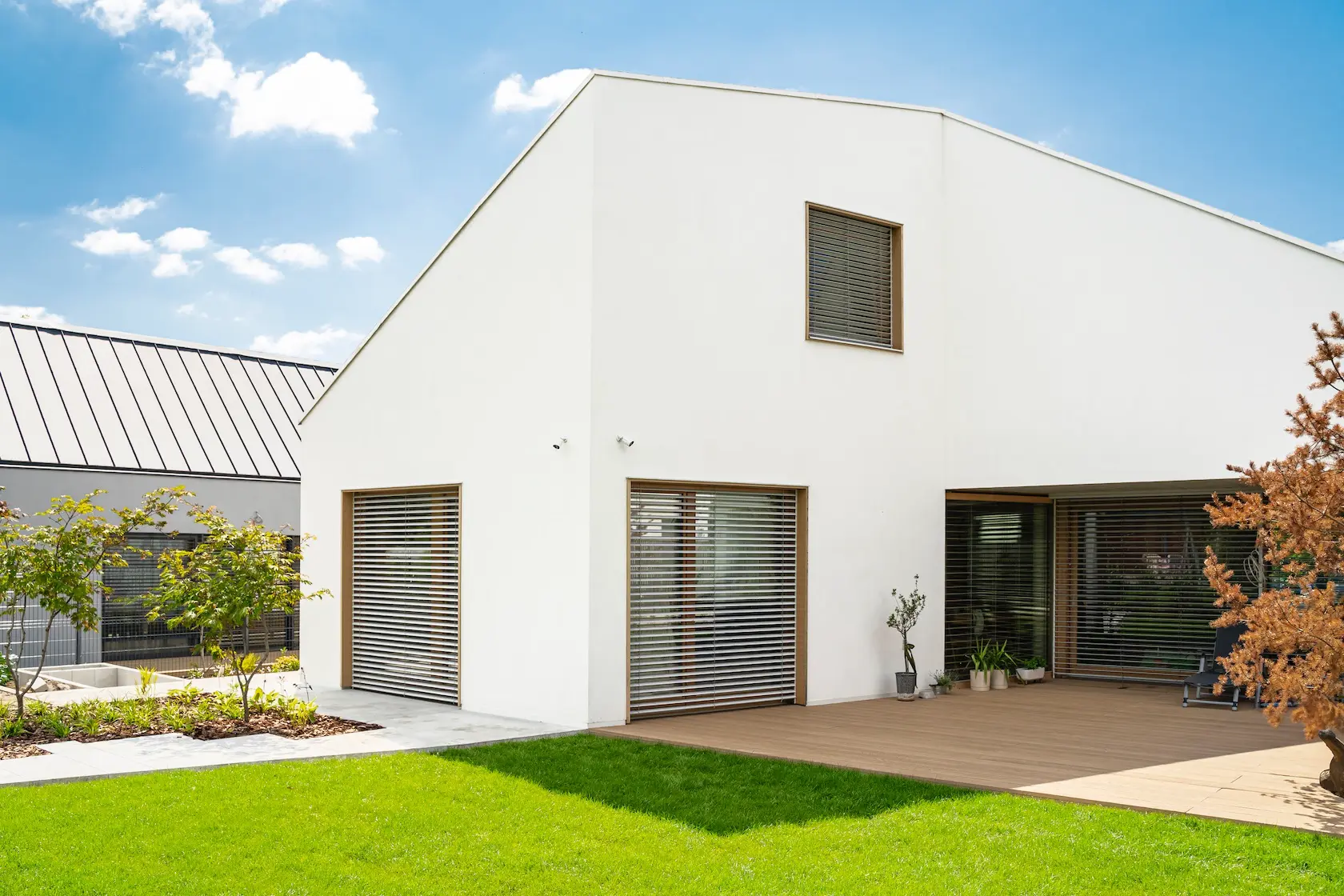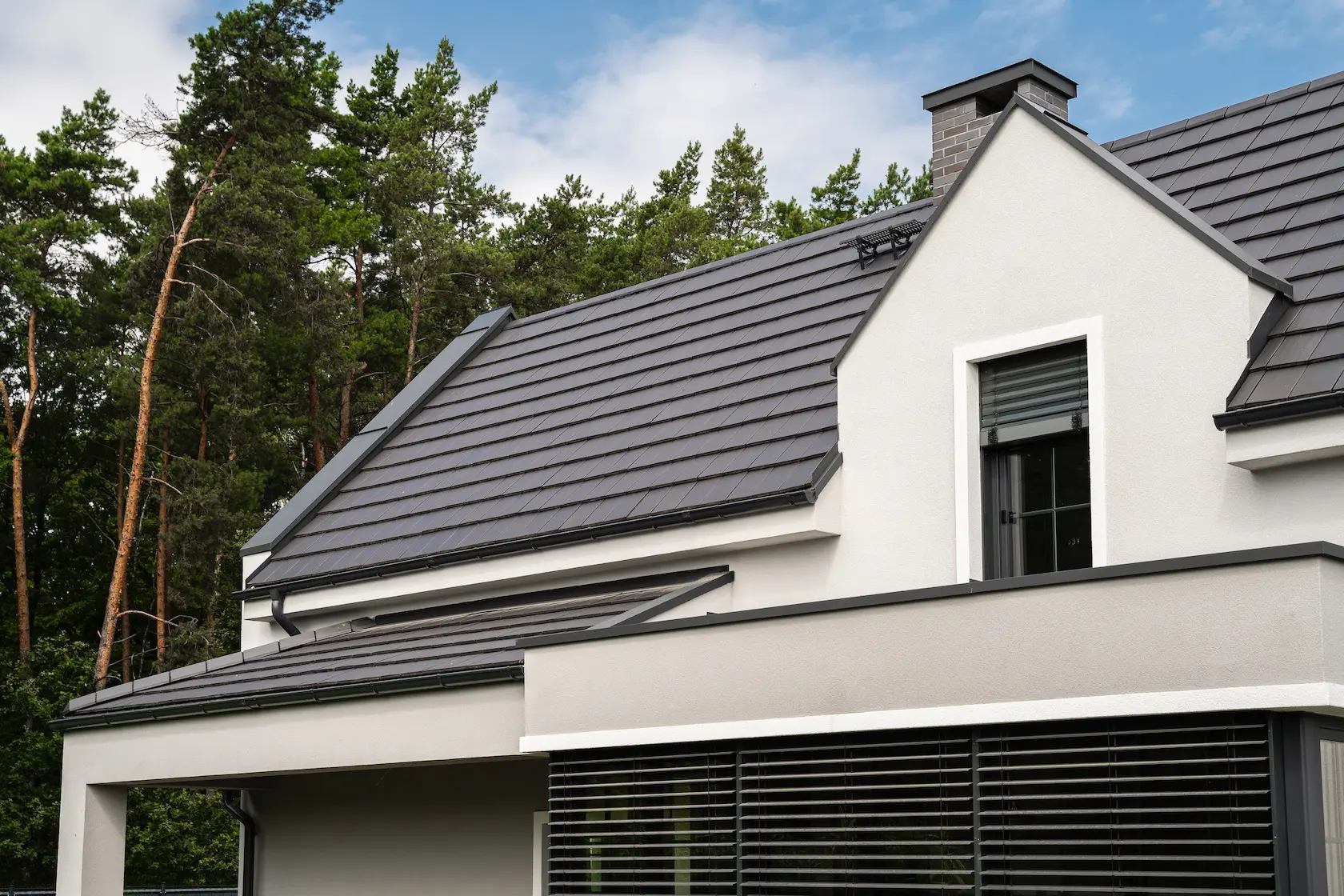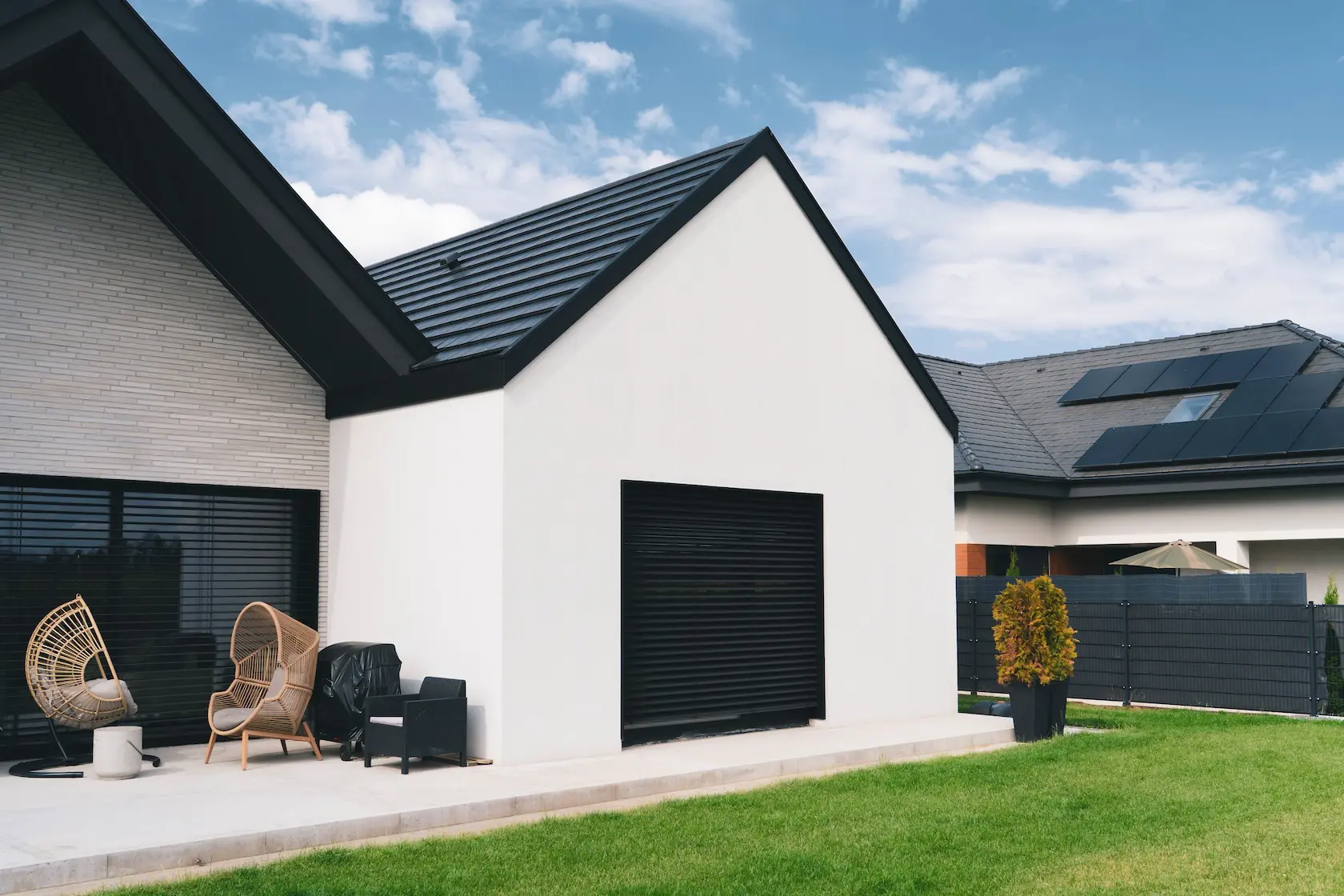 nowoczesna fasada wentylowana: wybrane partie elewacji wykonano w technologii wentylowanej z użyciem płyt włókno-cementowych Equitone. To rozwiązanie zapewnia wyjątkową trwałość, odporność na warunki atmosferyczne i nowoczesny, minimalistyczny wygląd.