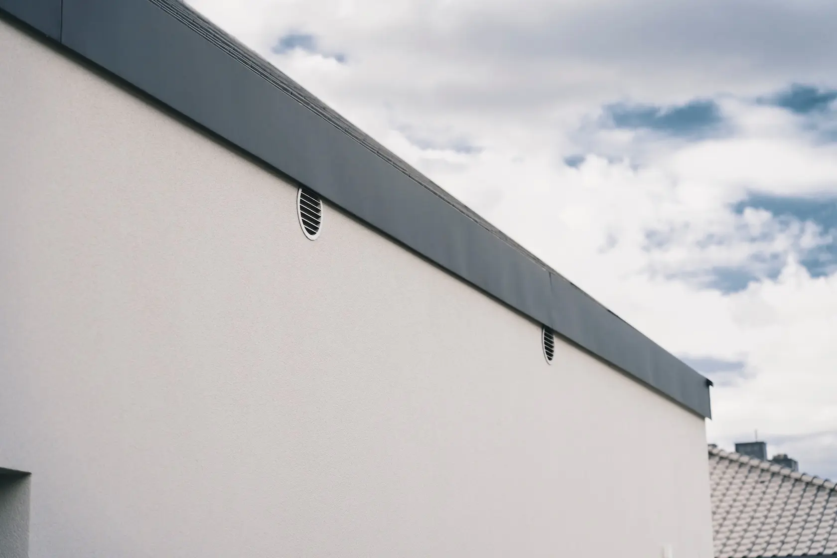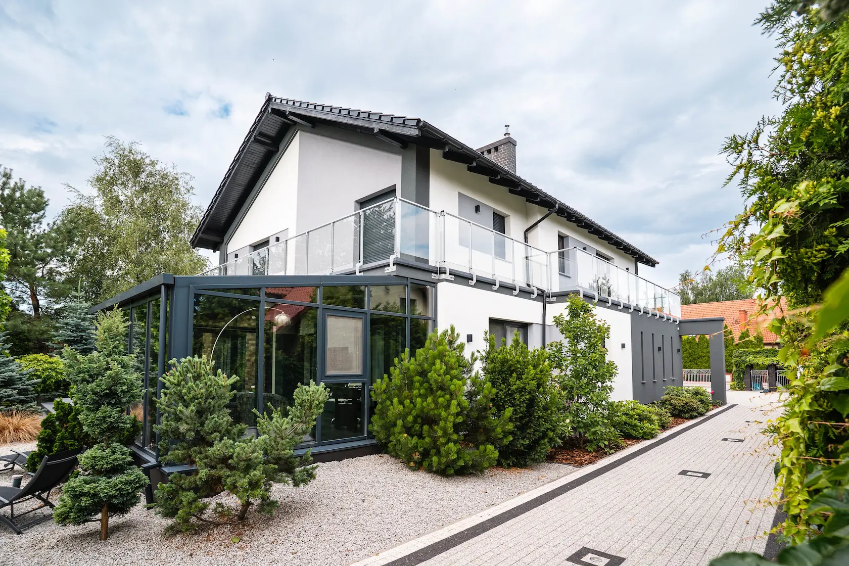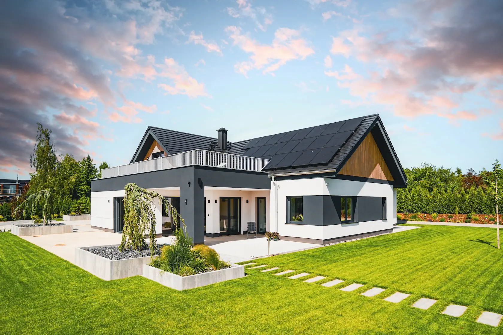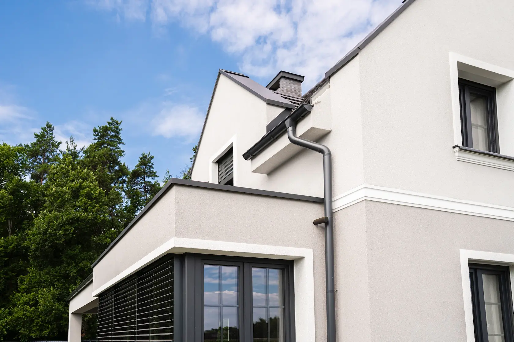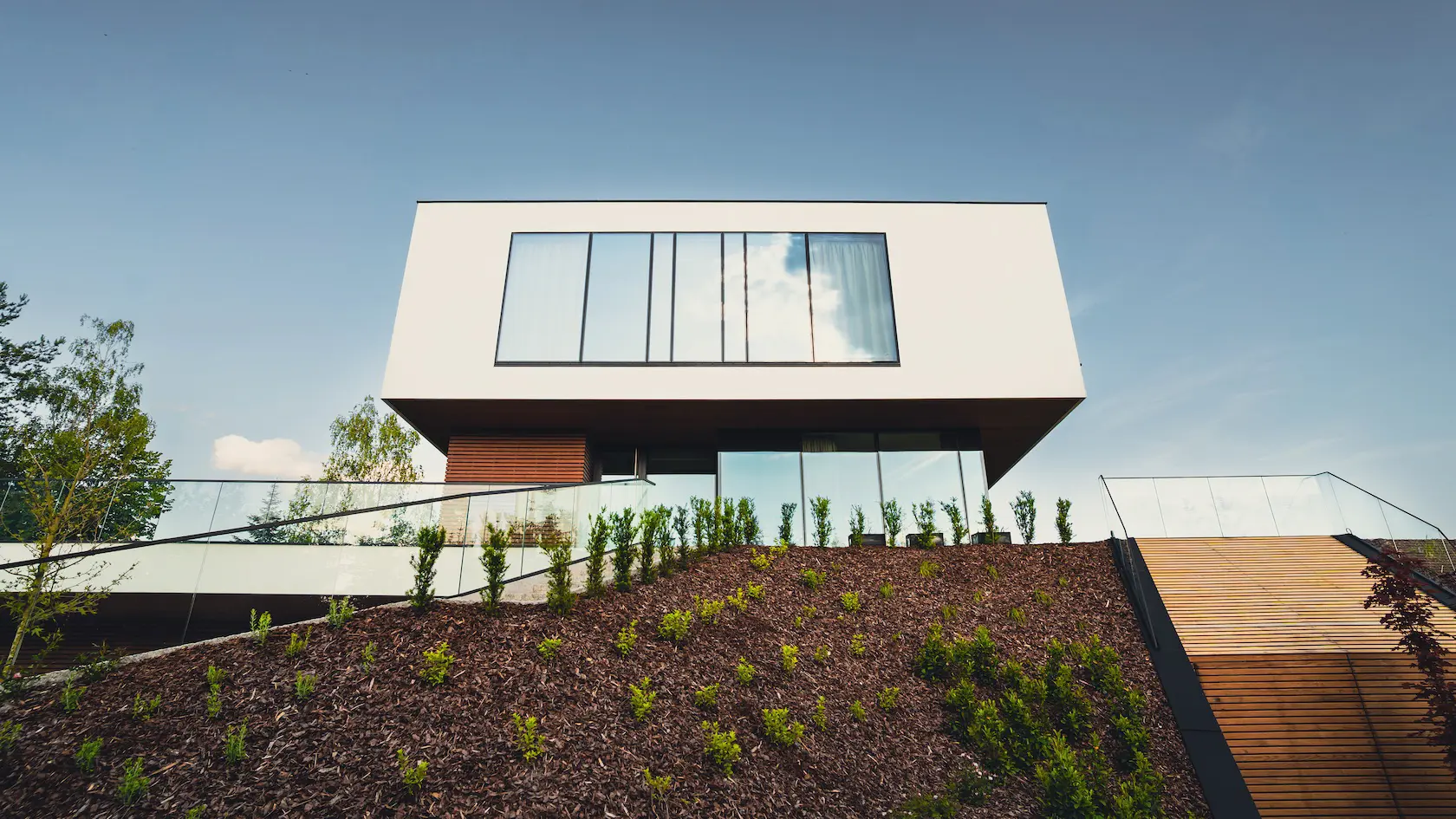 nowoczesna fasada wentylowana: wybrane partie elewacji wykonano w technologii wentylowanej z użyciem płyt włókno-cementowych Equitone. To rozwiązanie zapewnia wyjątkową trwałość, odporność na warunki atmosferyczne i nowoczesny, minimalistyczny wygląd.