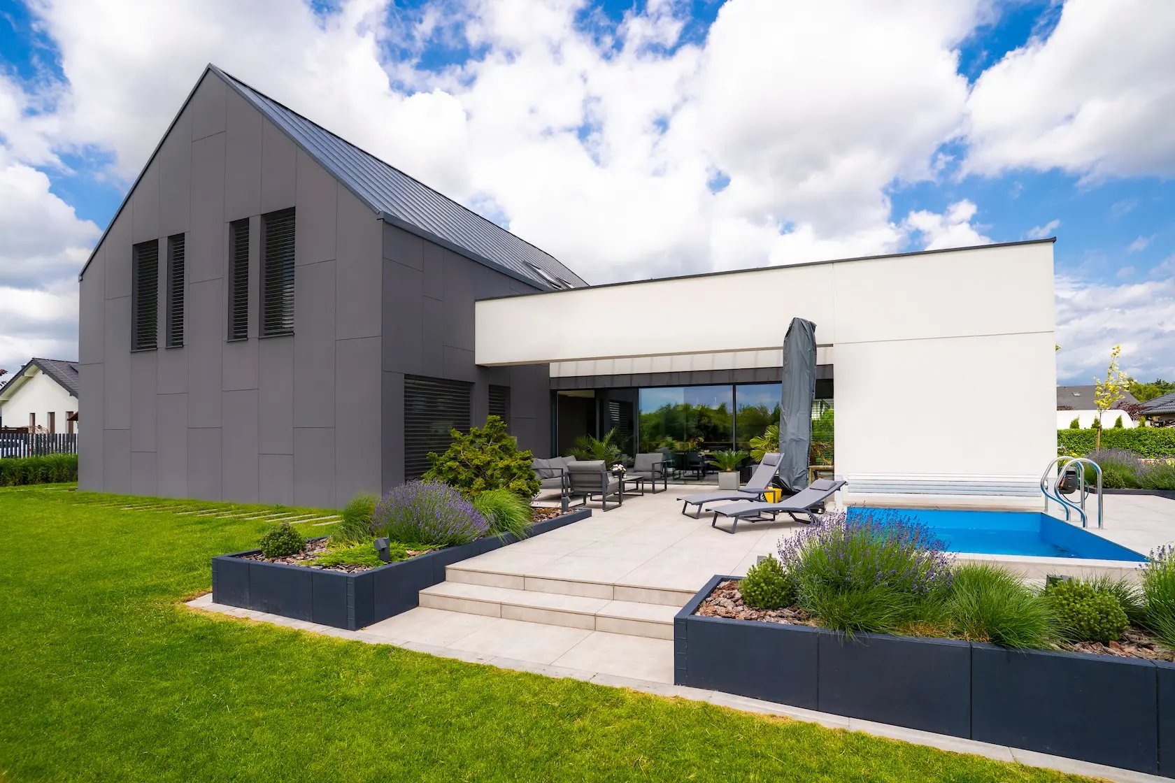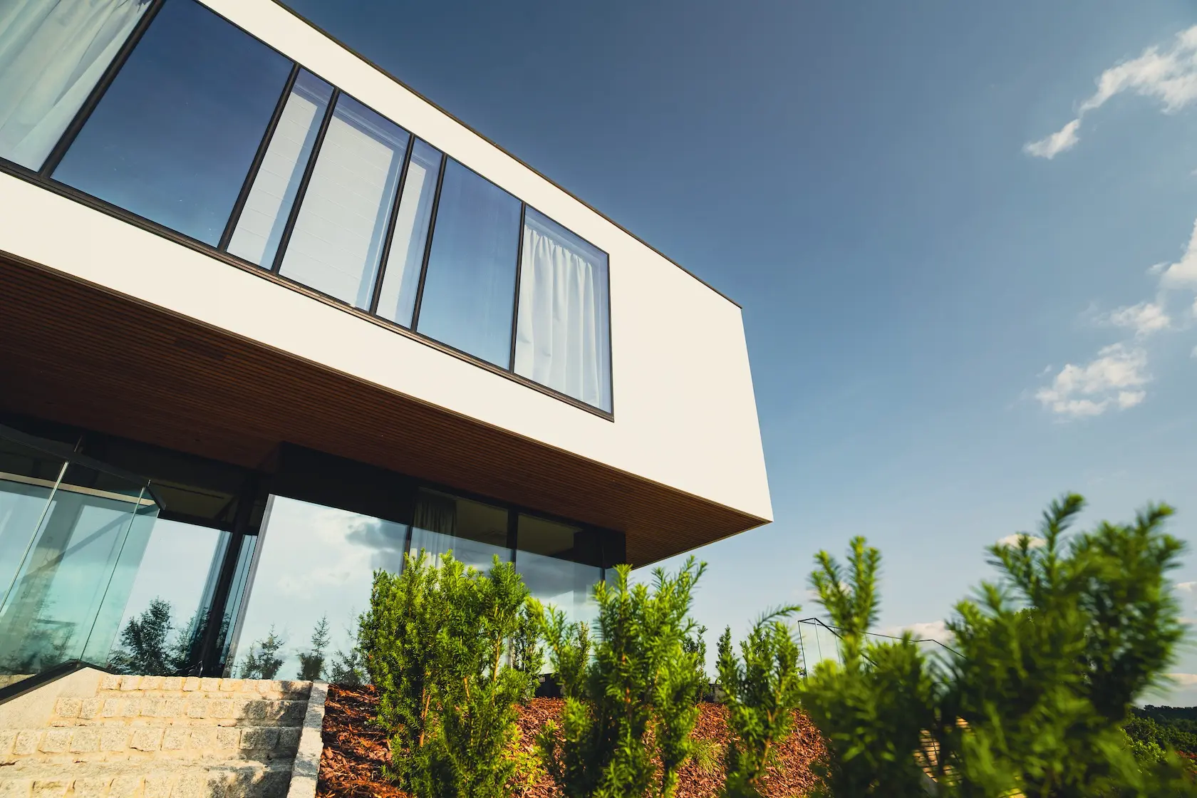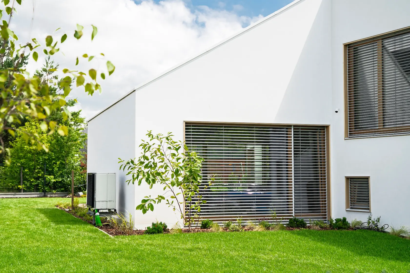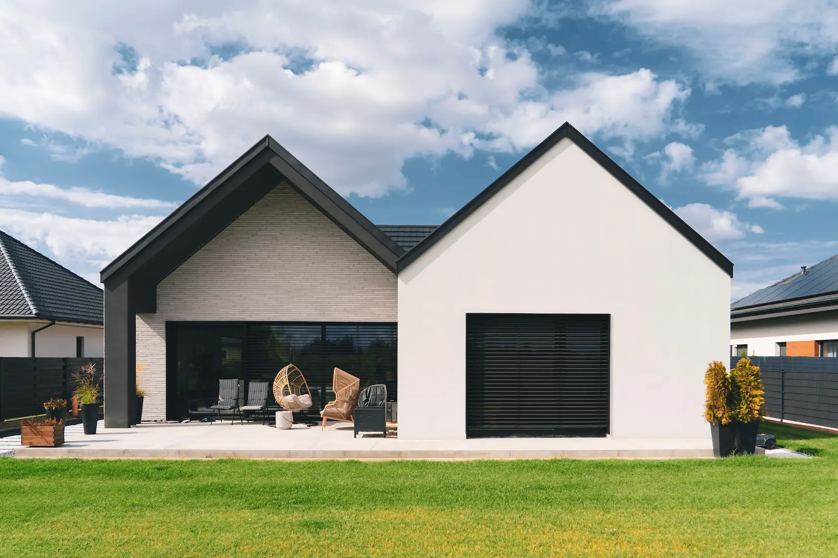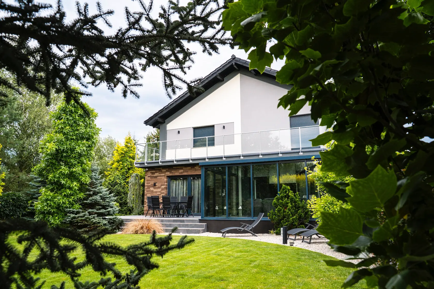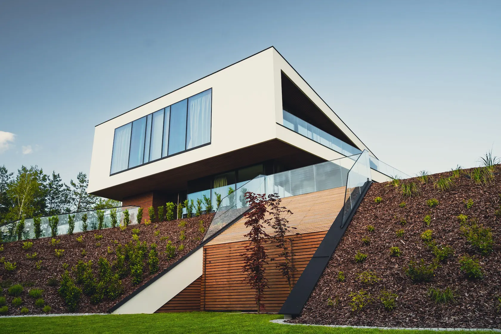 nowoczesna fasada wentylowana: wybrane partie elewacji wykonano w technologii wentylowanej z użyciem płyt włókno-cementowych Equitone. To rozwiązanie zapewnia wyjątkową trwałość, odporność na warunki atmosferyczne i nowoczesny, minimalistyczny wygląd.