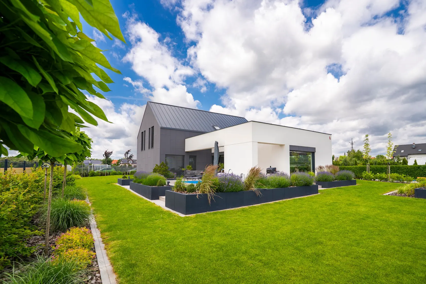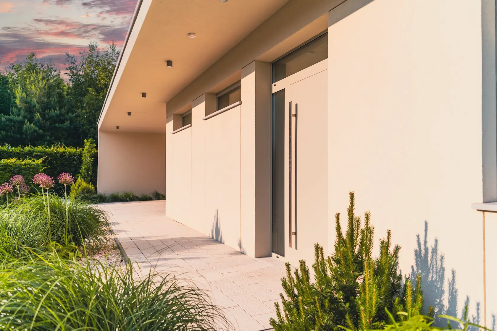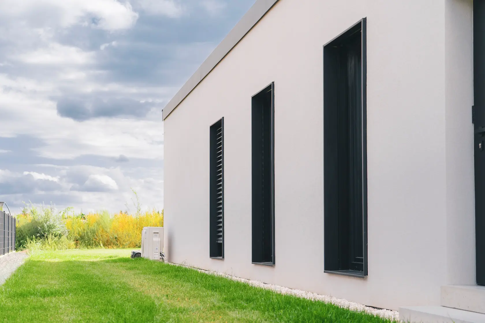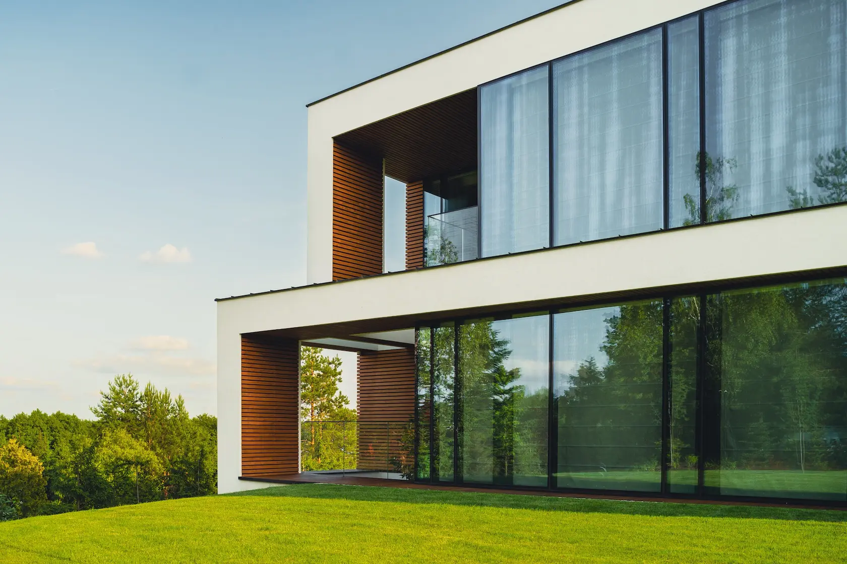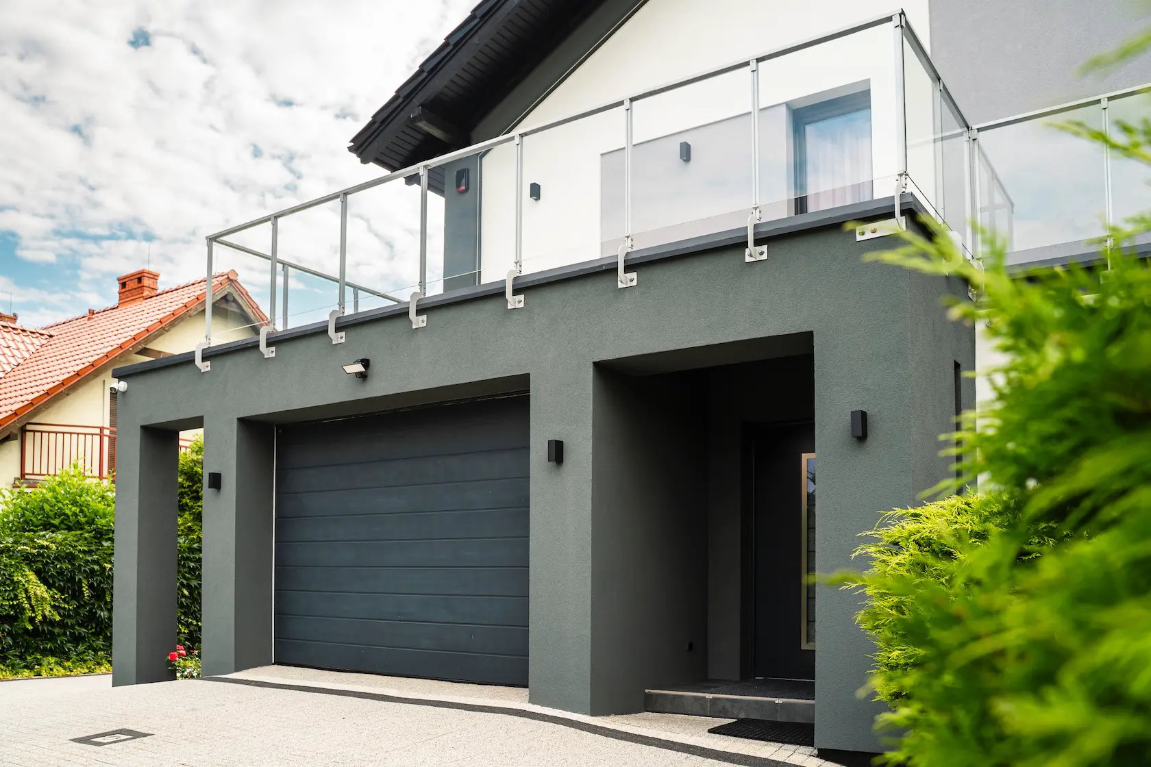 nowoczesna fasada wentylowana: wybrane partie elewacji wykonano w technologii wentylowanej z użyciem płyt włókno-cementowych Equitone. To rozwiązanie zapewnia wyjątkową trwałość, odporność na warunki atmosferyczne i nowoczesny, minimalistyczny wygląd.