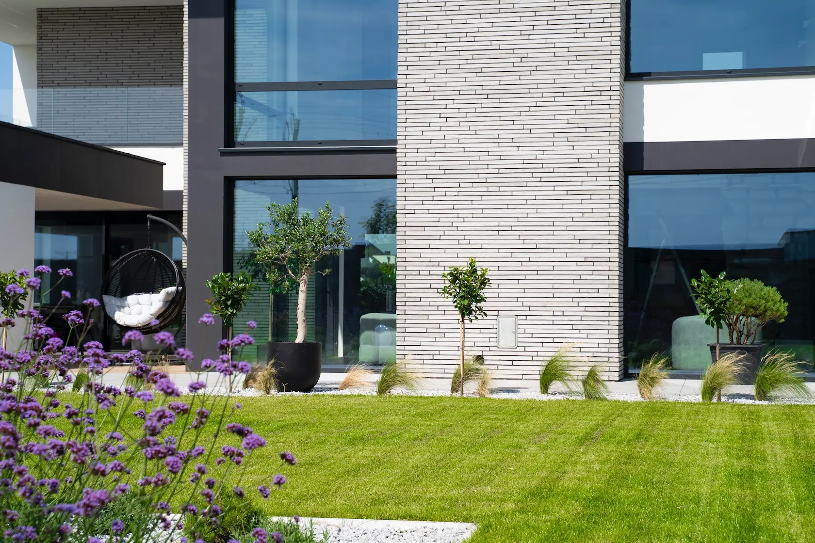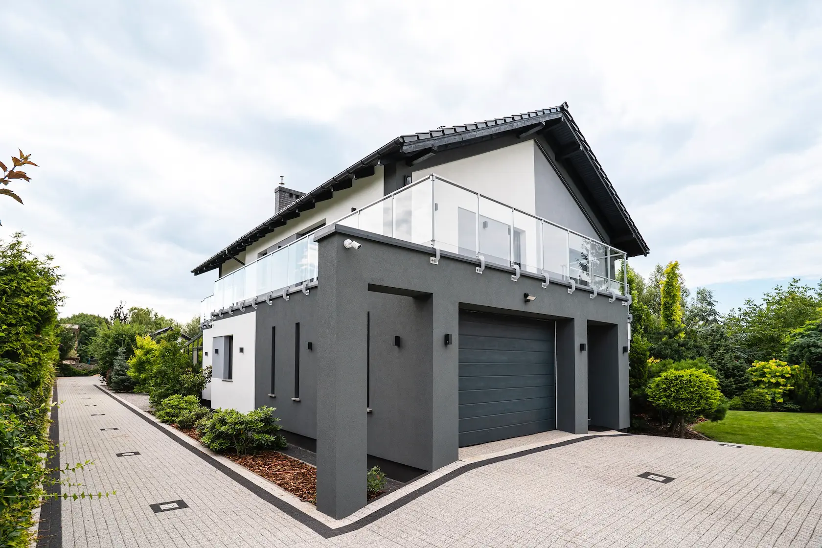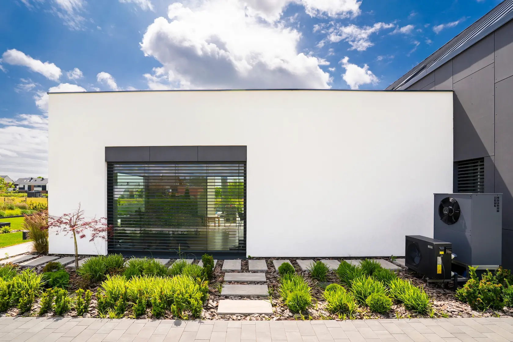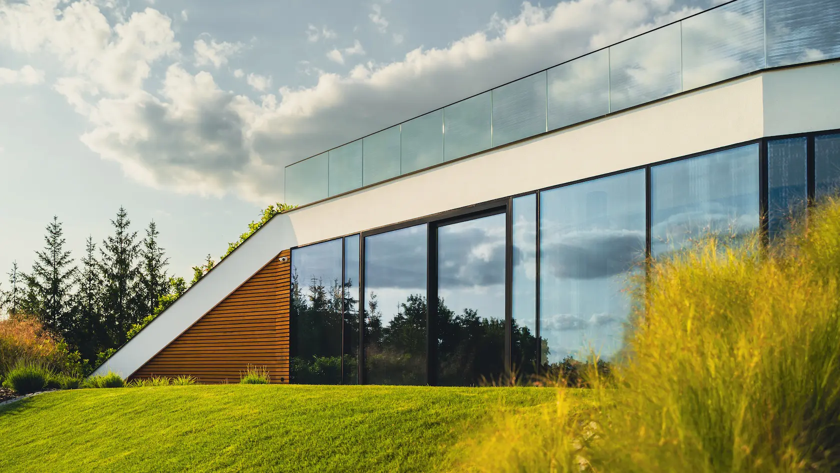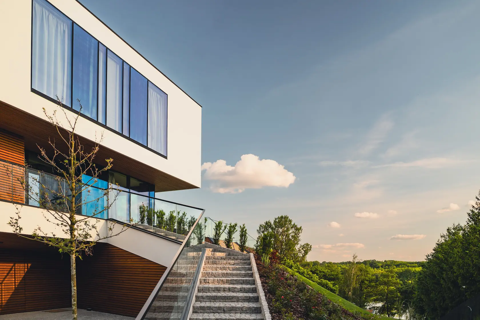 nowoczesna fasada wentylowana: wybrane partie elewacji wykonano w technologii wentylowanej z użyciem płyt włókno-cementowych Equitone. To rozwiązanie zapewnia wyjątkową trwałość, odporność na warunki atmosferyczne i nowoczesny, minimalistyczny wygląd.