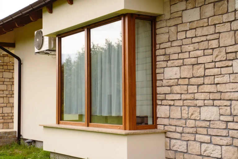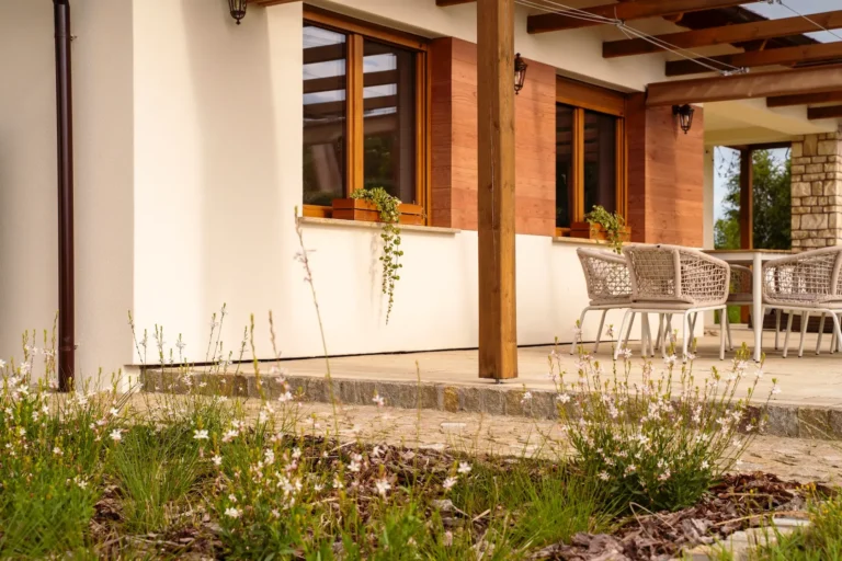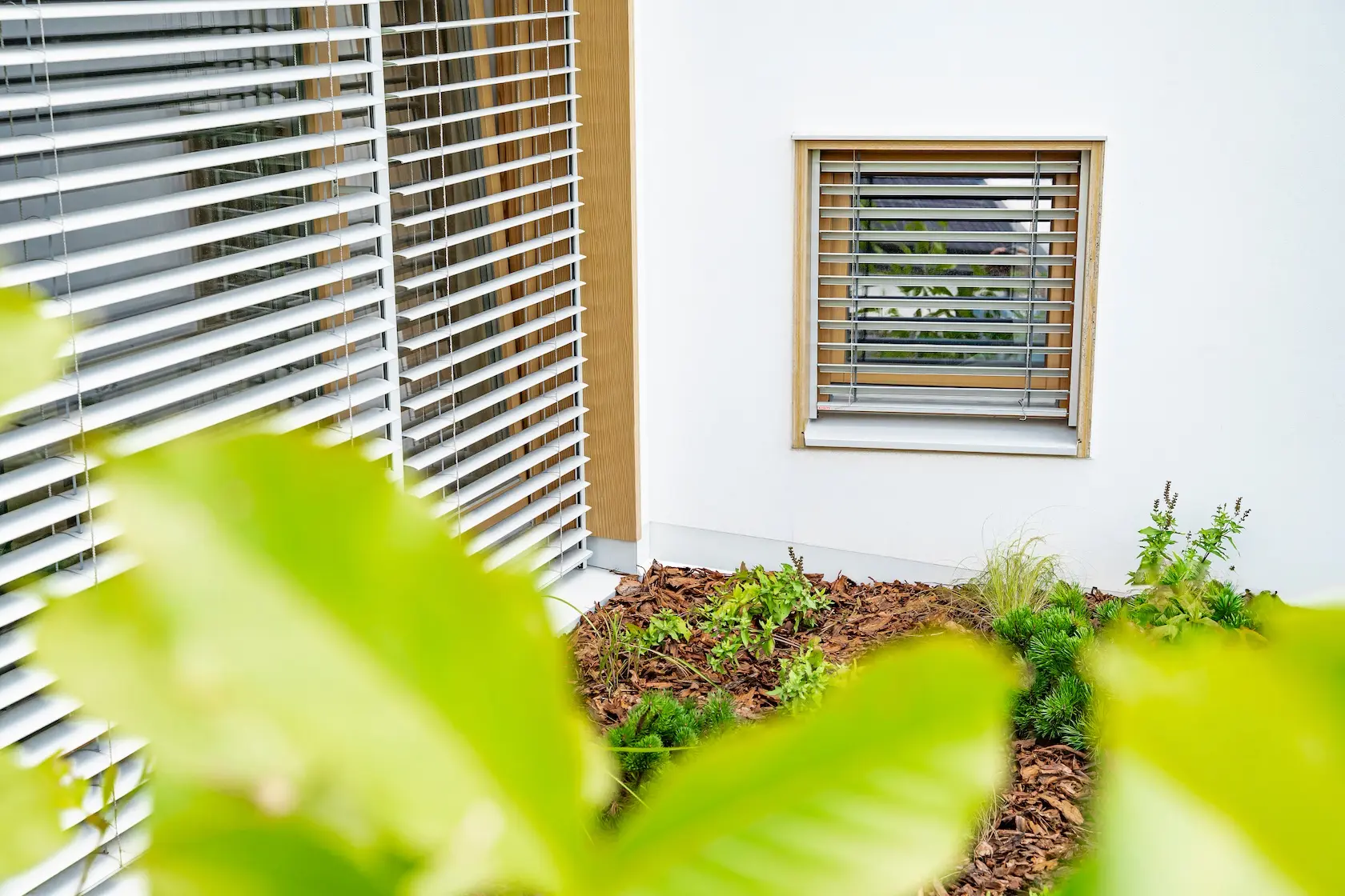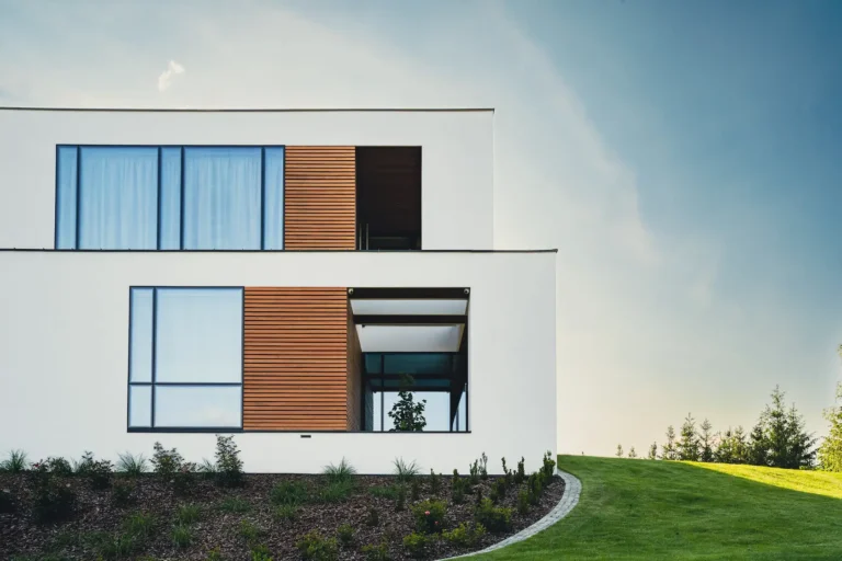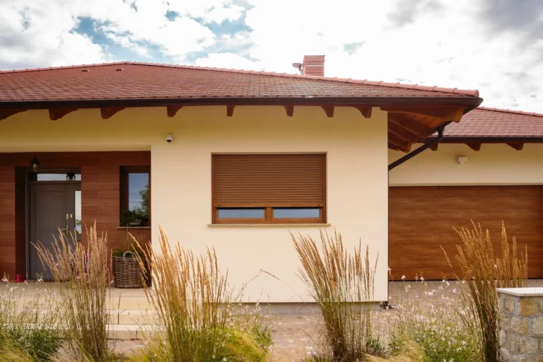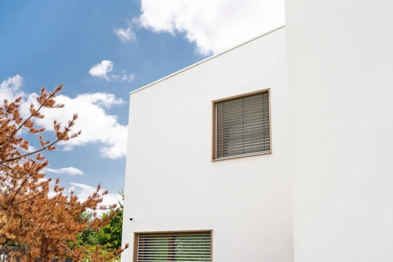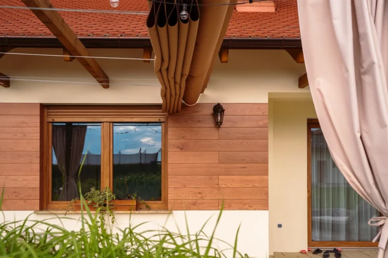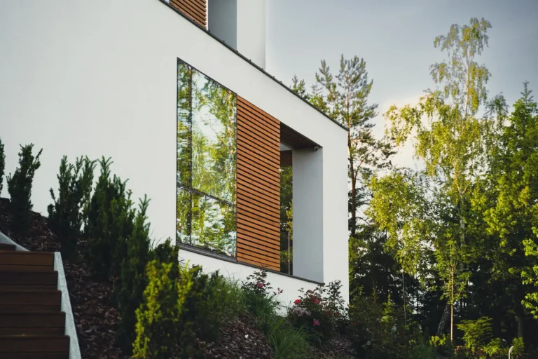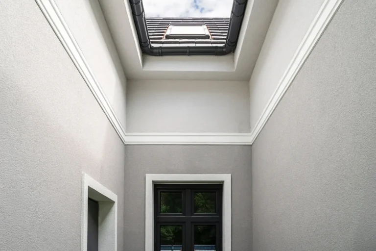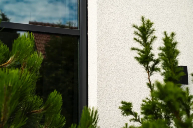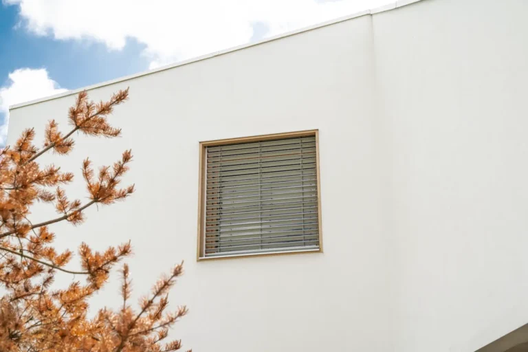 ościeża okienne premium: zastosowanie drewna egzotycznego do wykończenia ościeży okiennych wprowadza luksusowy i trwały akcent, kontrastujący z gładką powierzchnią tynku,