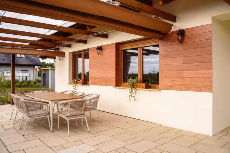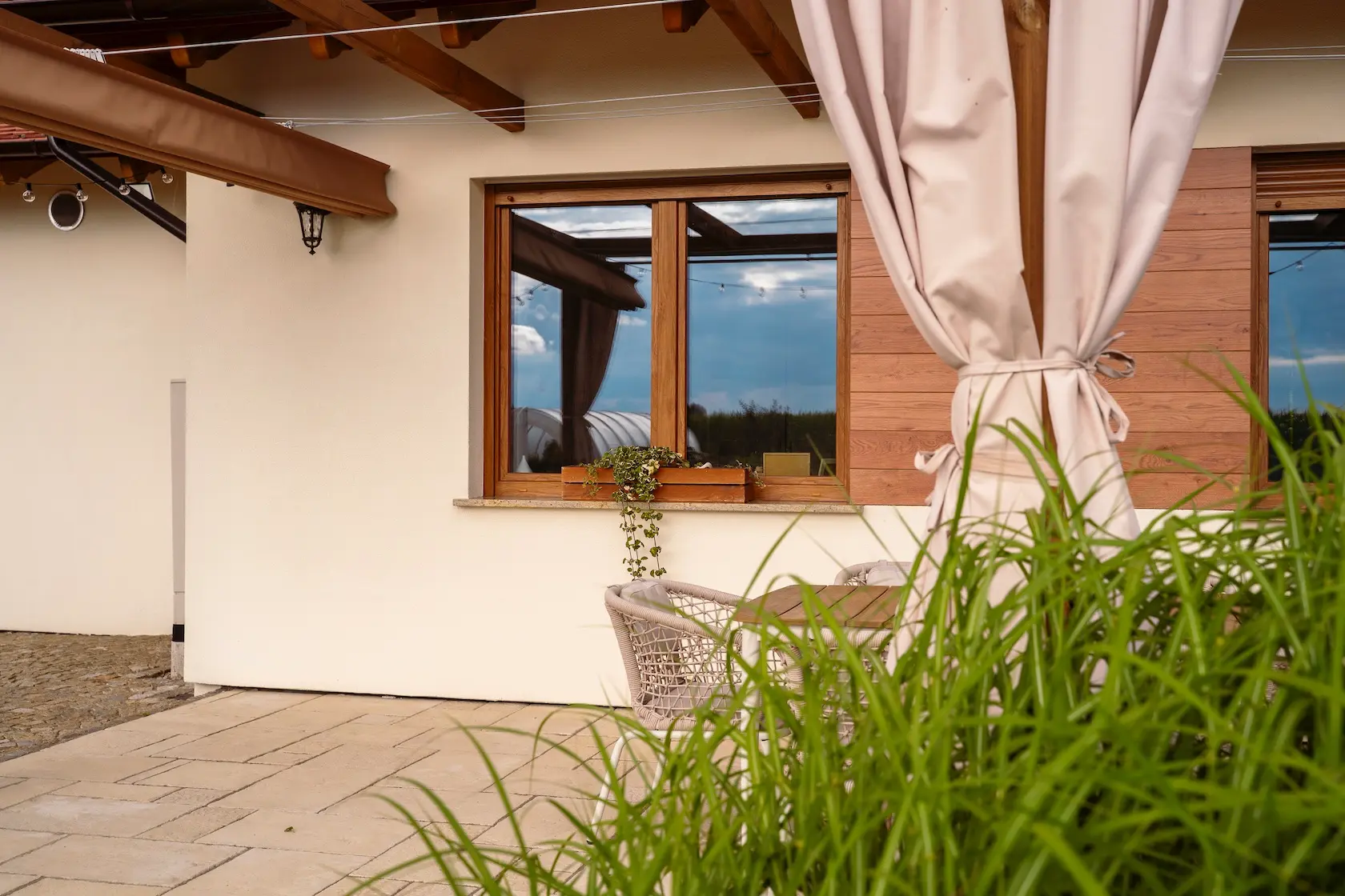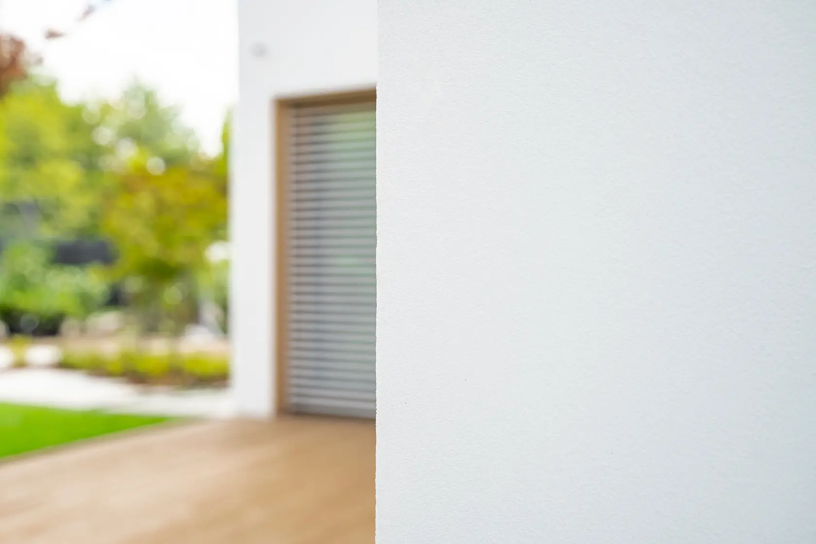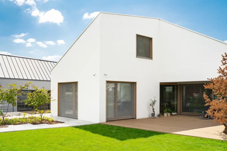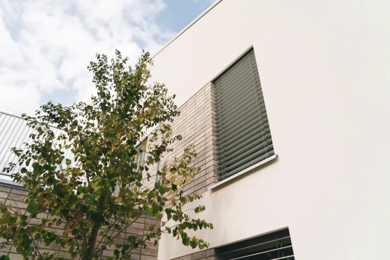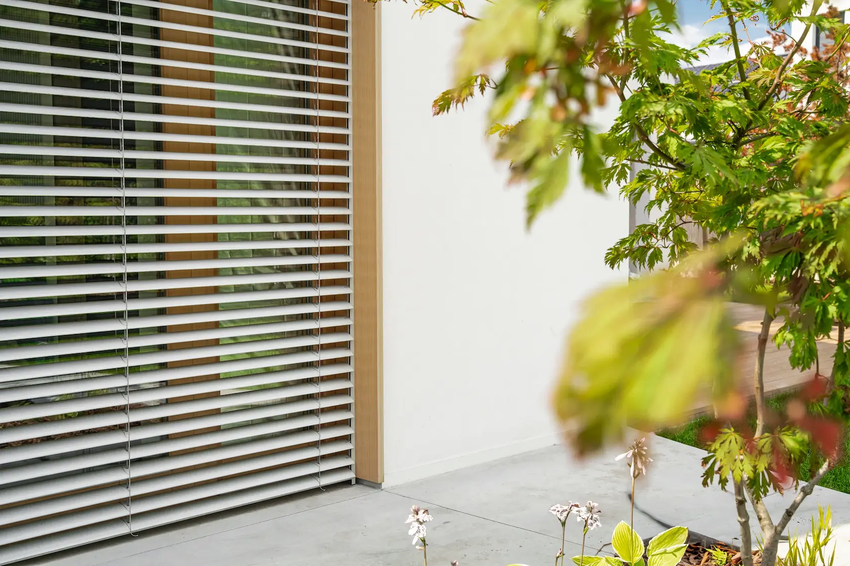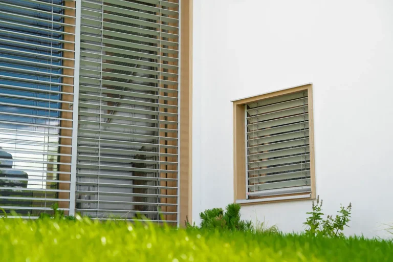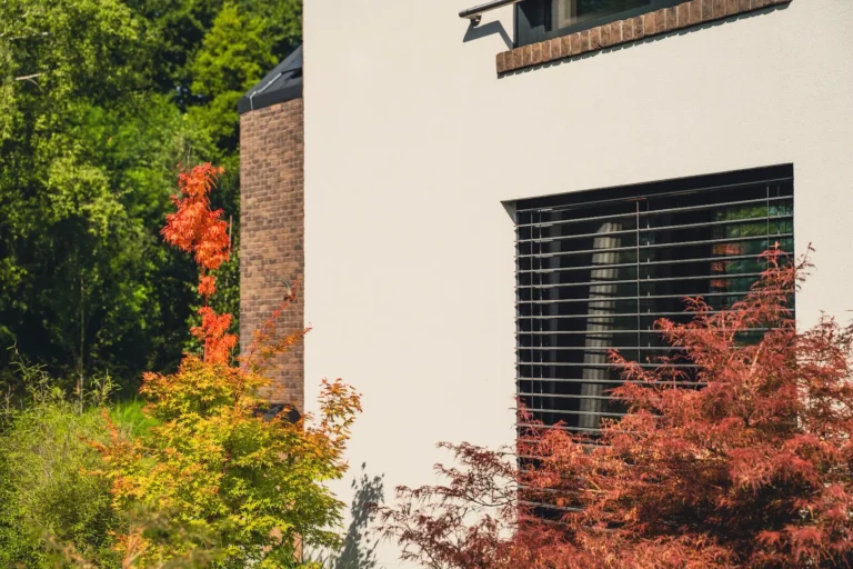 ościeża okienne premium: zastosowanie drewna egzotycznego do wykończenia ościeży okiennych wprowadza luksusowy i trwały akcent, kontrastujący z gładką powierzchnią tynku,