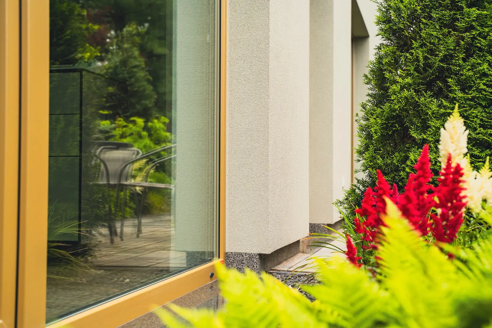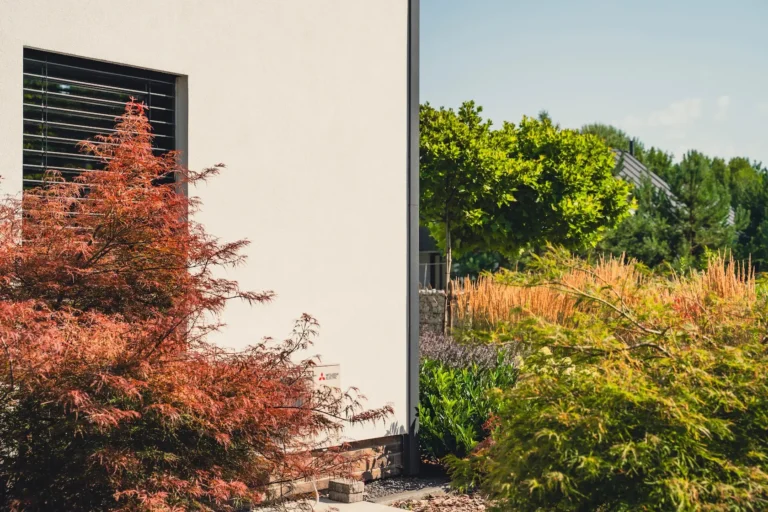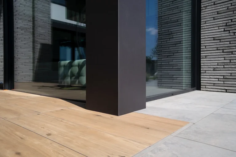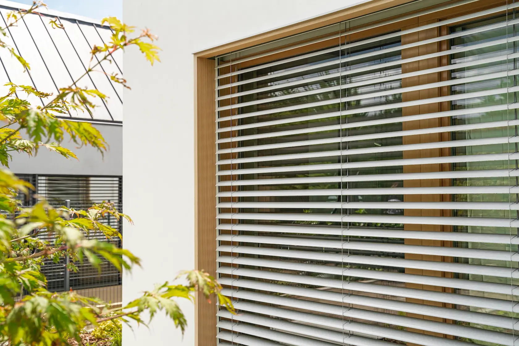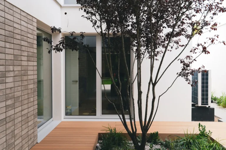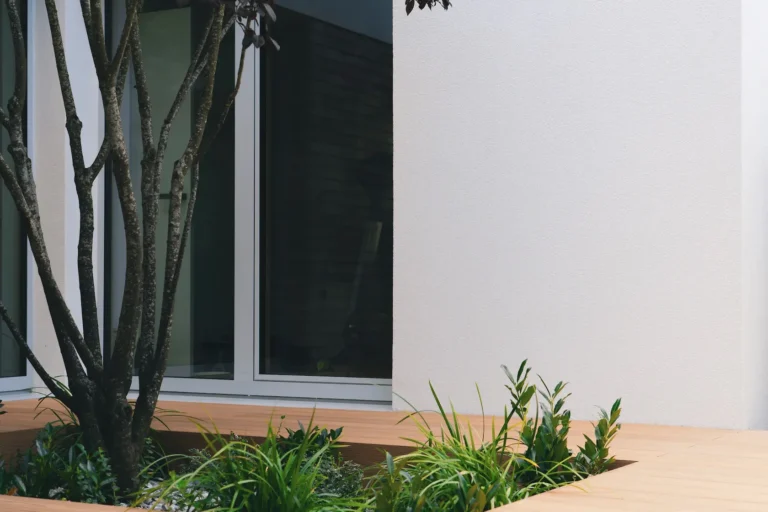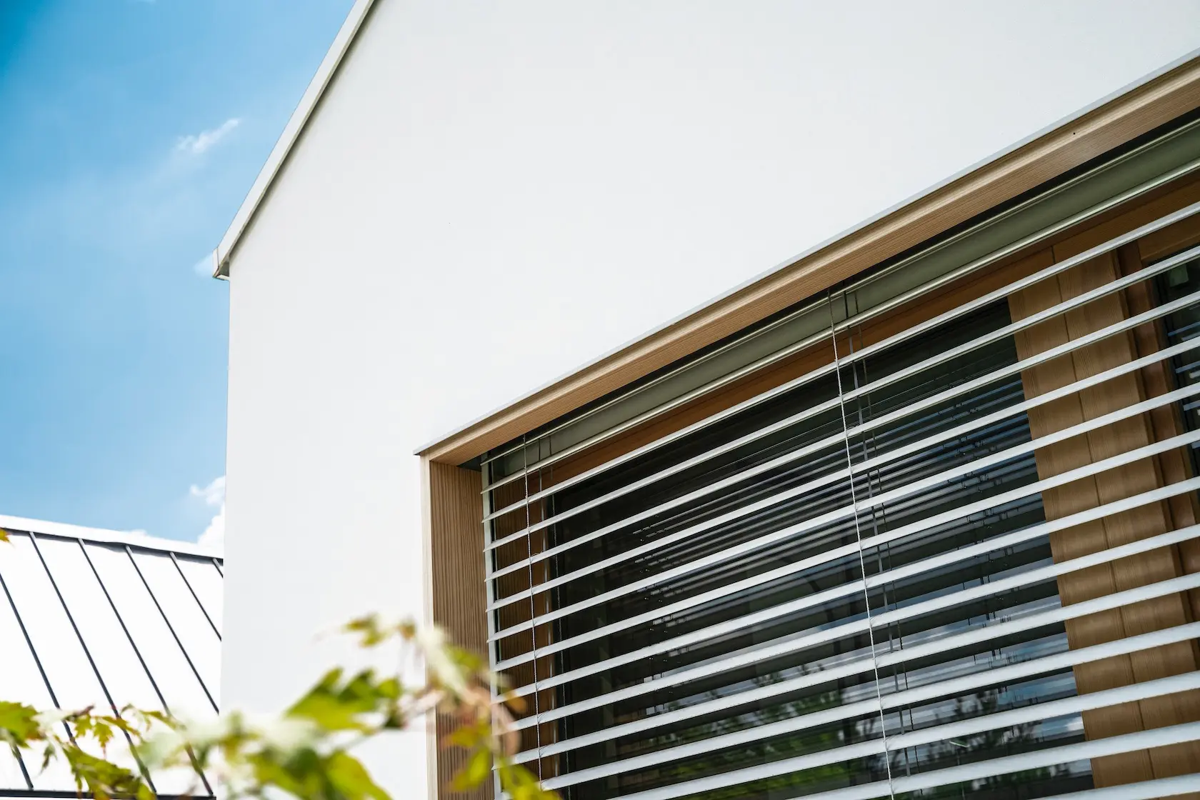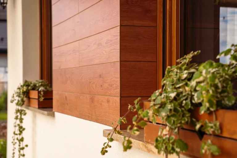ościeża okienne premium: zastosowanie drewna egzotycznego do wykończenia ościeży okiennych wprowadza luksusowy i trwały akcent, kontrastujący z gładką powierzchnią tynku,