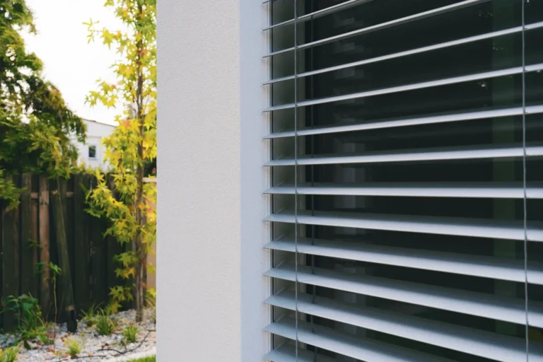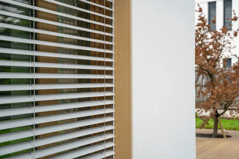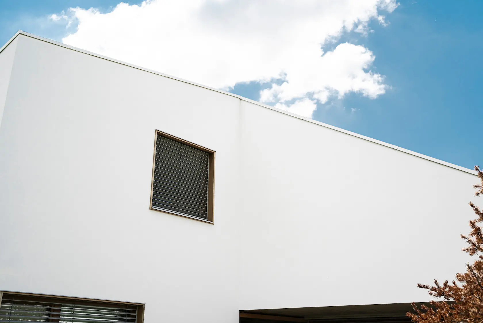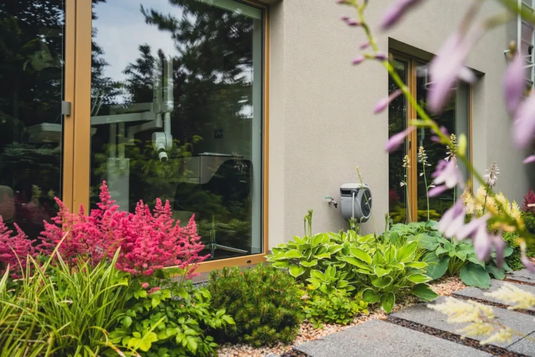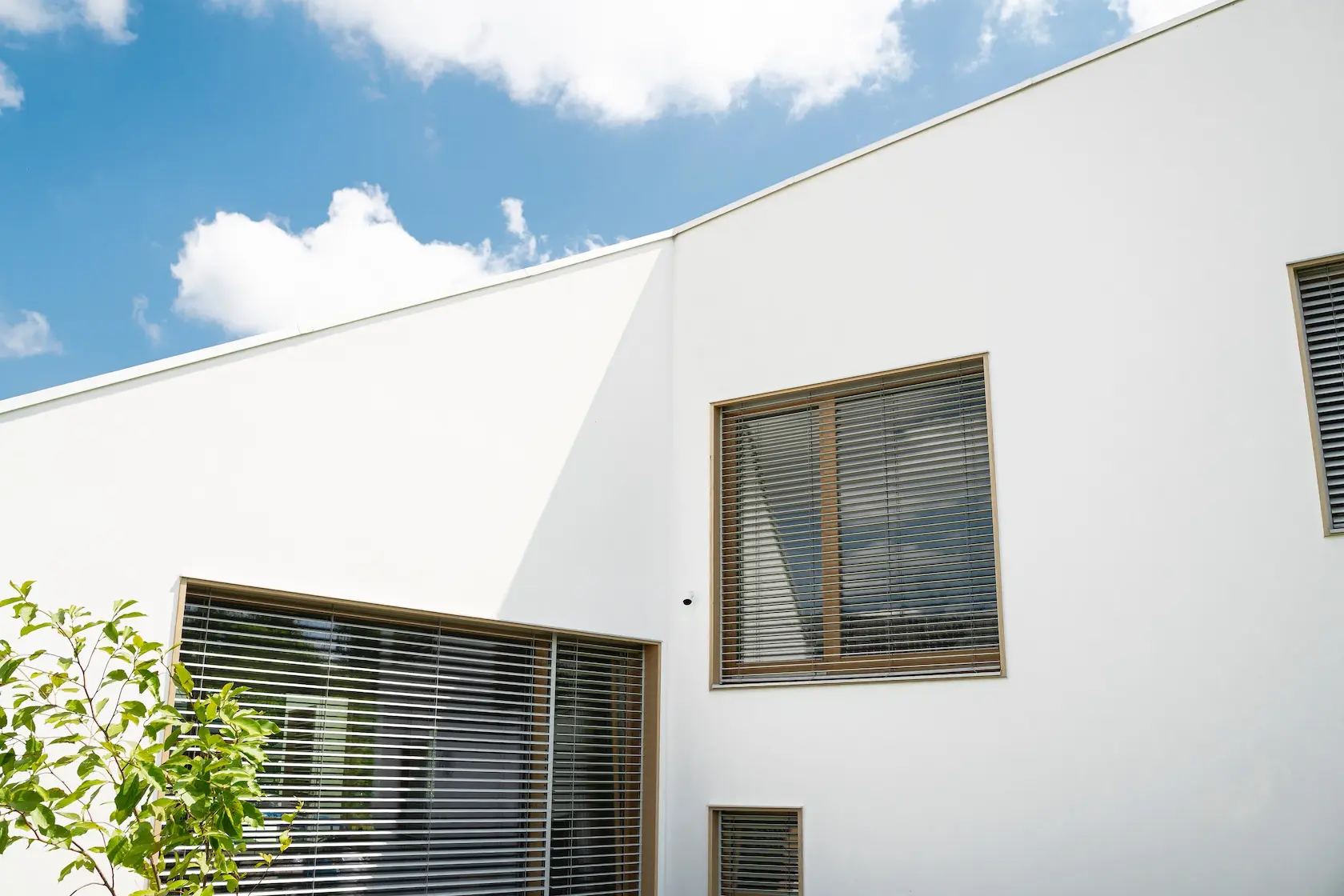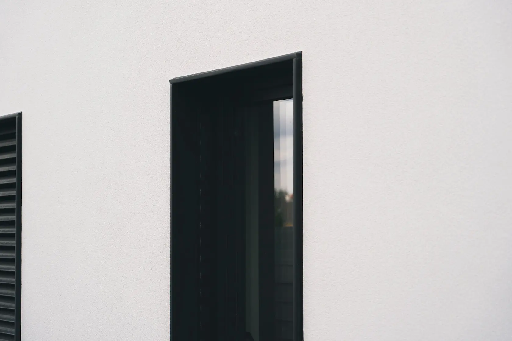 ościeża okienne premium: zastosowanie drewna egzotycznego do wykończenia ościeży okiennych wprowadza luksusowy i trwały akcent, kontrastujący z gładką powierzchnią tynku,