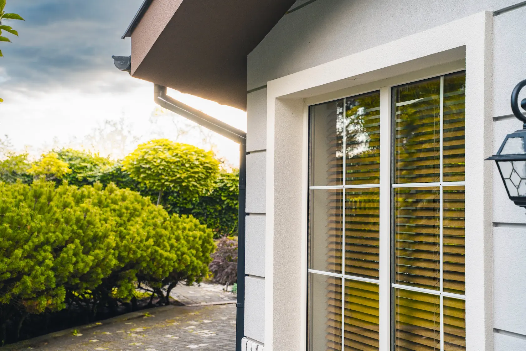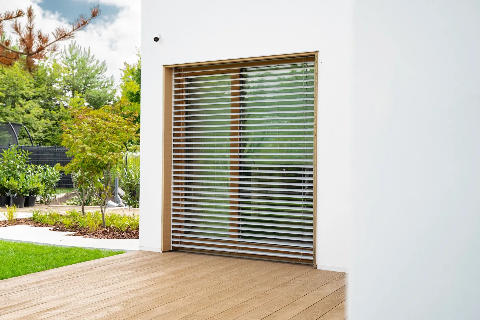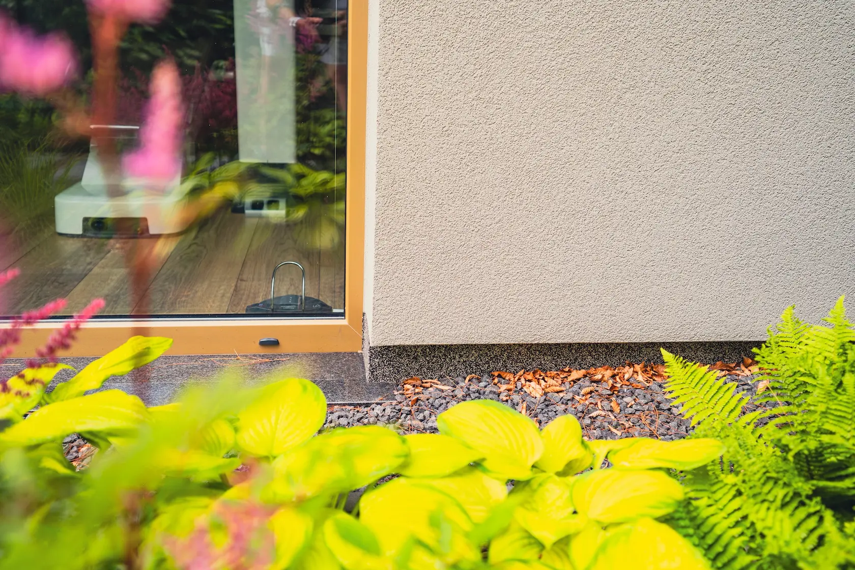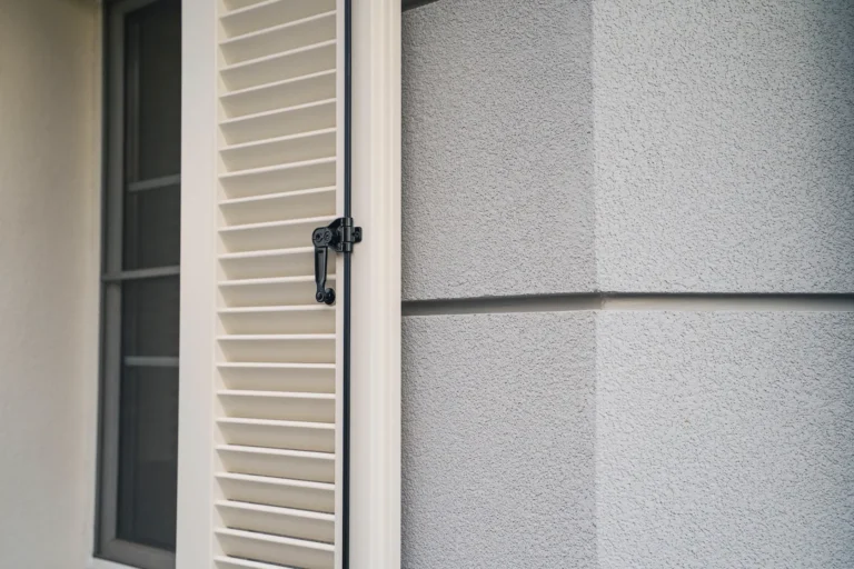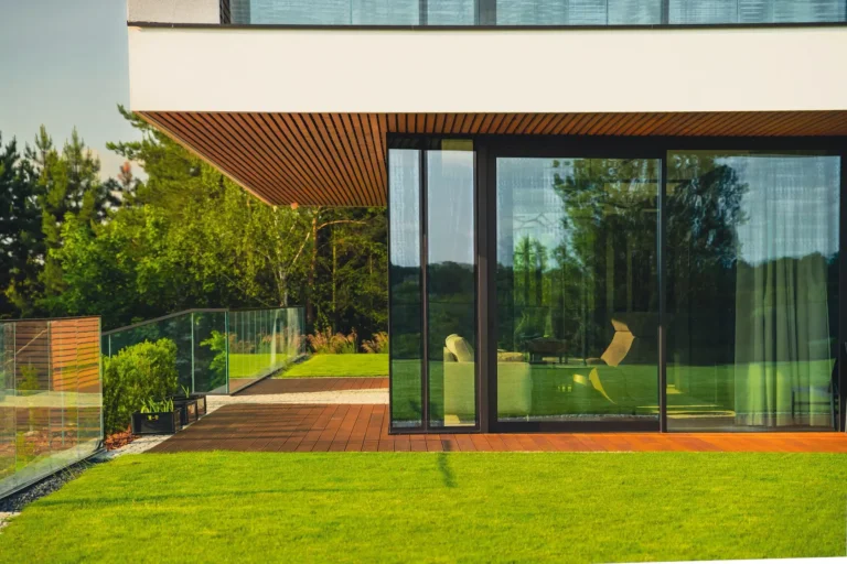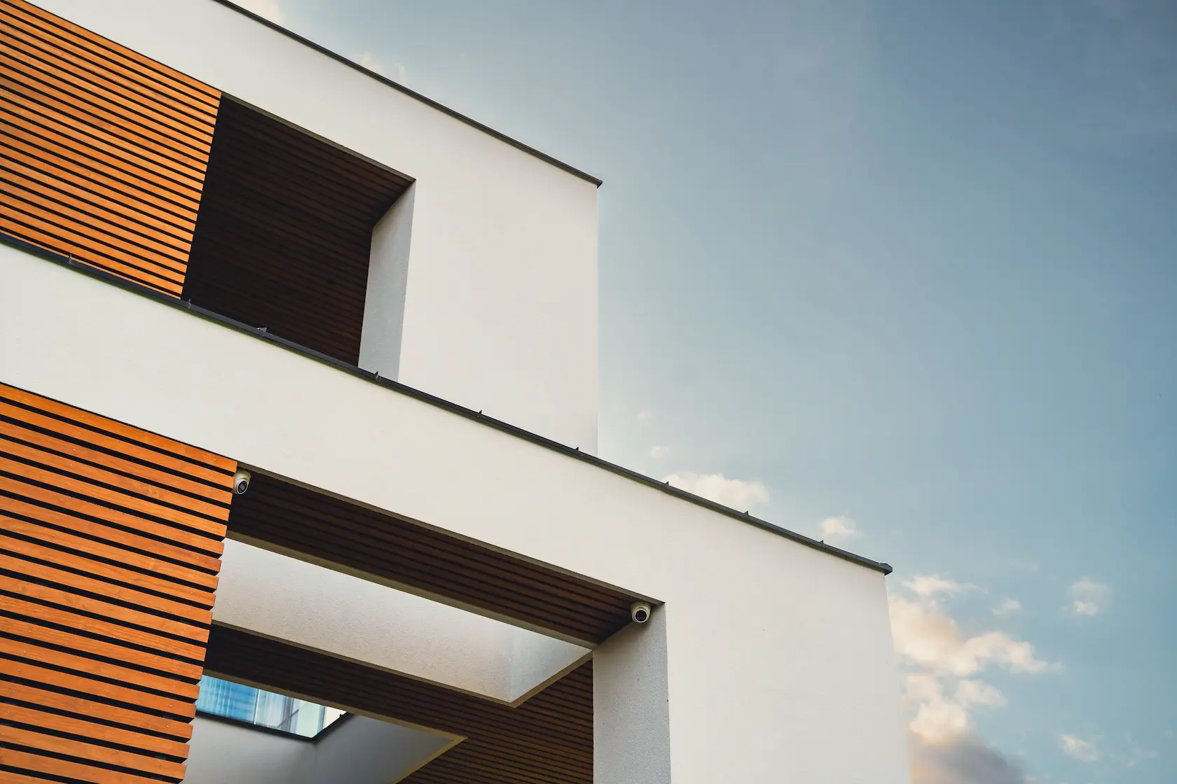 ościeża okienne premium: zastosowanie drewna egzotycznego do wykończenia ościeży okiennych wprowadza luksusowy i trwały akcent, kontrastujący z gładką powierzchnią tynku,