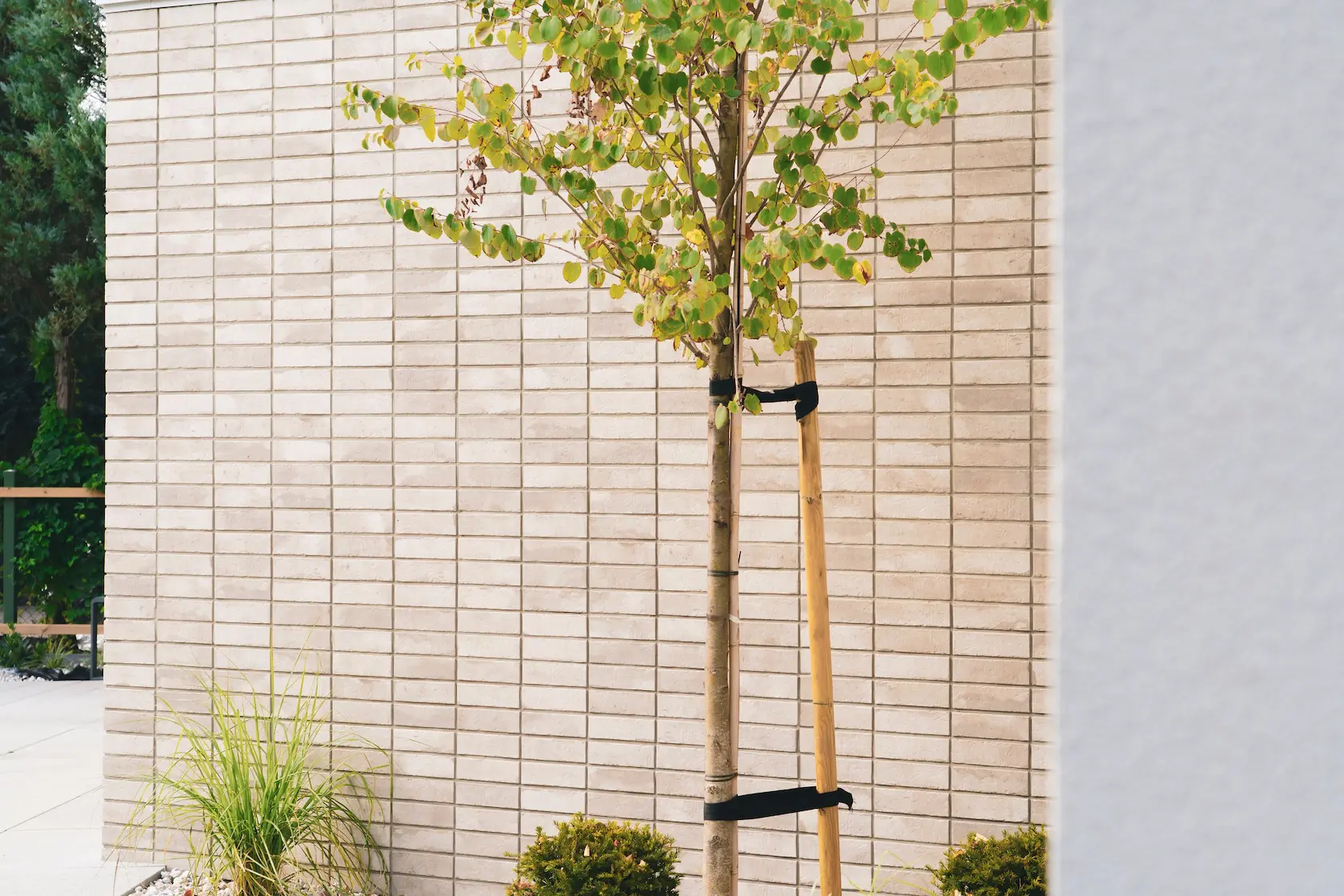 Projekt fasady łączy zaawansowaną technologię izolacji w systemie ETICS CAPAROL z wyrafinowanym wykończeniem, w którym spotykają się trwałość ręcznie formowanej cegły oraz nowoczesna forma giętego drewna.