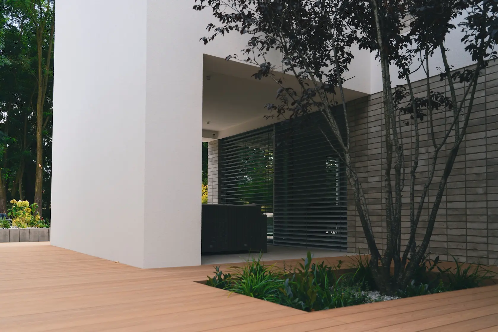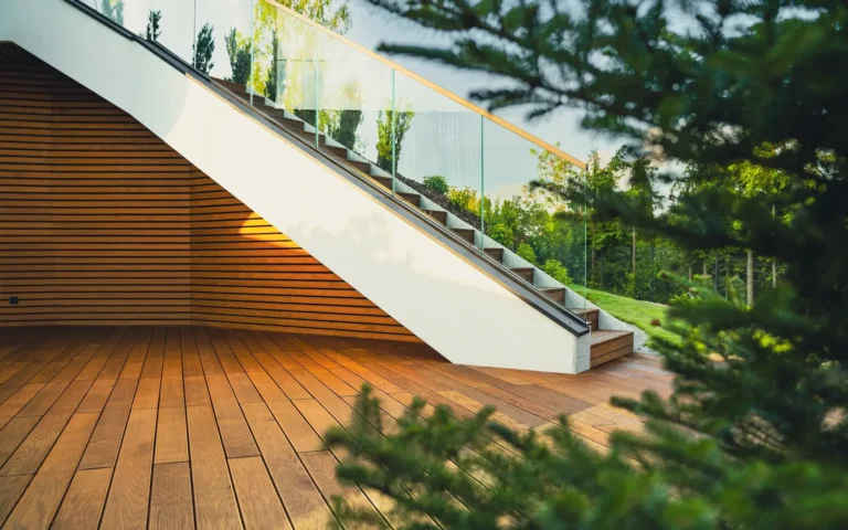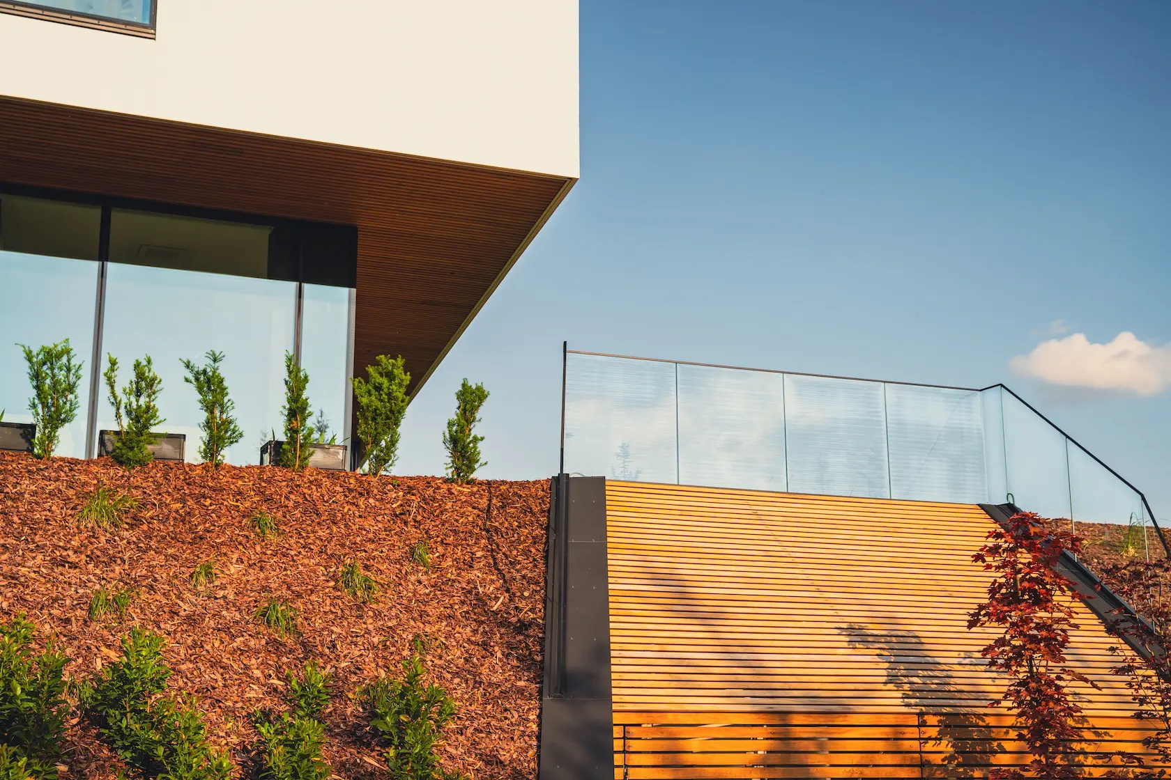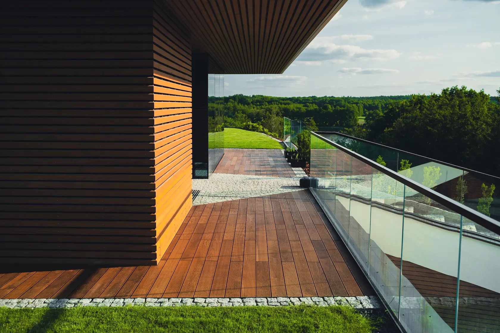 tarasy: strefy wypoczynku wykończono drewnem termo jesion Thermory, które jest znane z wyjątkowej twardości i trwałości, idealnej na intensywnie użytkowane powierzchnie poziome.
