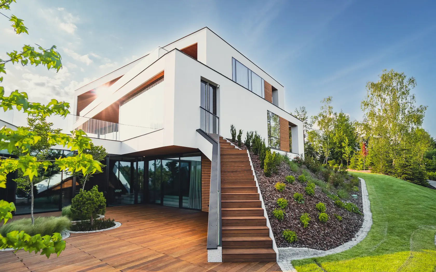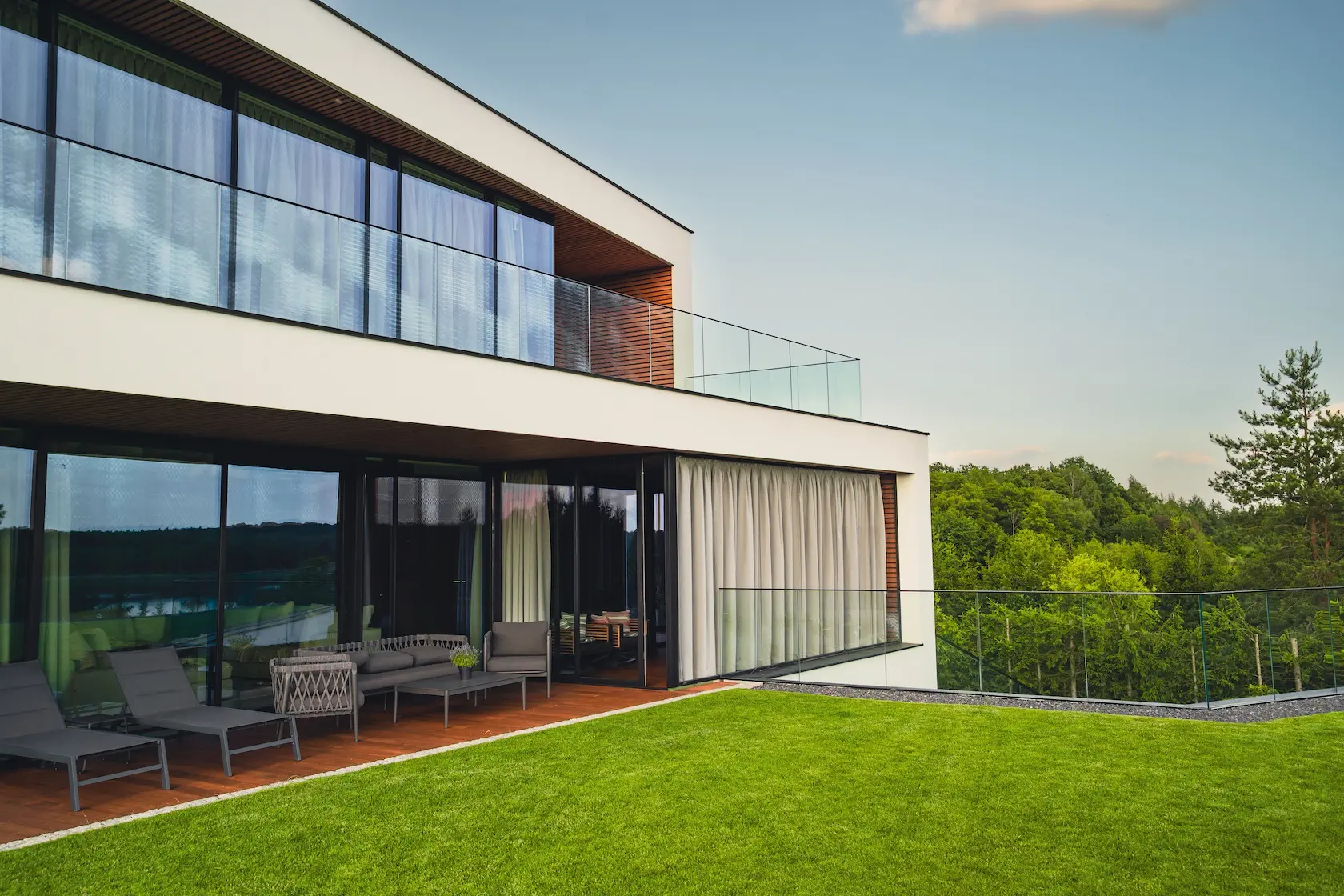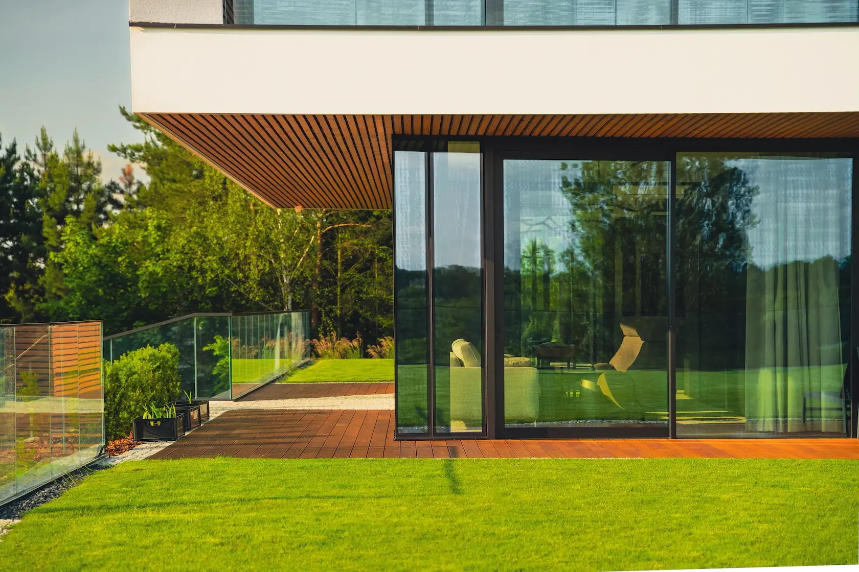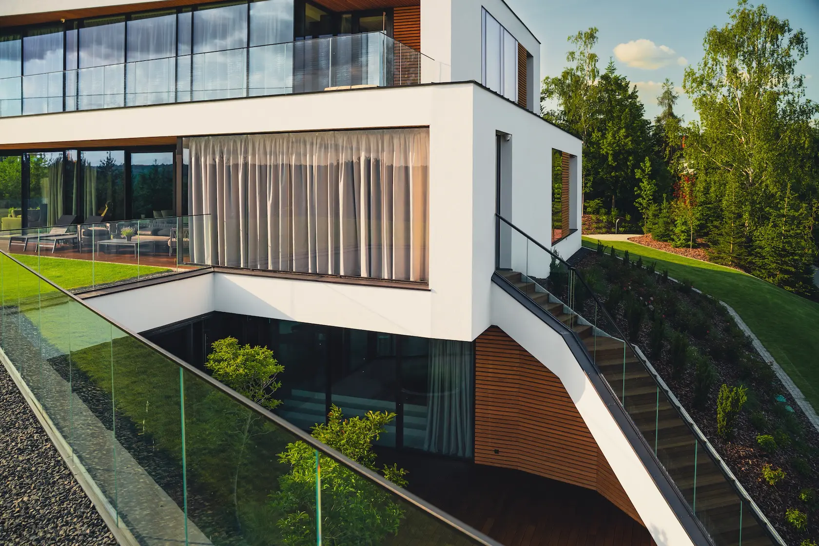 tarasy: strefy wypoczynku wykończono drewnem termo jesion Thermory, które jest znane z wyjątkowej twardości i trwałości, idealnej na intensywnie użytkowane powierzchnie poziome.