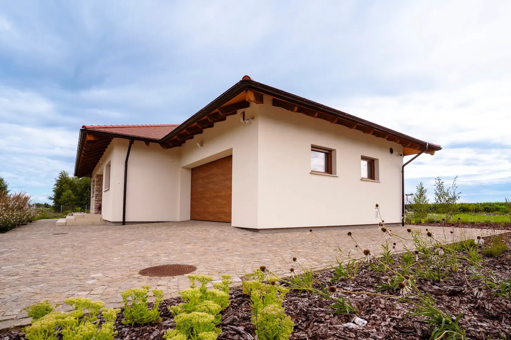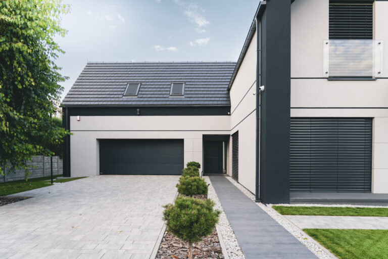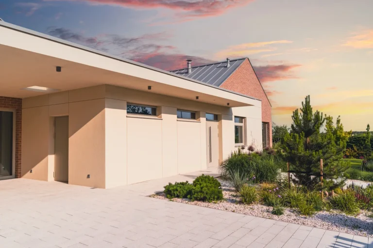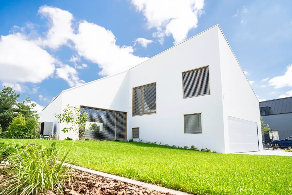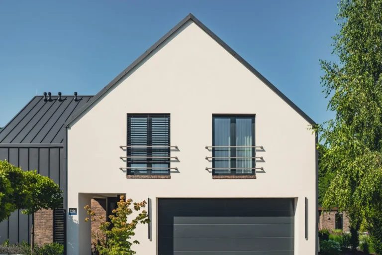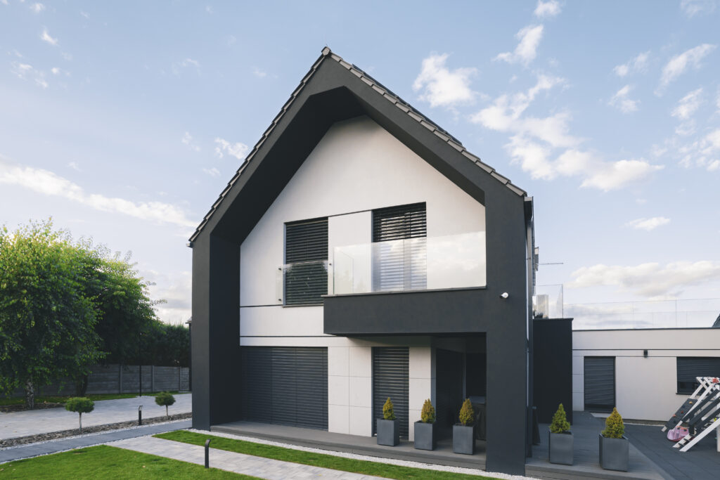 wykończenie tradycyjne: wykorzystanie strukturalnych tynków silikonowych oferuje doskonałą ochronę przed czynnikami zewnętrznymi oraz estetykę, w połączeniu z listwami do boniowania, które dodają elewacji geometrycznej elegancji.