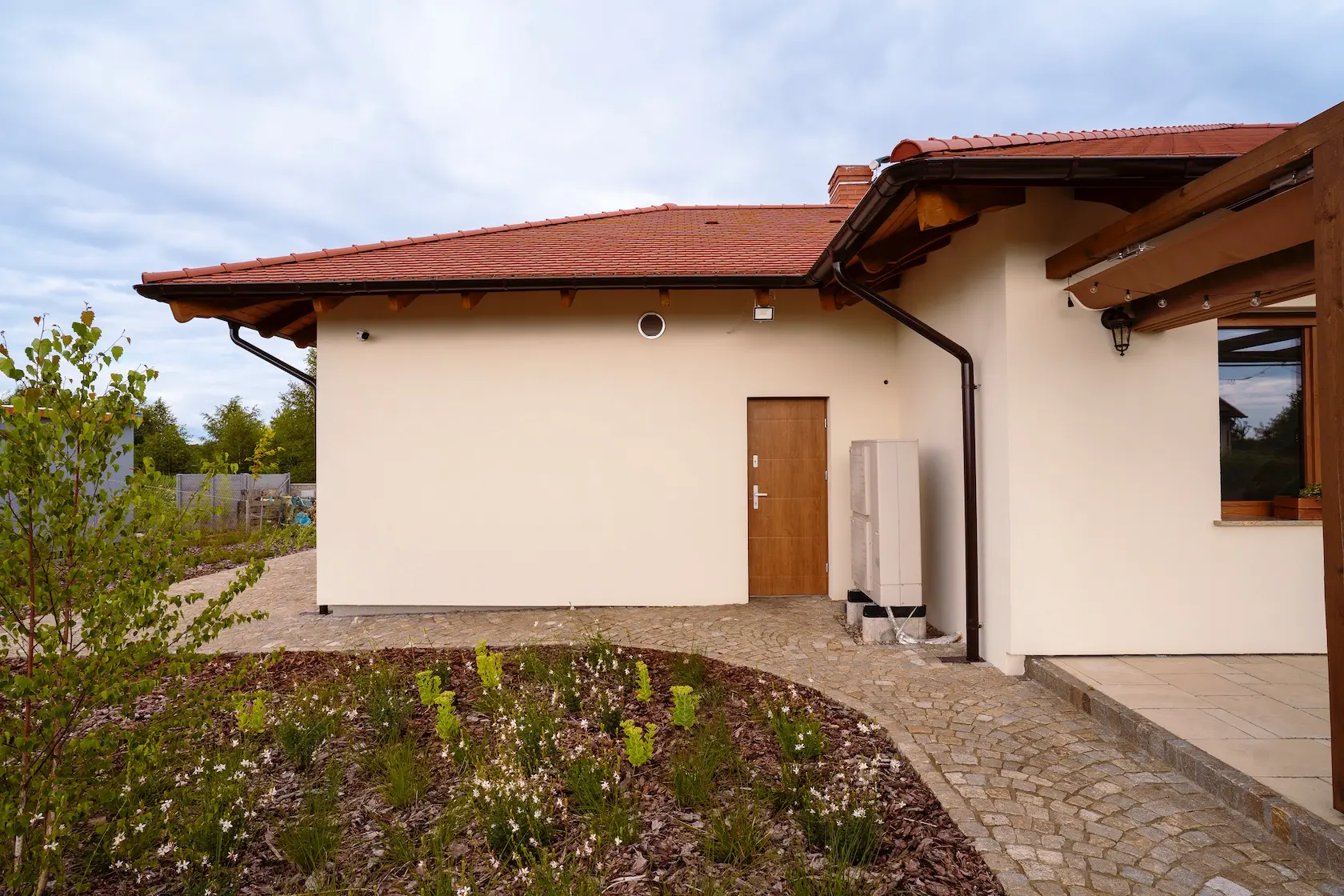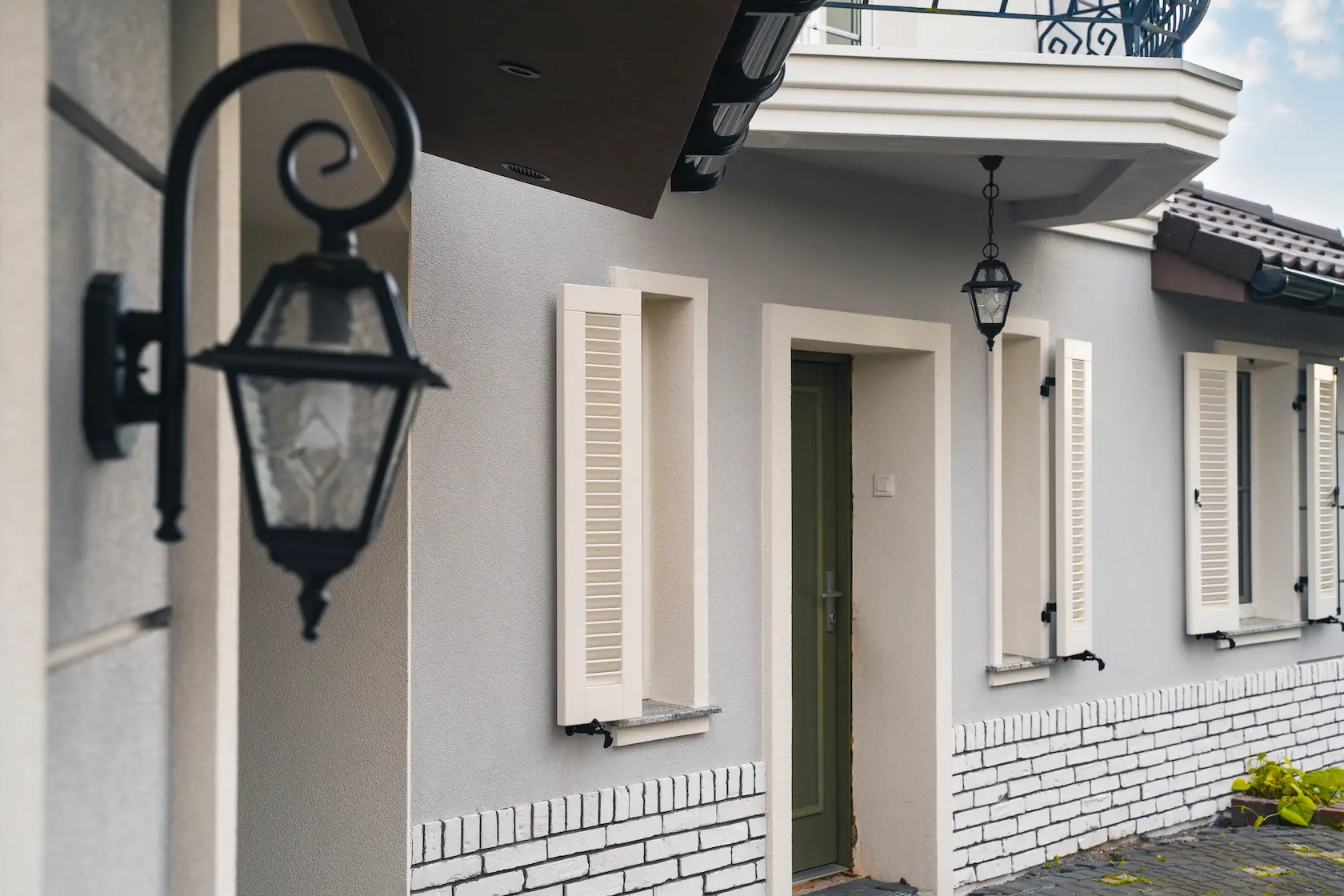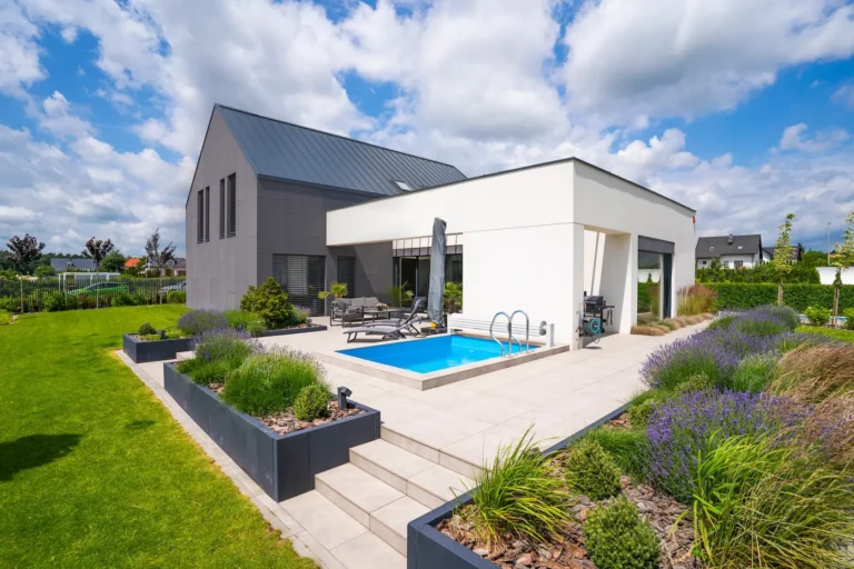 wykończenie tradycyjne: wykorzystanie strukturalnych tynków silikonowych oferuje doskonałą ochronę przed czynnikami zewnętrznymi oraz estetykę, w połączeniu z listwami do boniowania, które dodają elewacji geometrycznej elegancji.