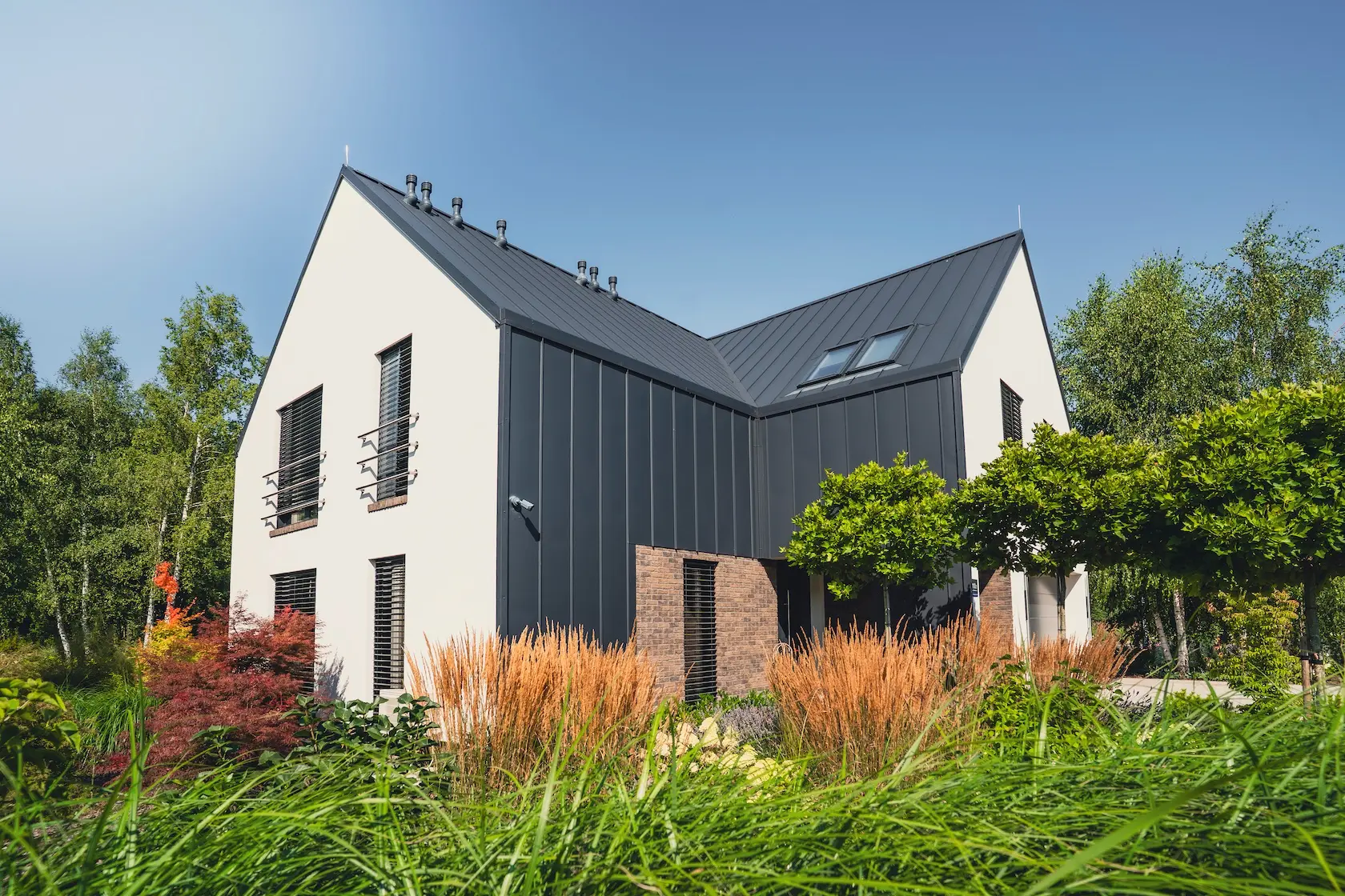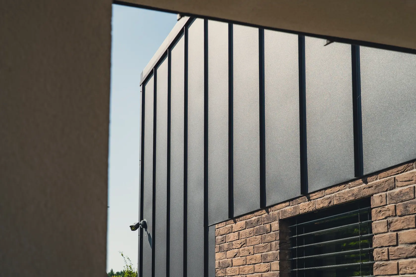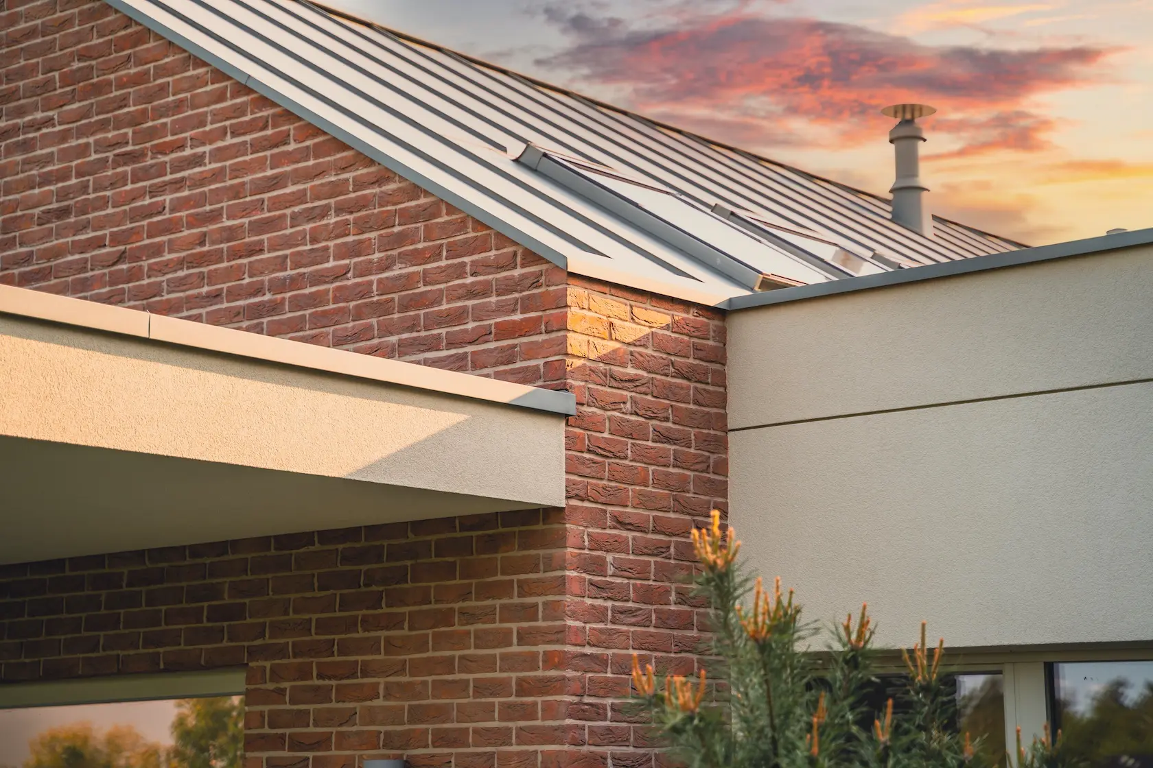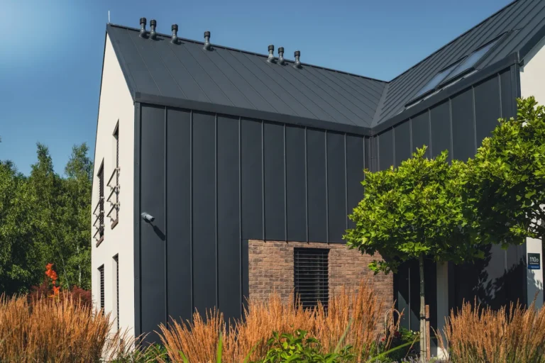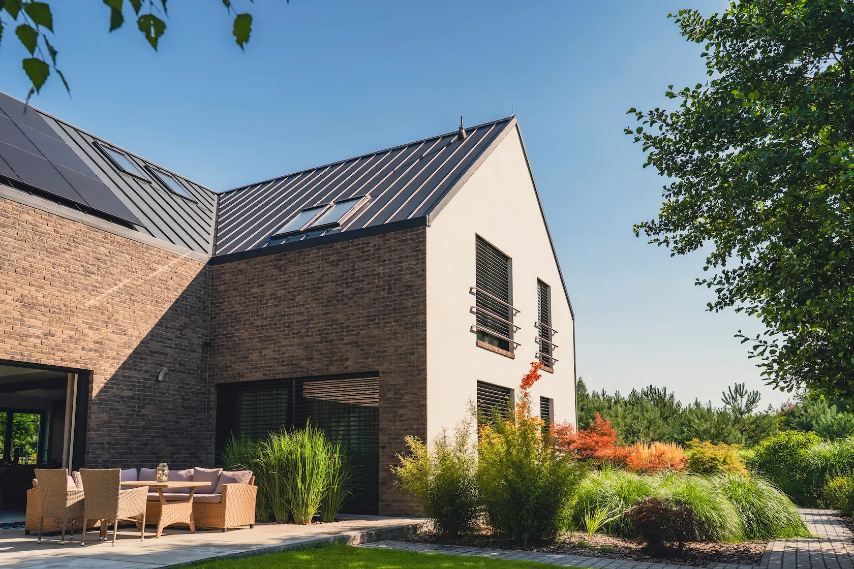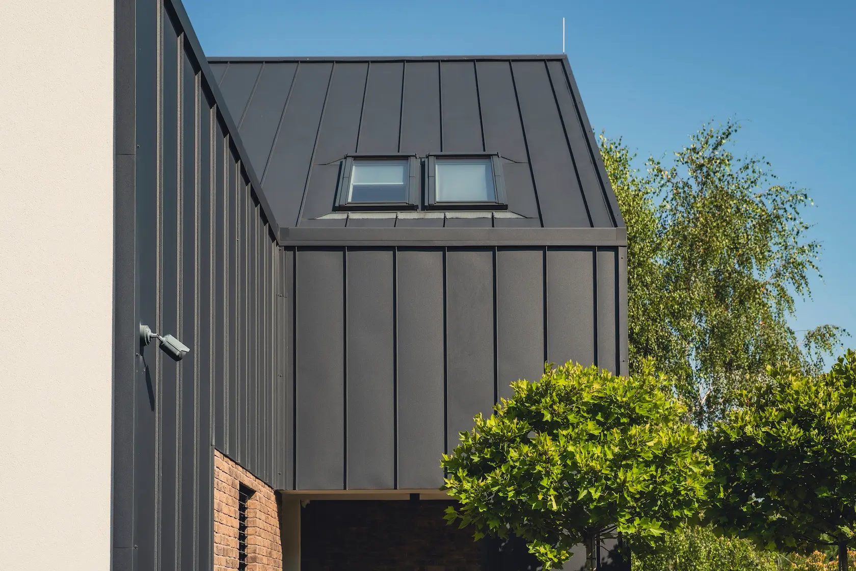 akcent nowoczesny: zastosowanie elewacji wentylowanej z blachy na rąbek (system Prefa) wprowadza nowoczesny, minimalistyczny i bezobsługowy akcent, przełamujący fakturę cegły i tynku.