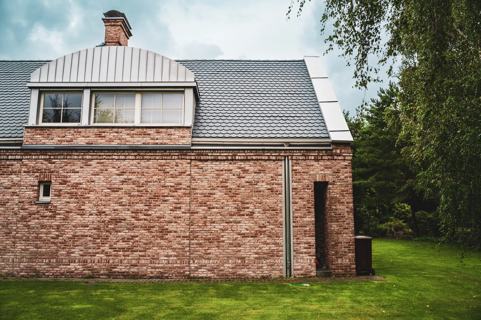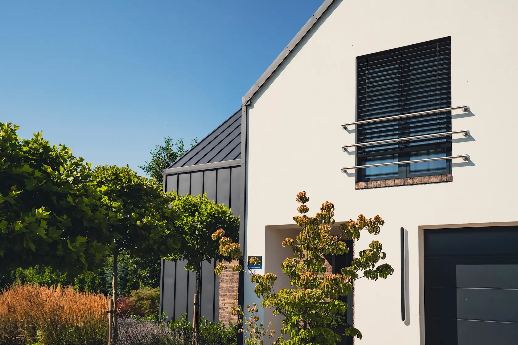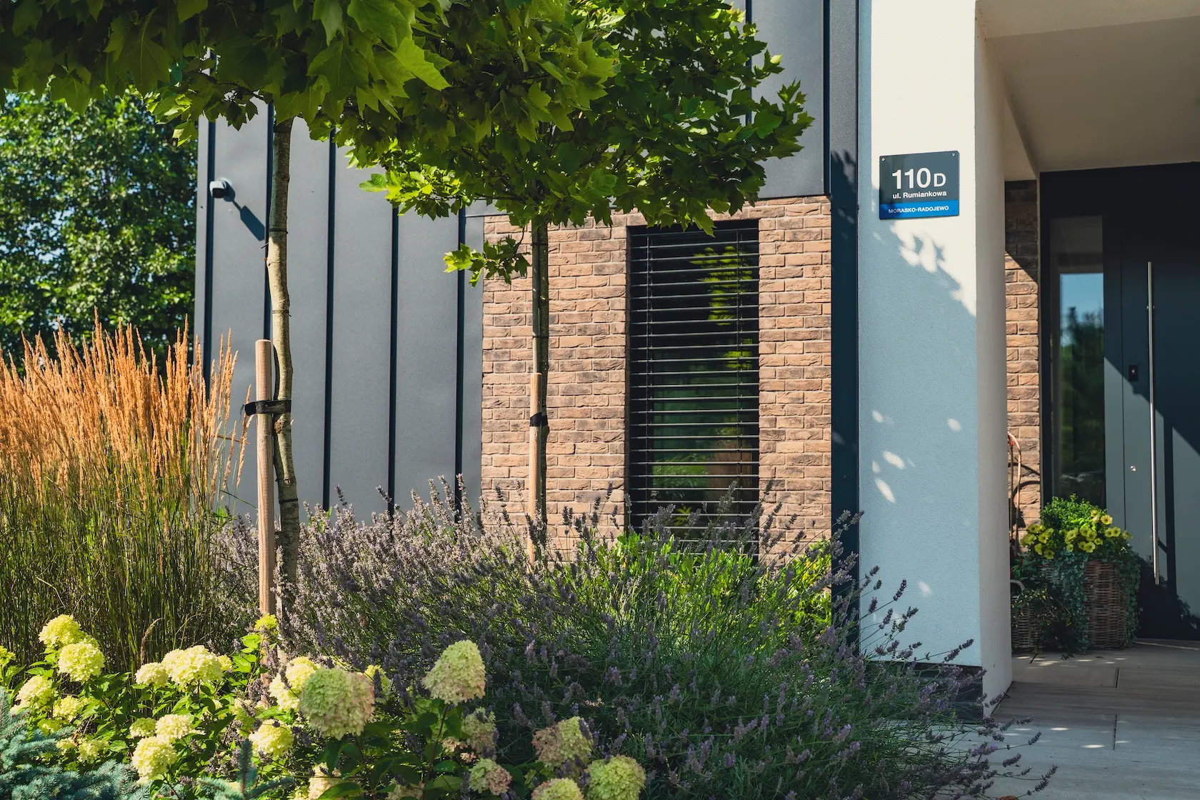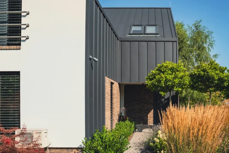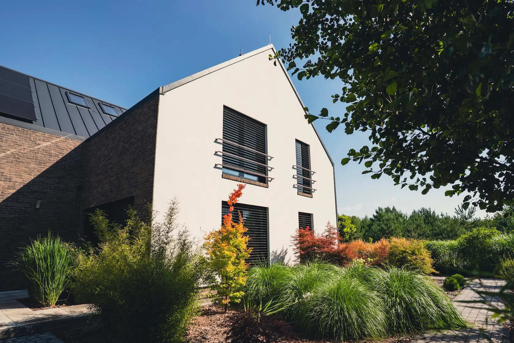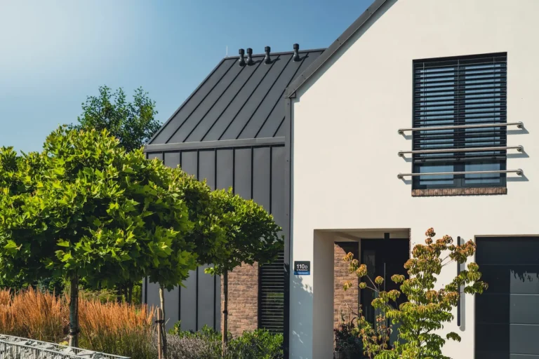 akcent nowoczesny: zastosowanie elewacji wentylowanej z blachy na rąbek (system Prefa) wprowadza nowoczesny, minimalistyczny i bezobsługowy akcent, przełamujący fakturę cegły i tynku.
