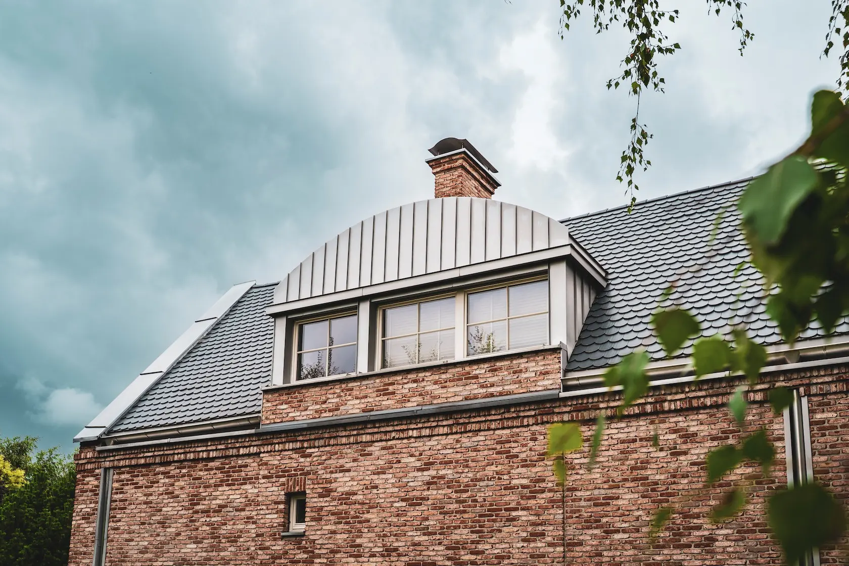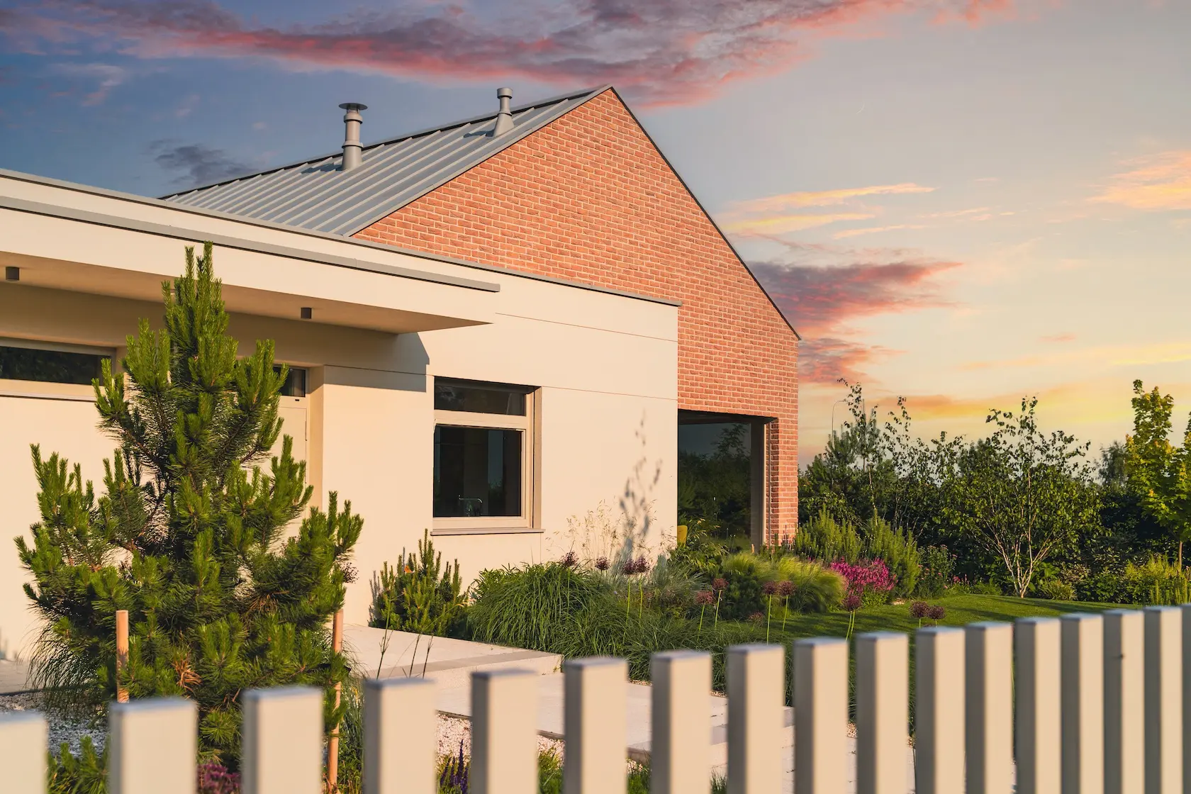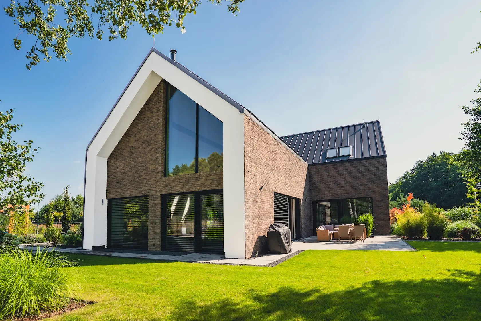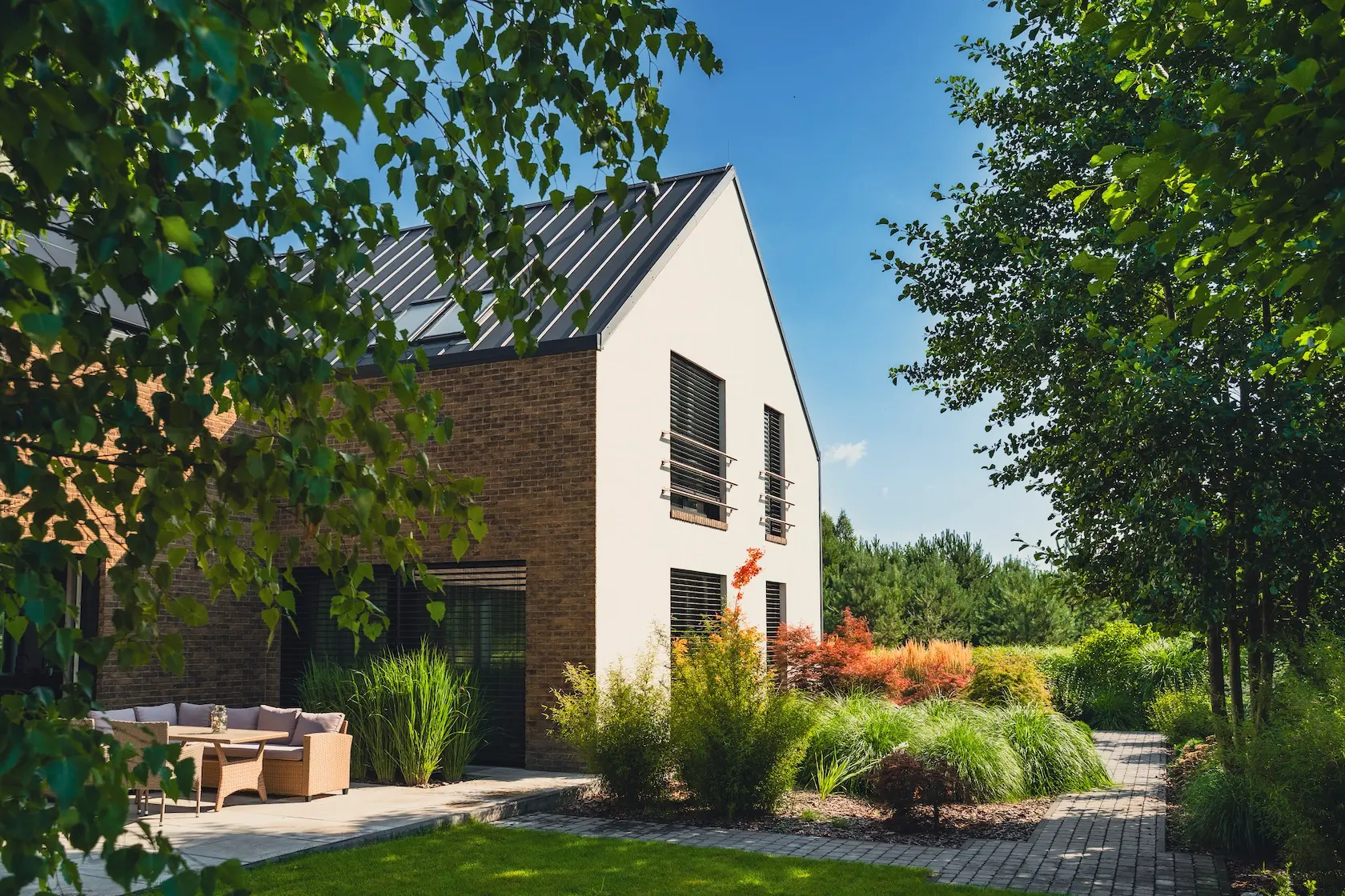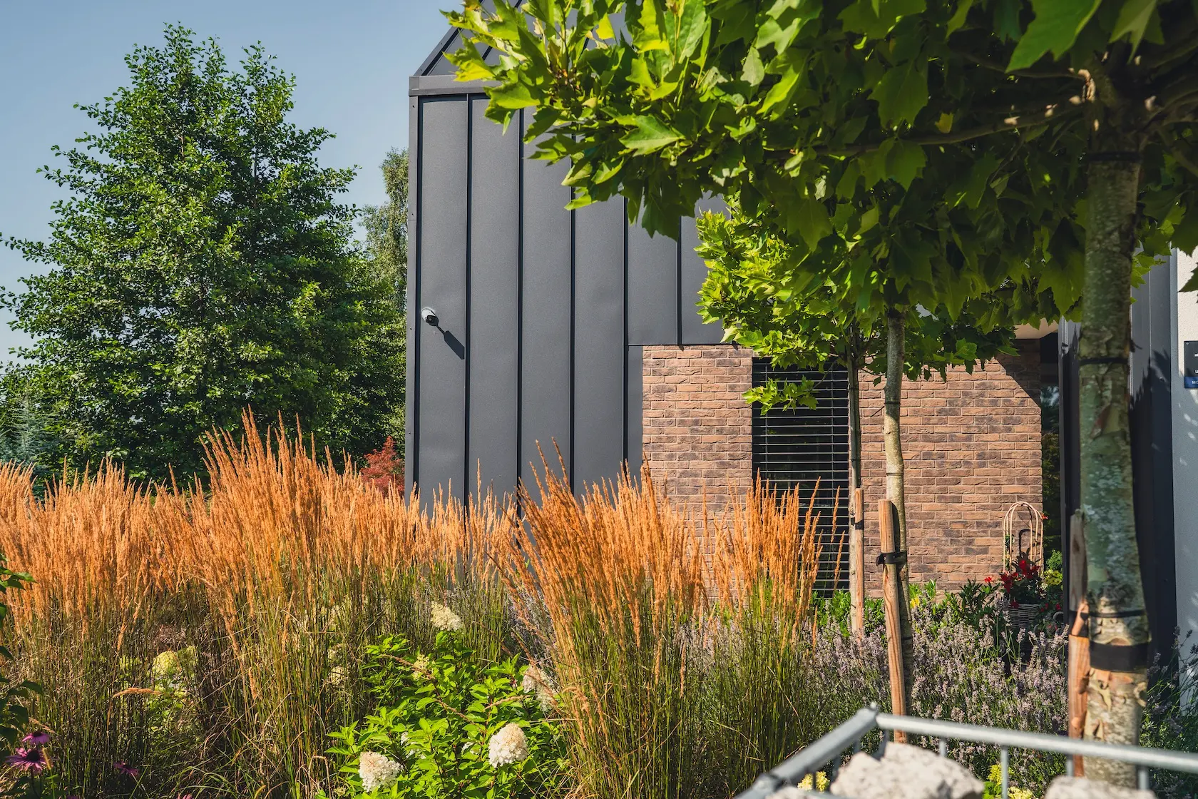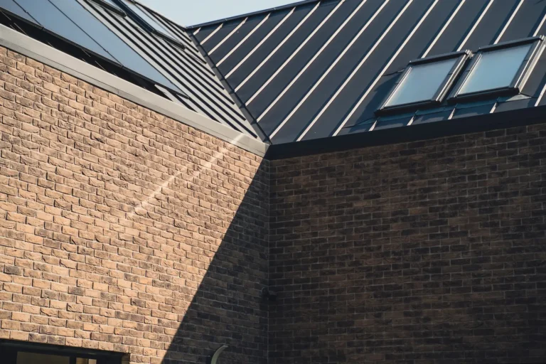 akcent nowoczesny: zastosowanie elewacji wentylowanej z blachy na rąbek (system Prefa) wprowadza nowoczesny, minimalistyczny i bezobsługowy akcent, przełamujący fakturę cegły i tynku.