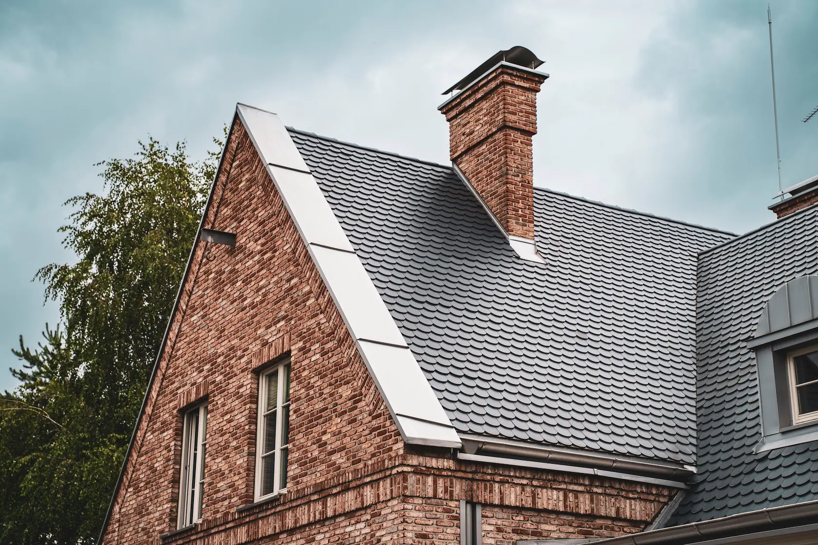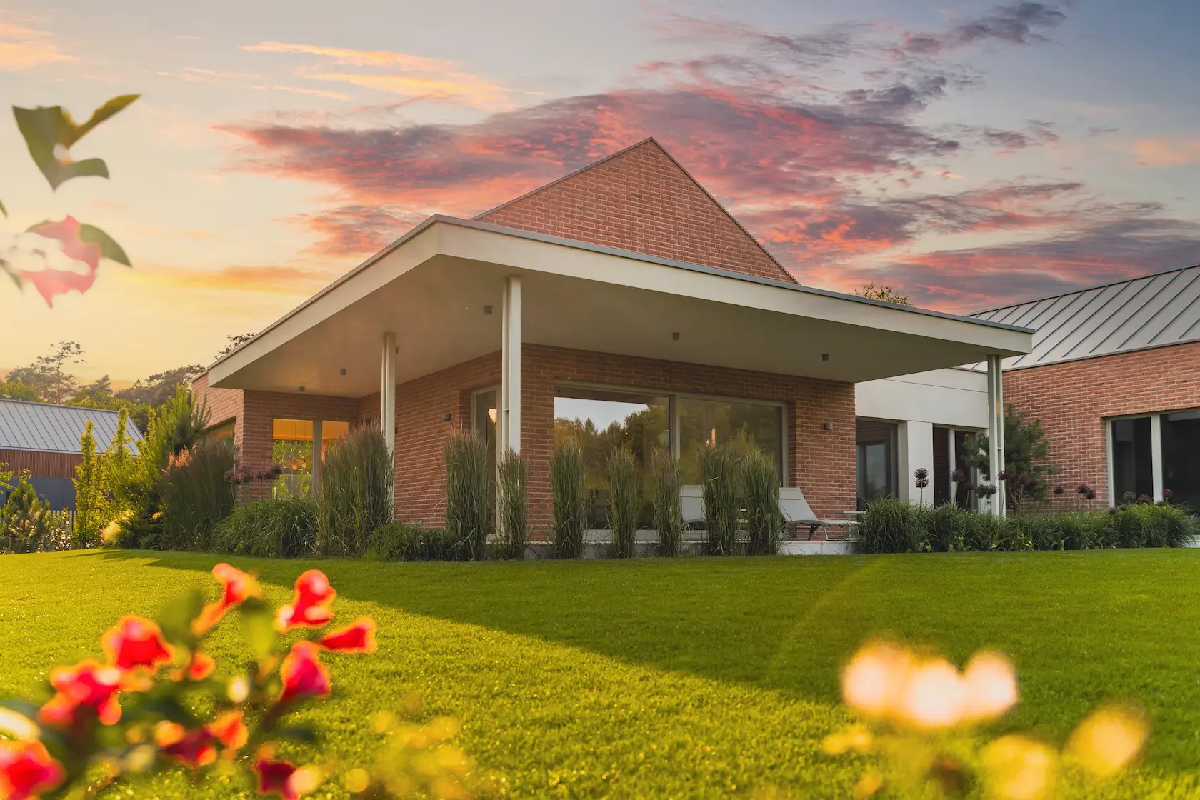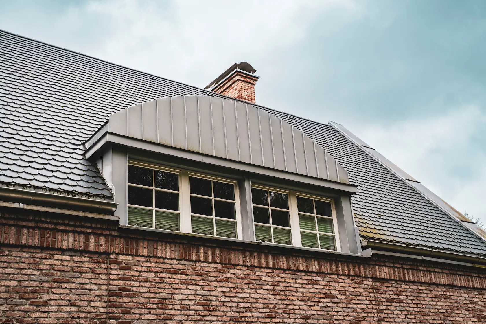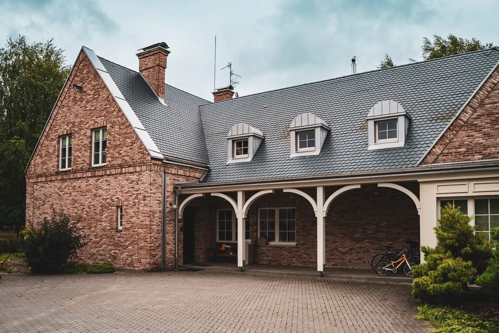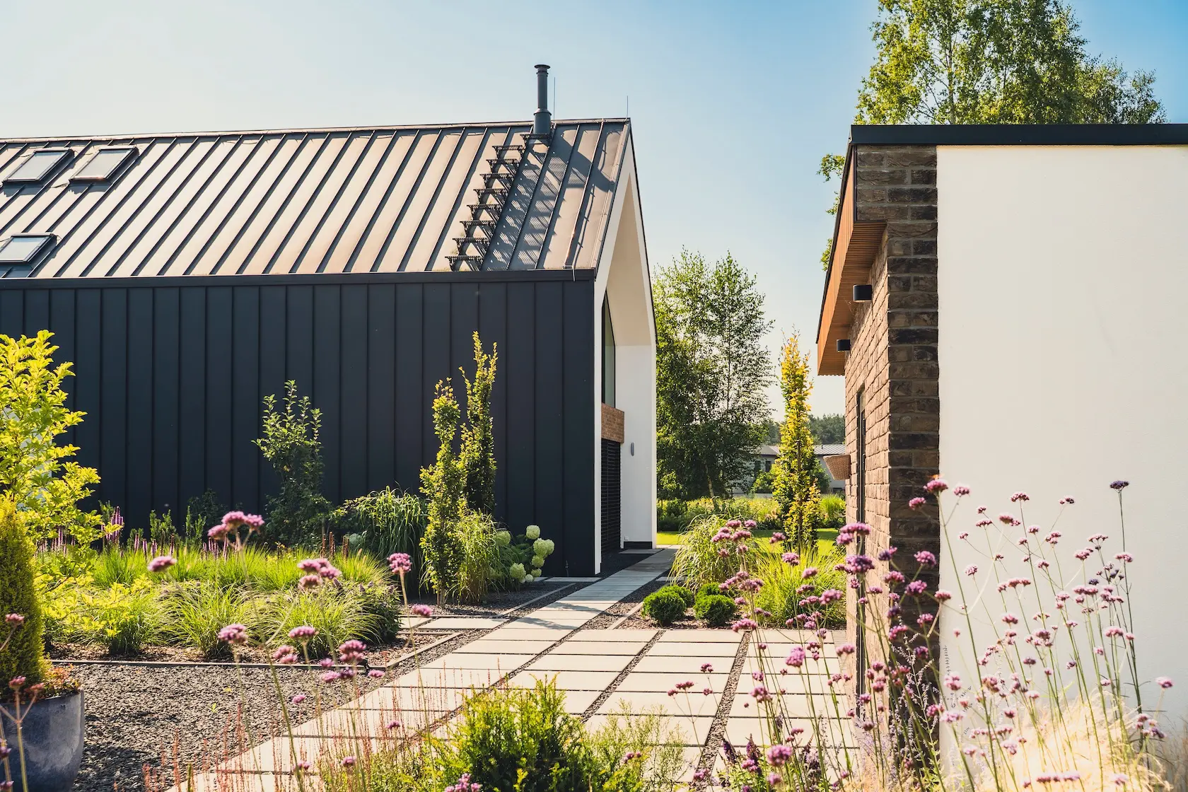 akcent nowoczesny: zastosowanie elewacji wentylowanej z blachy na rąbek (system Prefa) wprowadza nowoczesny, minimalistyczny i bezobsługowy akcent, przełamujący fakturę cegły i tynku.