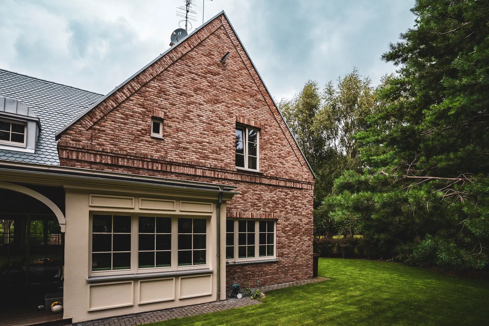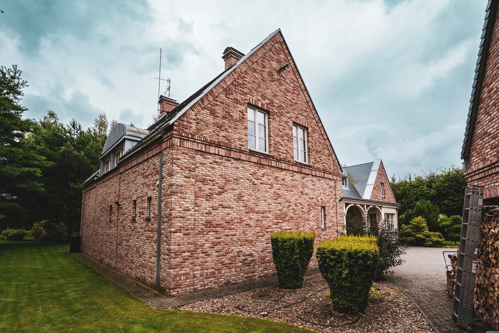 cegła prestiżowa: wybrane partie wykończono cegłą licową ręcznie formowaną Vandersanden. Jest to materiał ceniony za autentyczny, nieregularny charakter i trwałość, nadający elewacji klasyczny, lecz luksusowy wygląd,