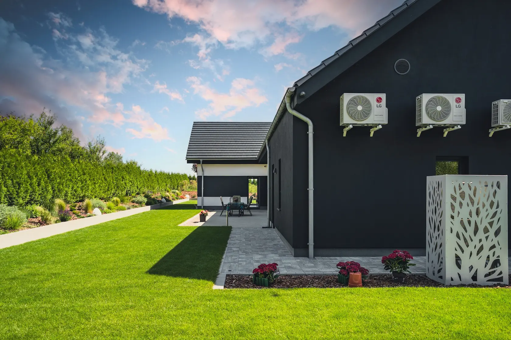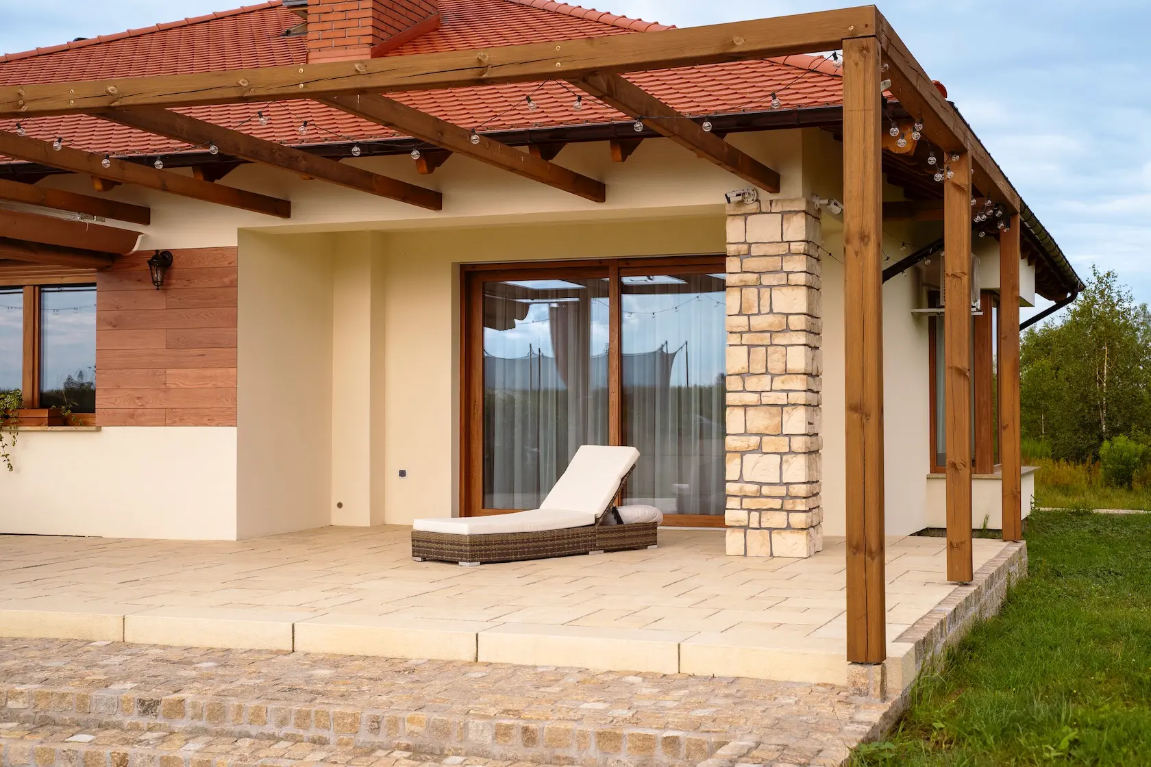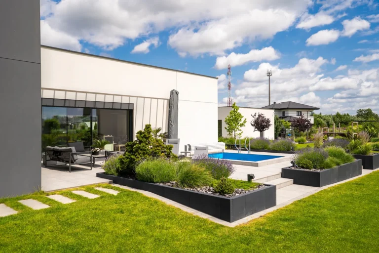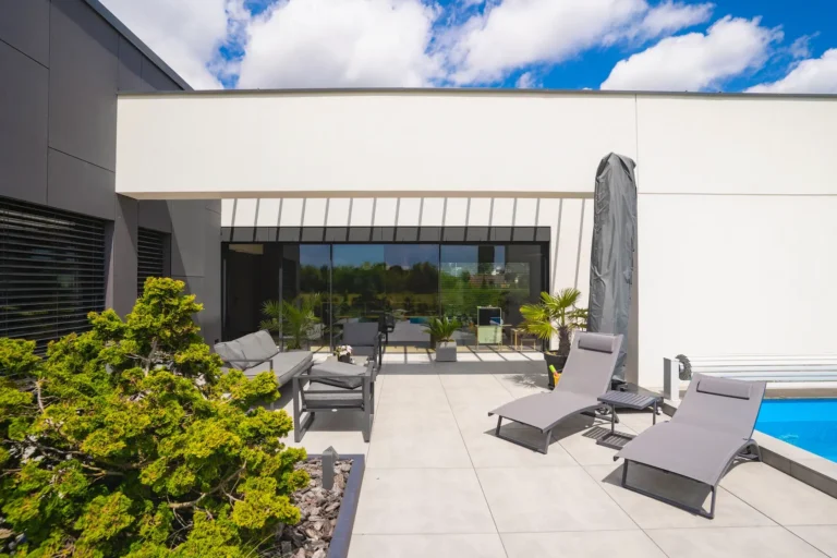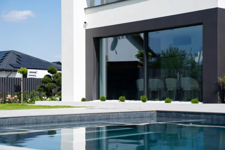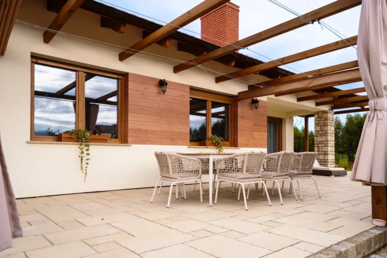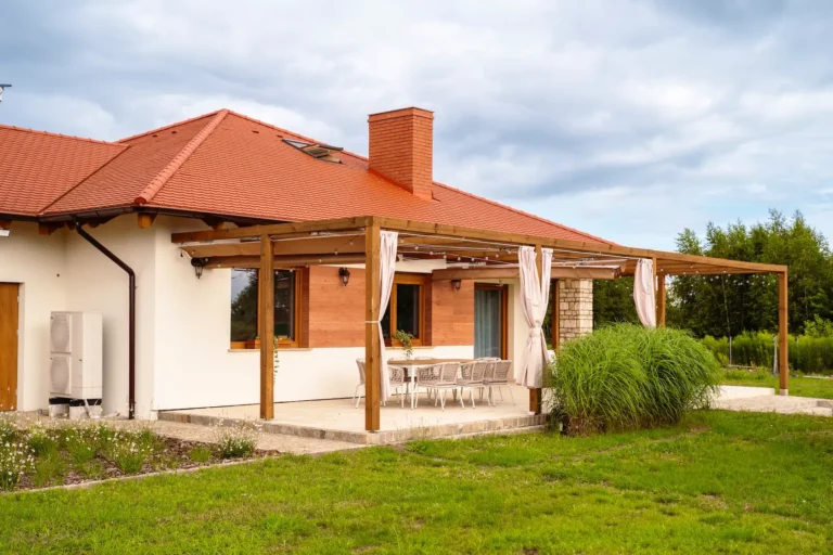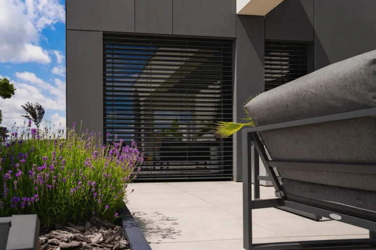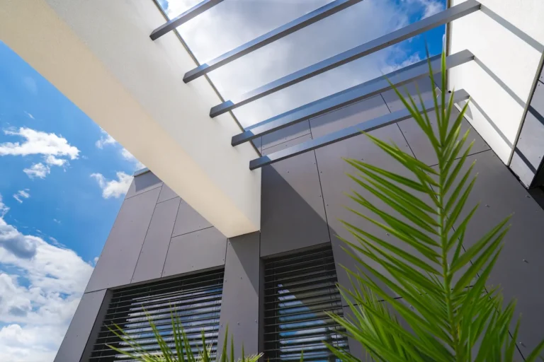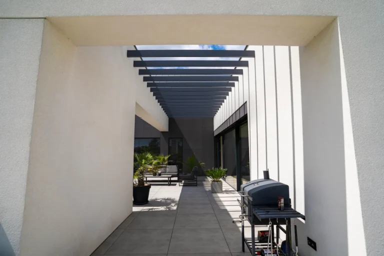 aluminiowe wiązary dekoracyjne służące jako konstrukcja pergoli – elegancki i funkcjonalny akcent, który integruje architekturę z przestrzenią zewnętrzną,