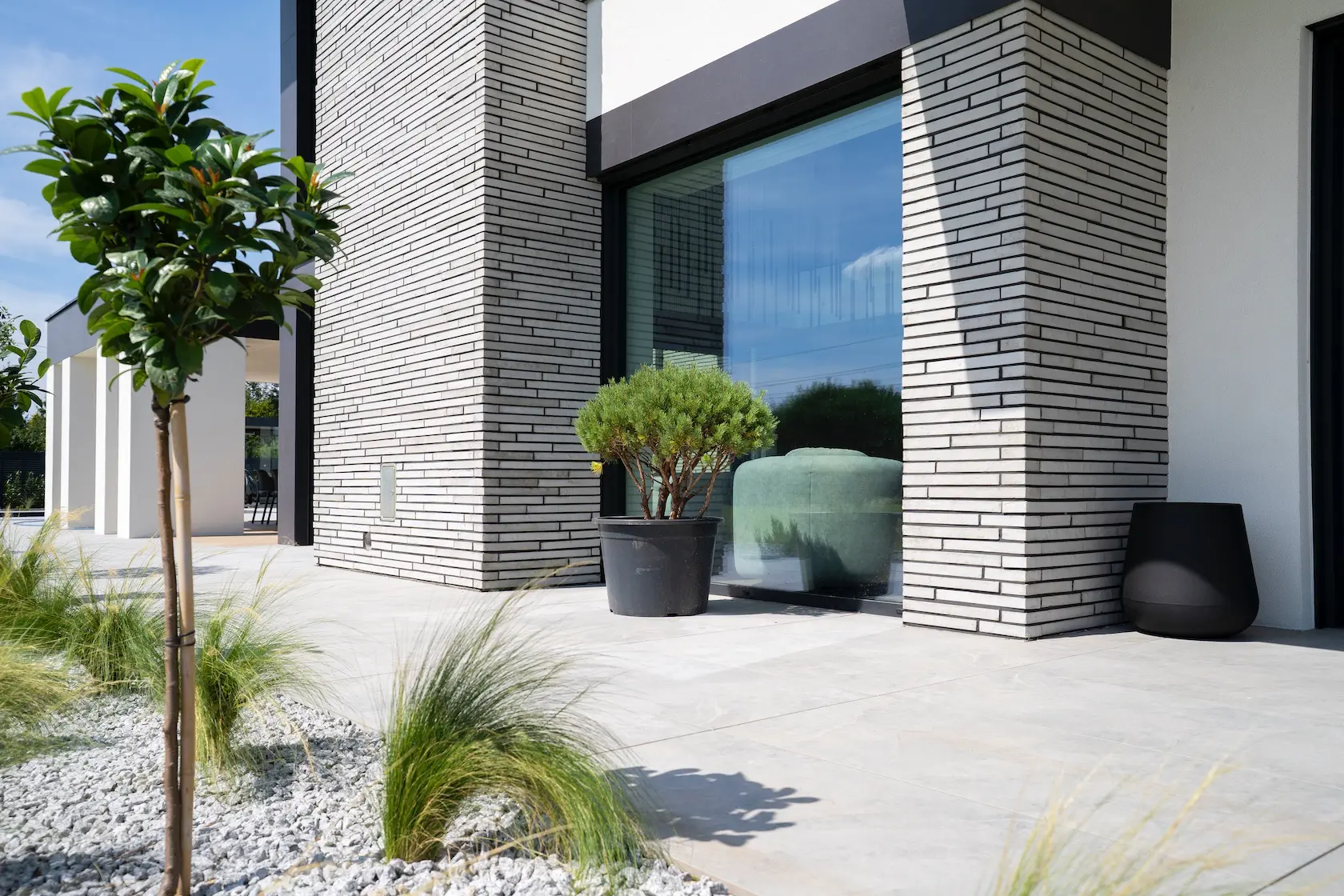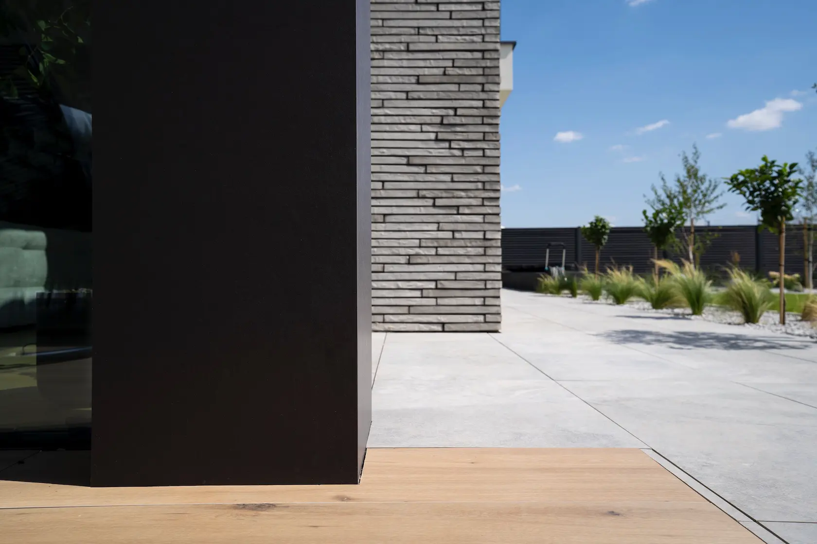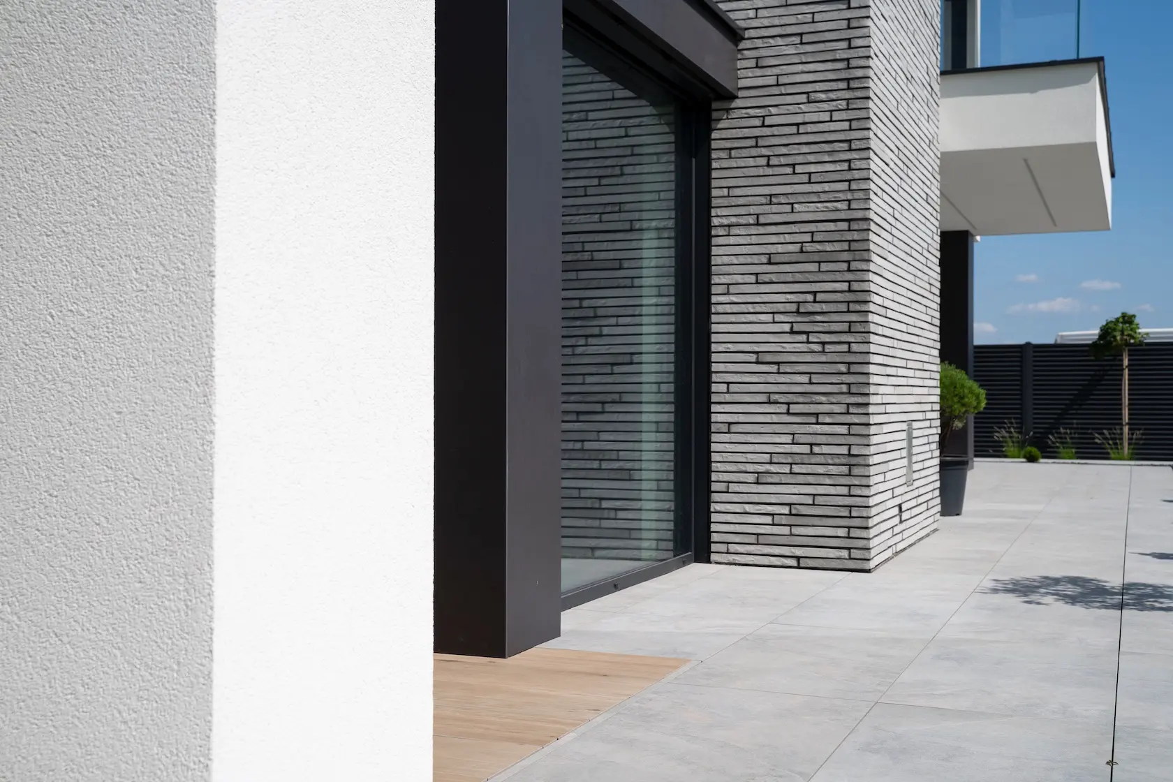 nowoczesna okładzina: wybrane partie elewacji wykończono spiekami kwarcowymi klejonymi Tubądzin. Materiał ten charakteryzuje się dużą odpornością, minimalną nasiąkliwością i nowoczesnym, wielkoformatowym wyglądem,