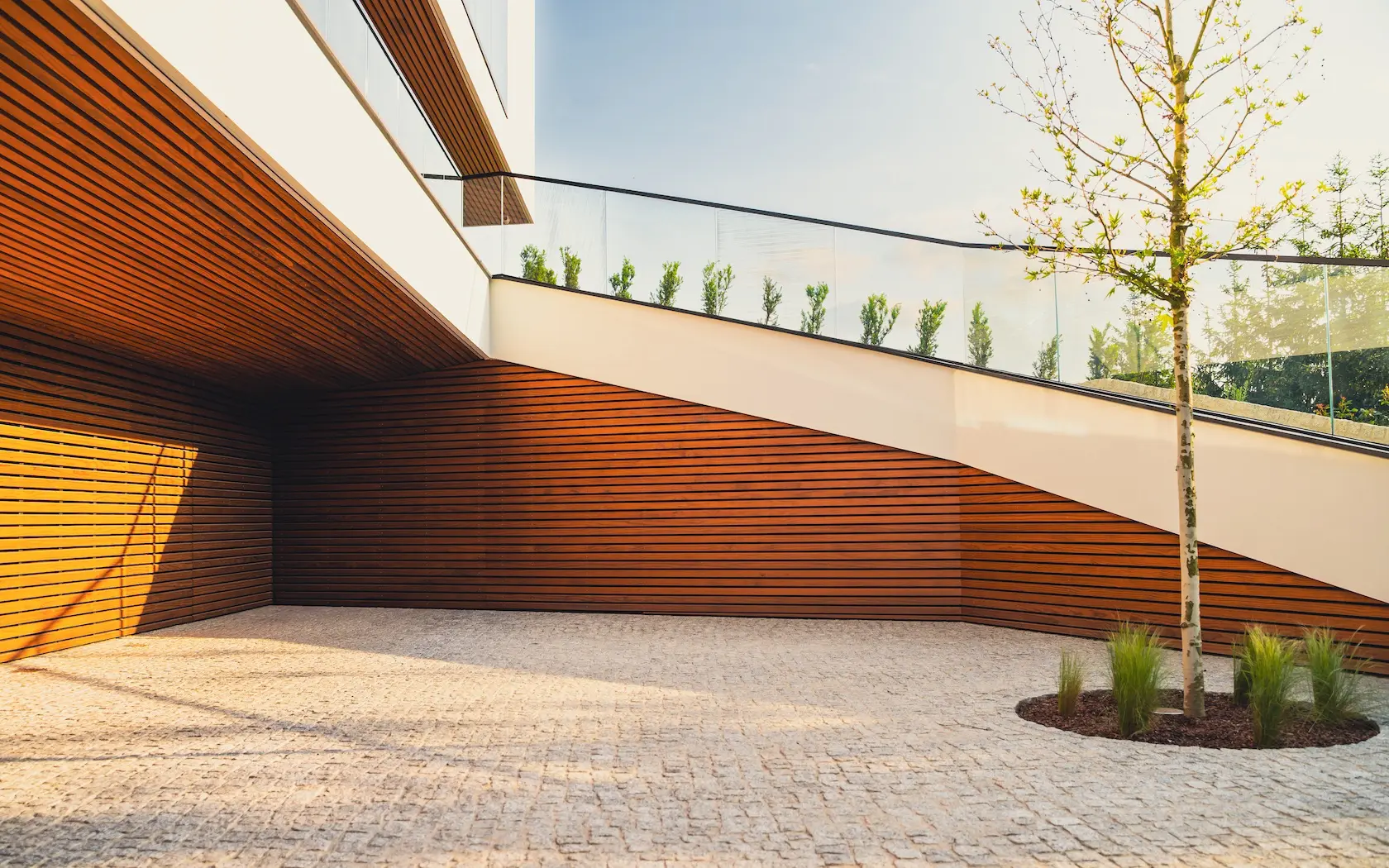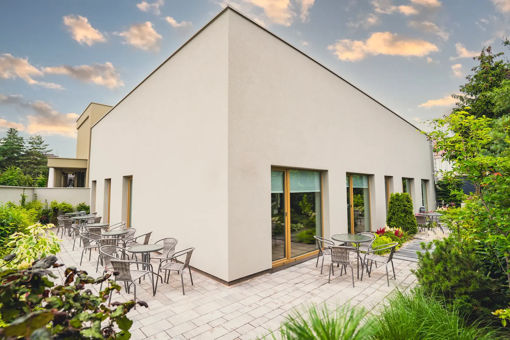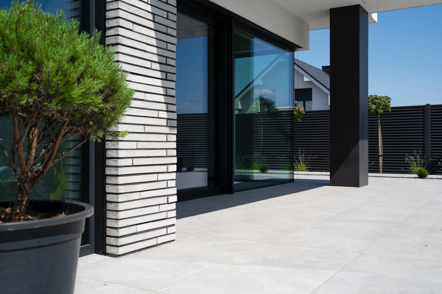 nowoczesna okładzina: wybrane partie elewacji wykończono spiekami kwarcowymi klejonymi Tubądzin. Materiał ten charakteryzuje się dużą odpornością, minimalną nasiąkliwością i nowoczesnym, wielkoformatowym wyglądem,