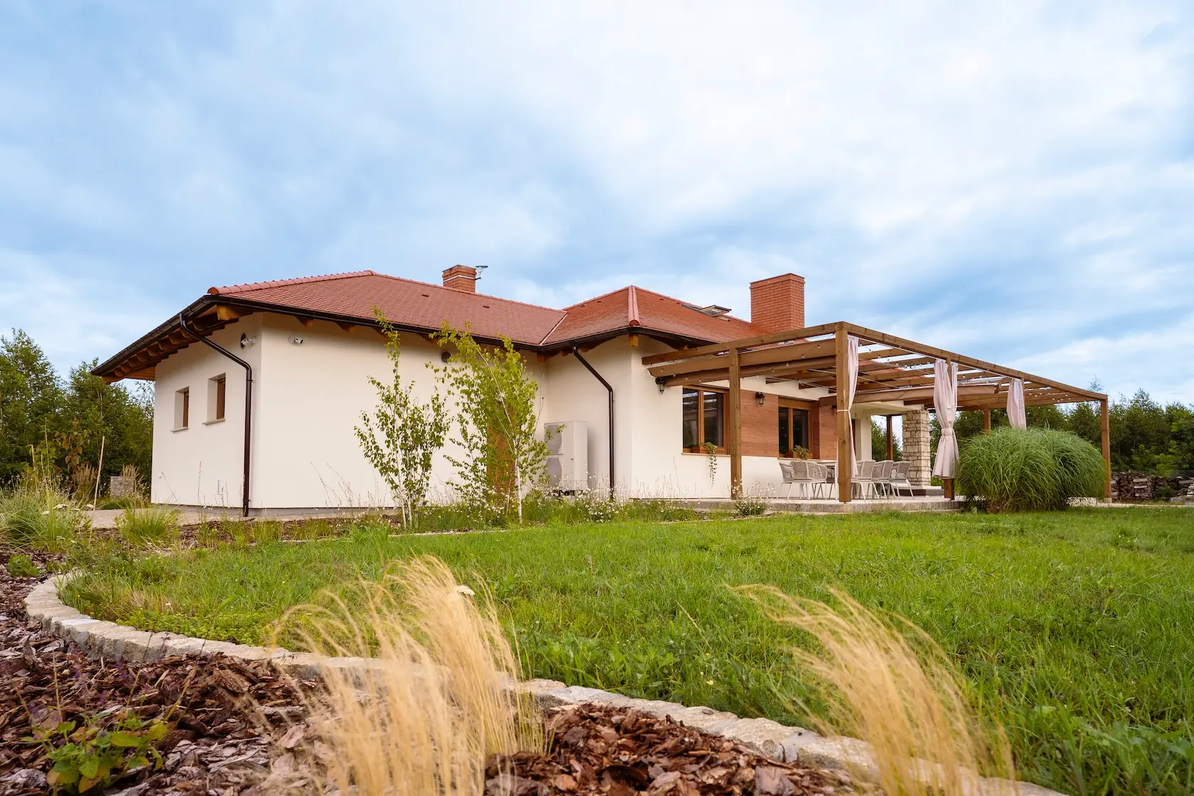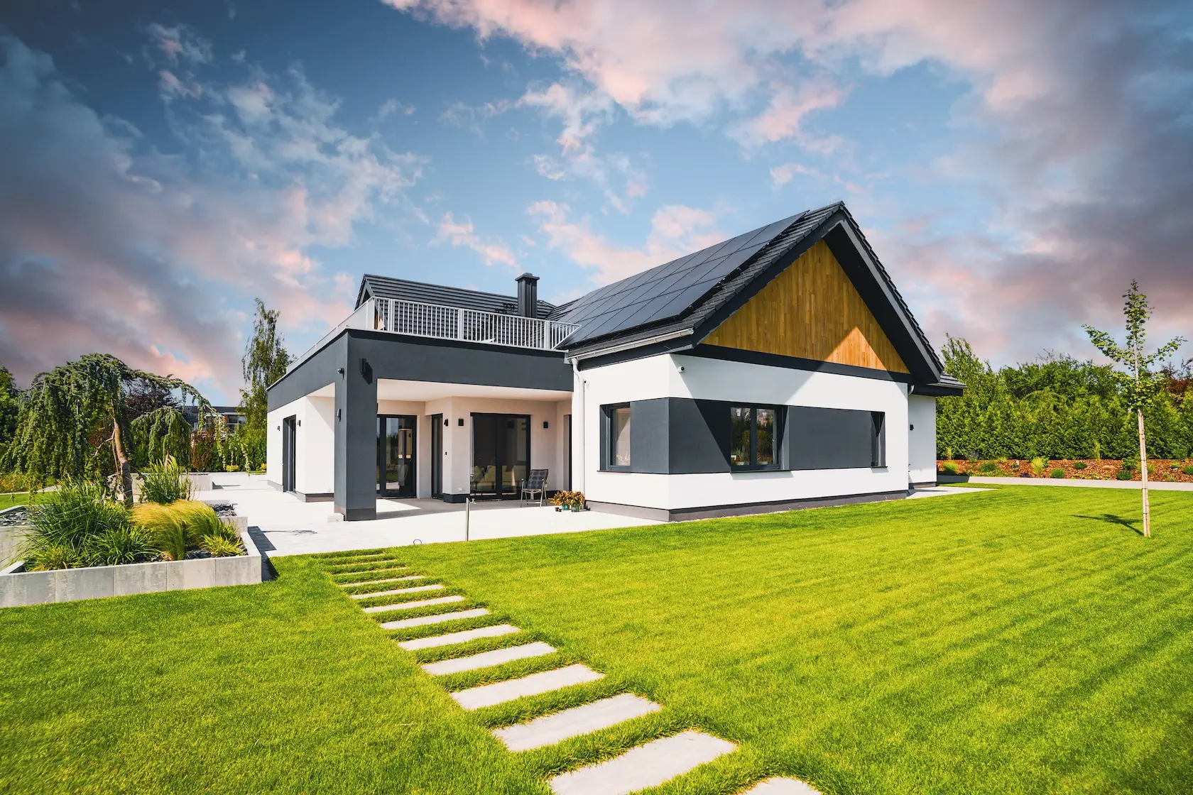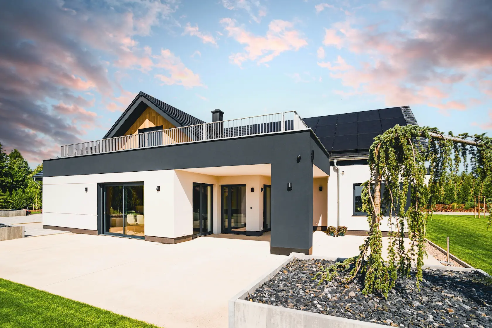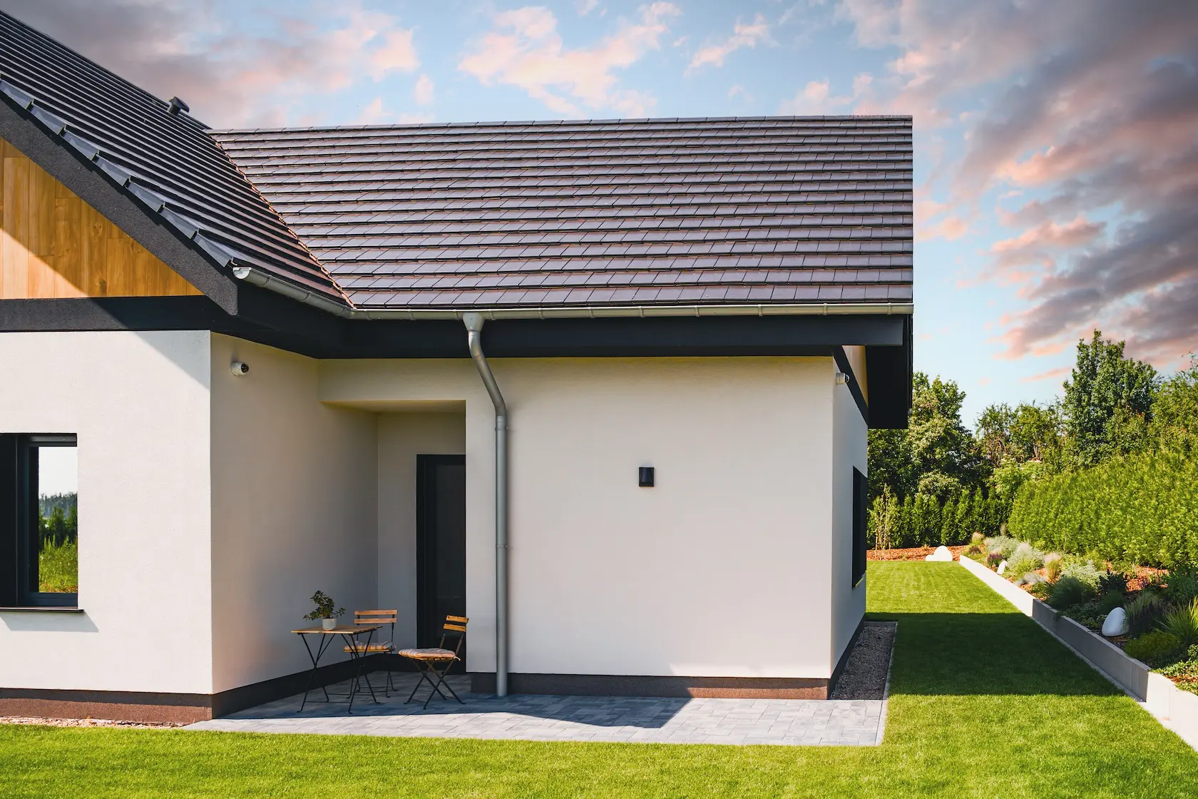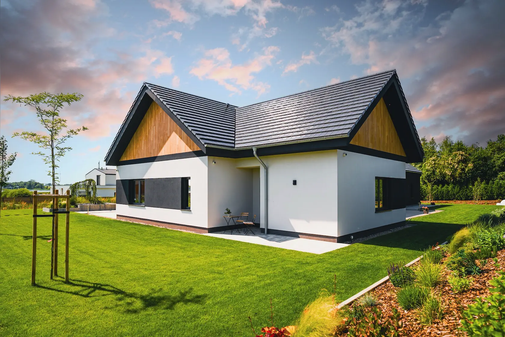 Projekt łączy zaawansowaną izolację termiczną w systemie ETICS STO z prestiżowym, naturalnym wykończeniem z drewna modyfikowanego termicznie (Thermory).