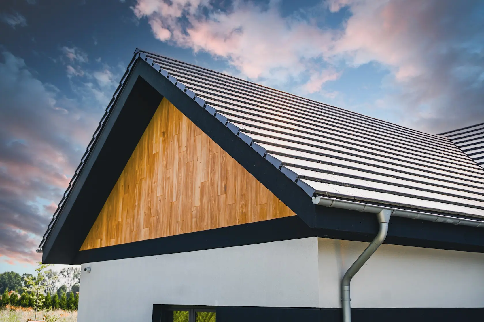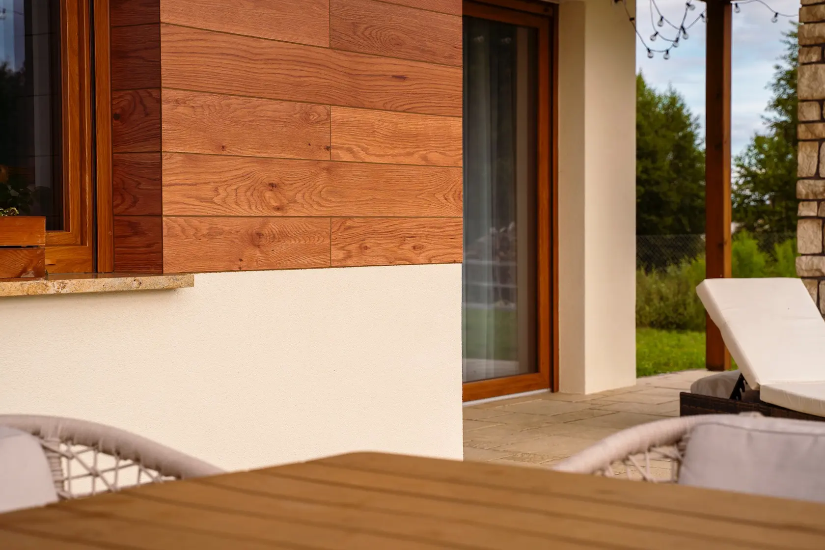 akcenty drewniane: wykorzystano okładzinę z elastycznej deski elewacyjnej Rodeo-DR, która wiernie imituje strukturę drewna, wprowadzając ciepły, naturalny akcent bez konieczności konserwacji,