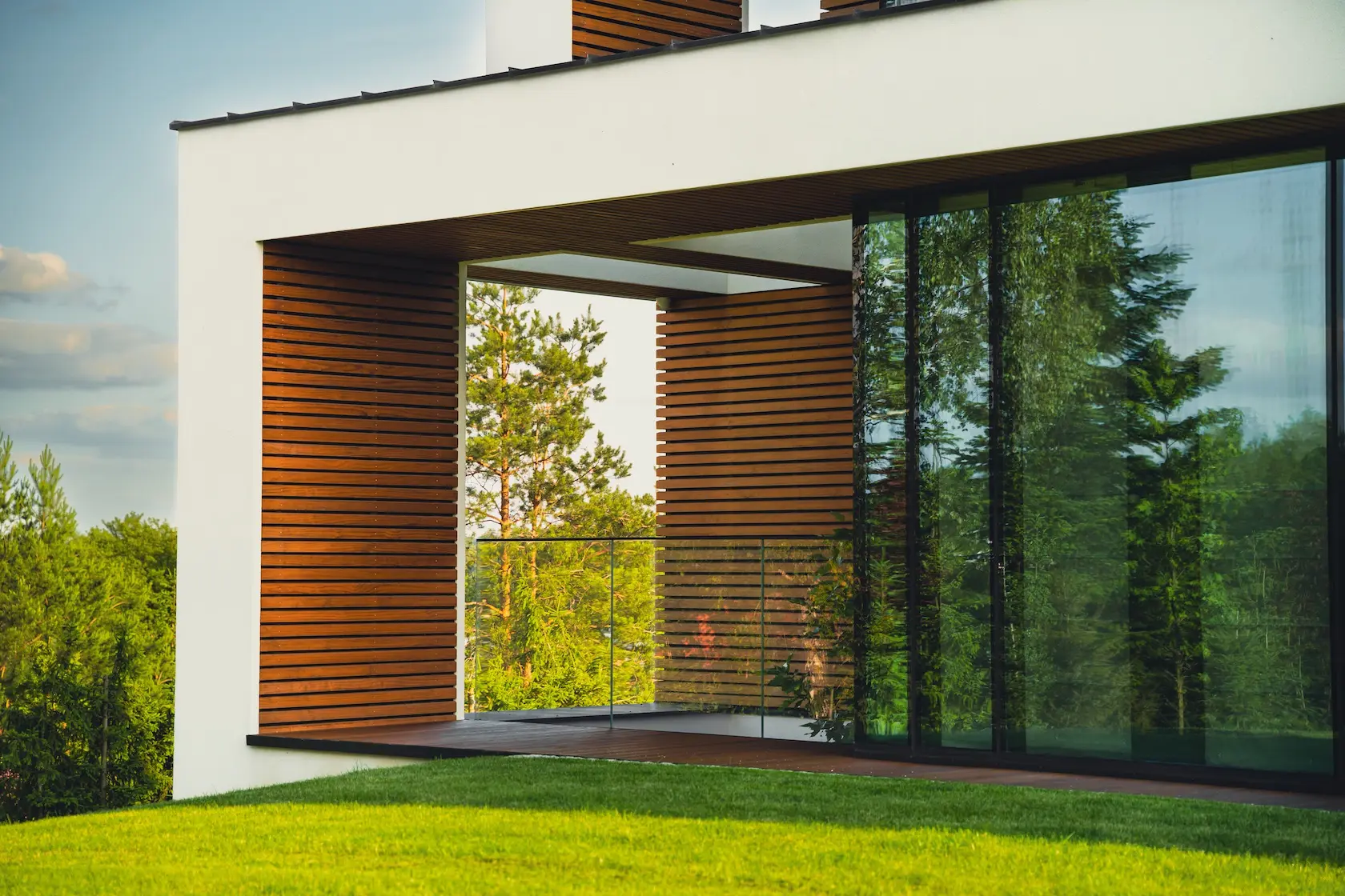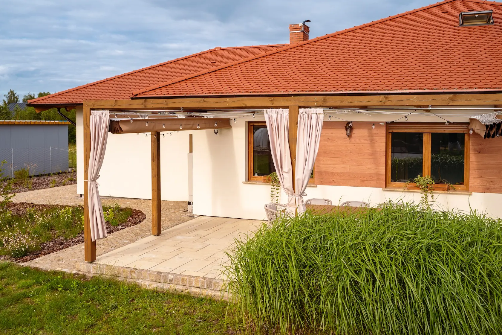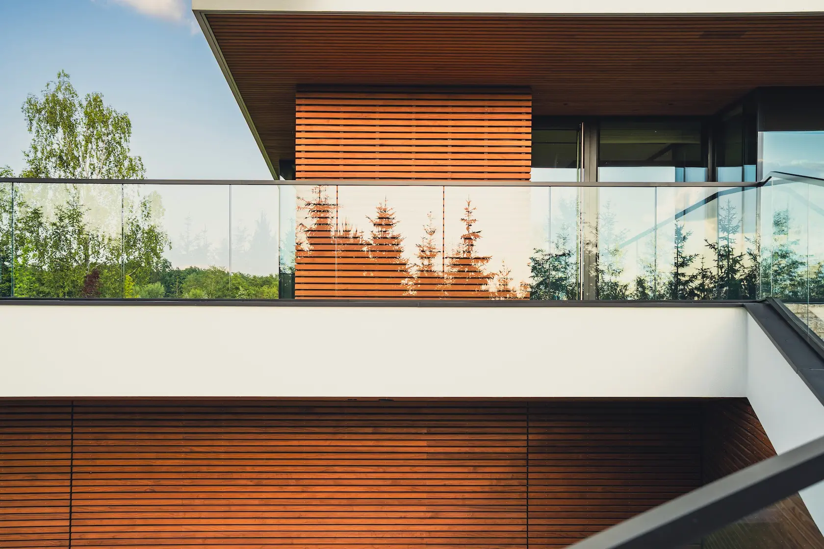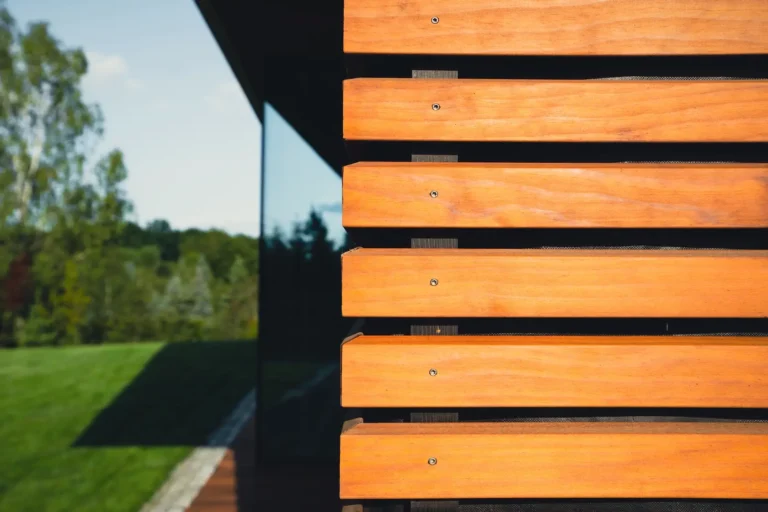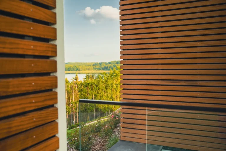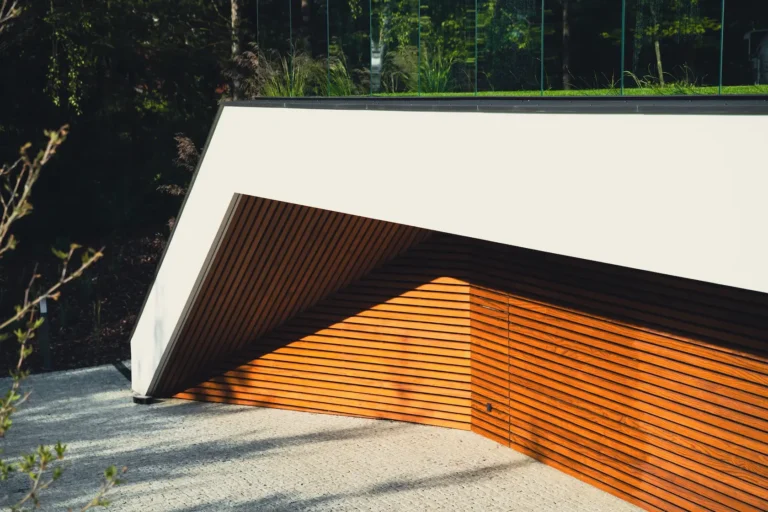 W projekcie konsekwentnie wykorzystano drewno modyfikowane termicznie Thermory, co zapewnia jego wysoką stabilność, trwałość i odporność na warunki atmosferyczne bez konieczności stosowania chemicznej impregnacji: